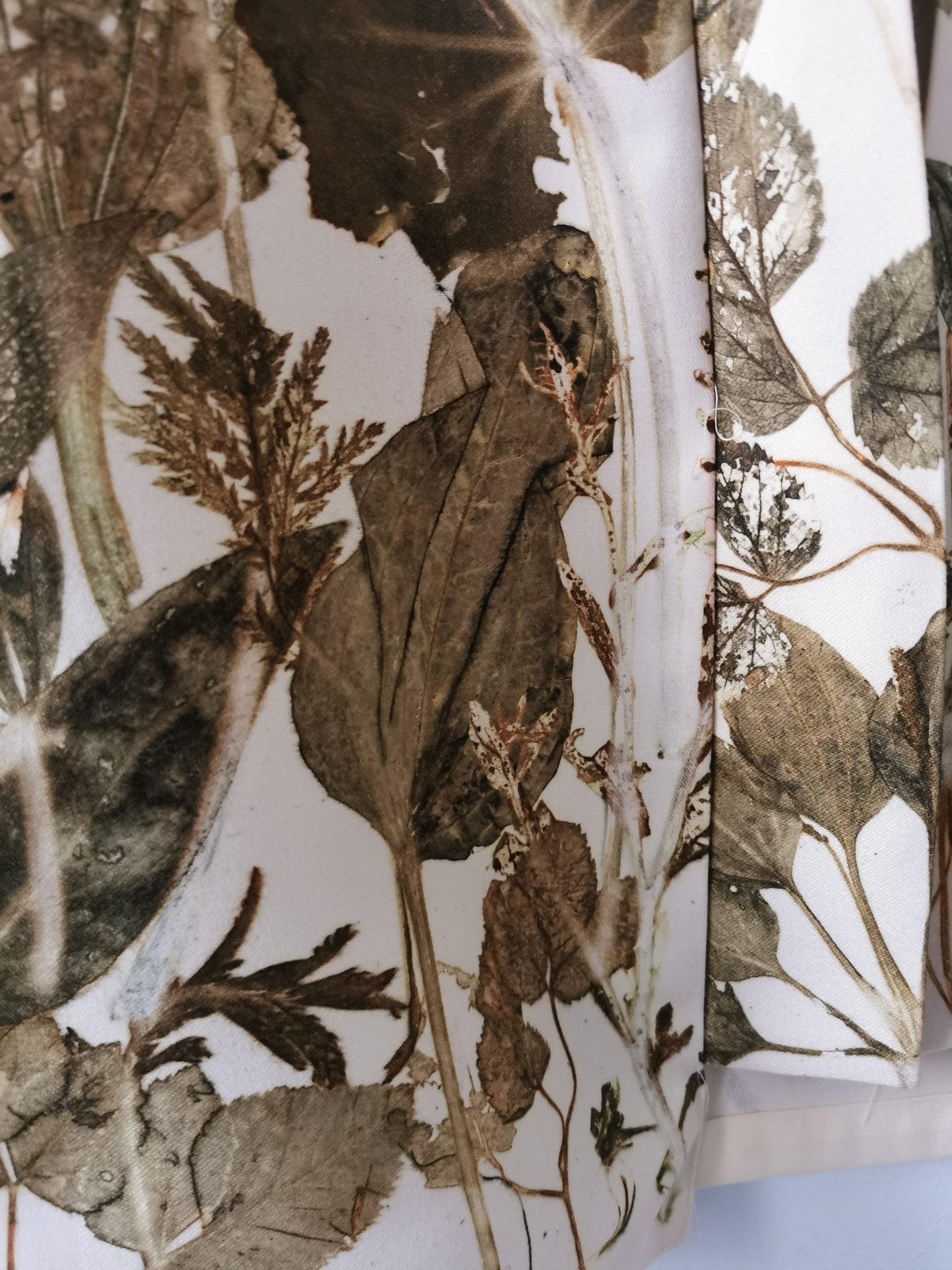 The textile is handprinted by Nathalie Gaia Dahl, who has collected local plants from the city space.