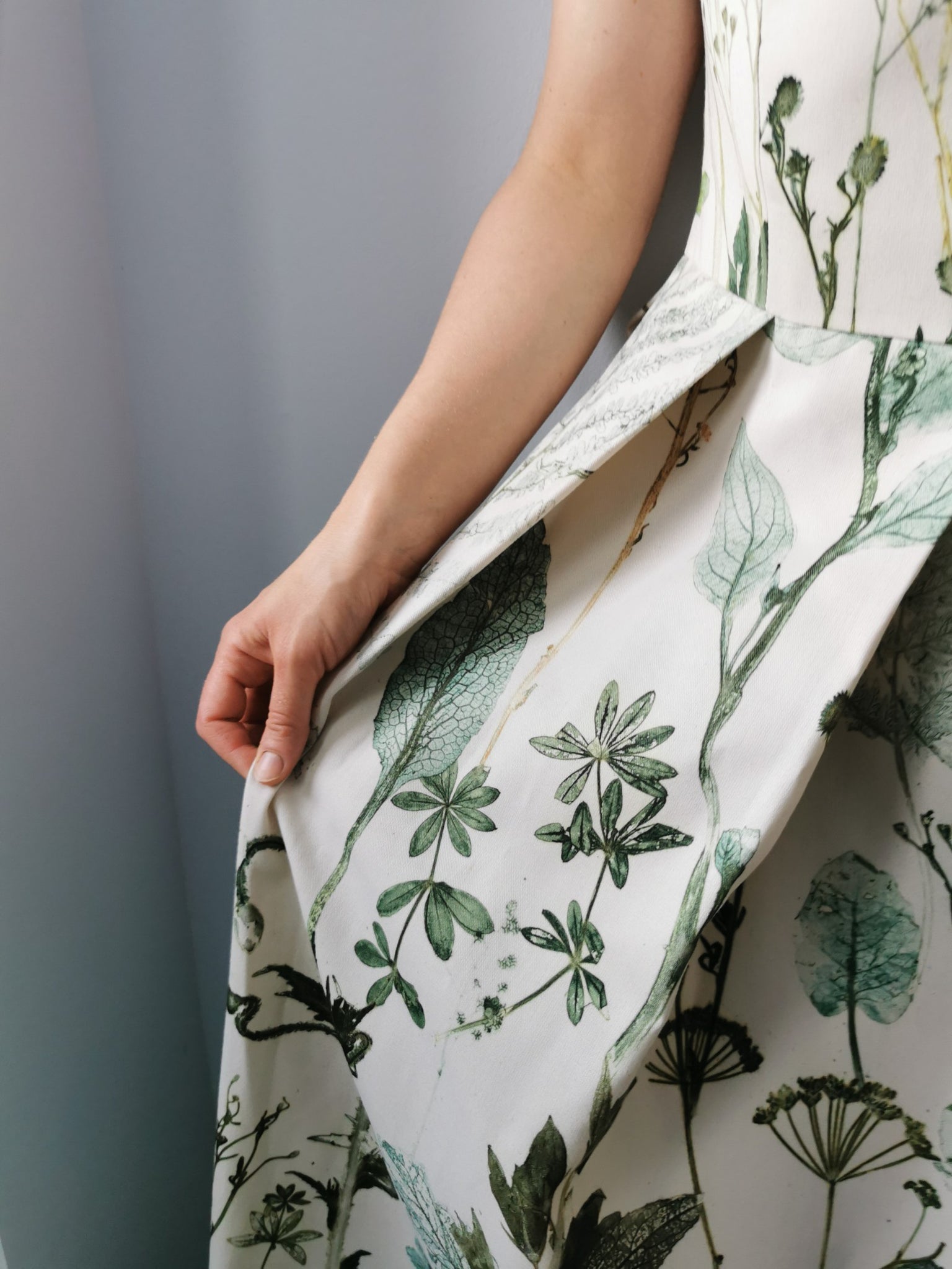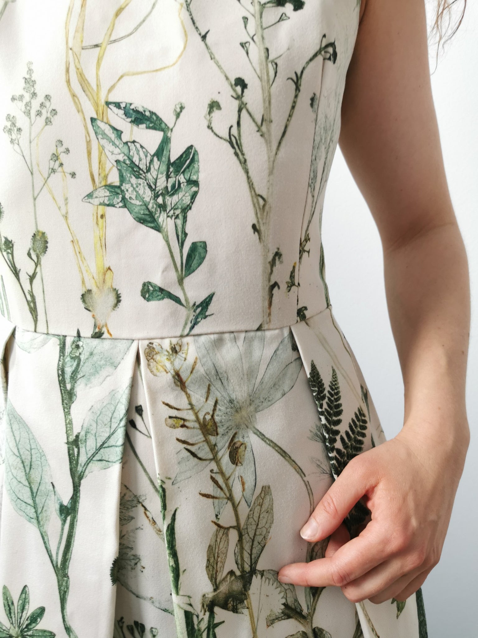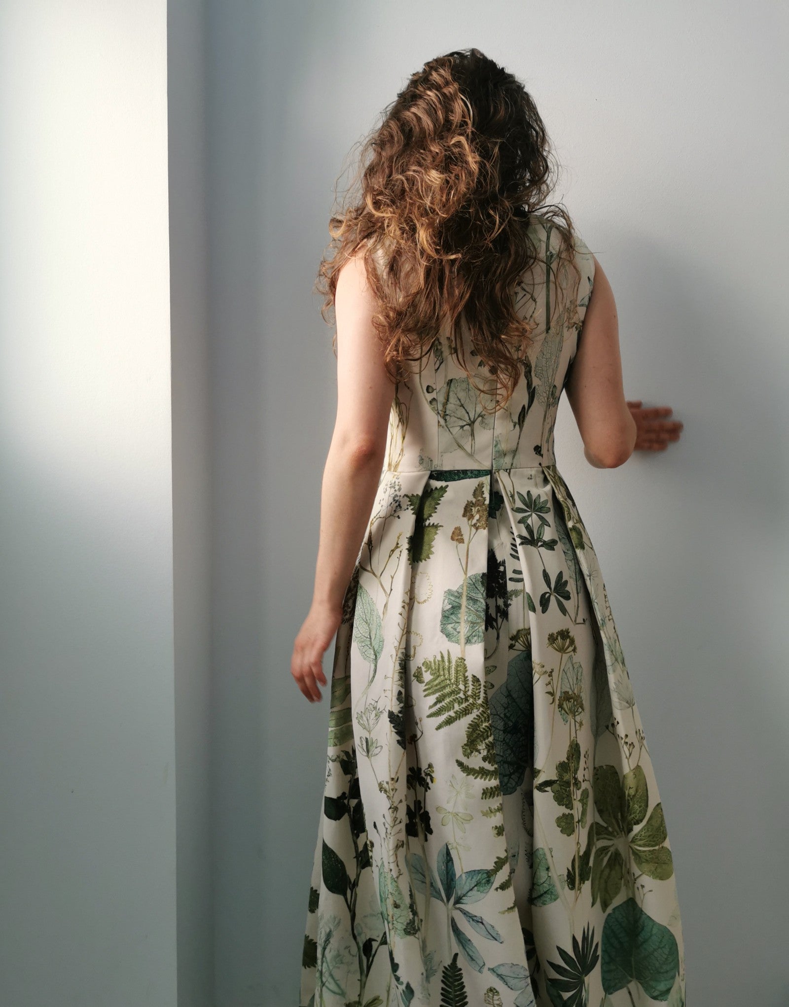 Before this textile was made into a botanical dress, it served as a table cloth in Danish restaurants and were ment to end up as textile waste. Now this upcycled material will be joining fancy dinner parties once more - just as a slow fashion creation.
