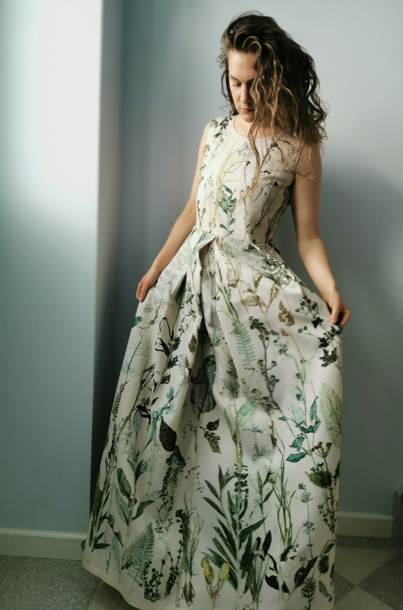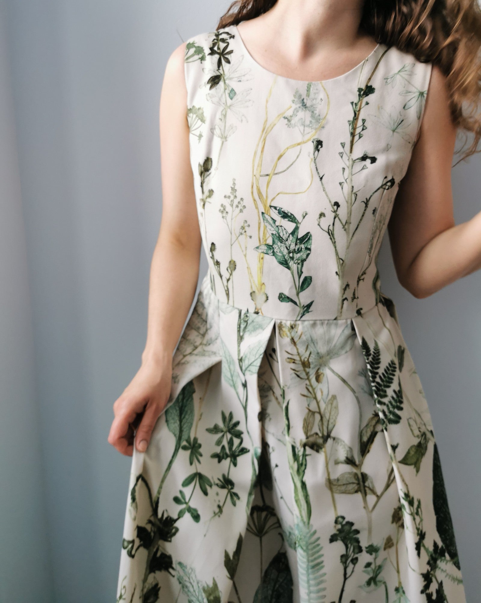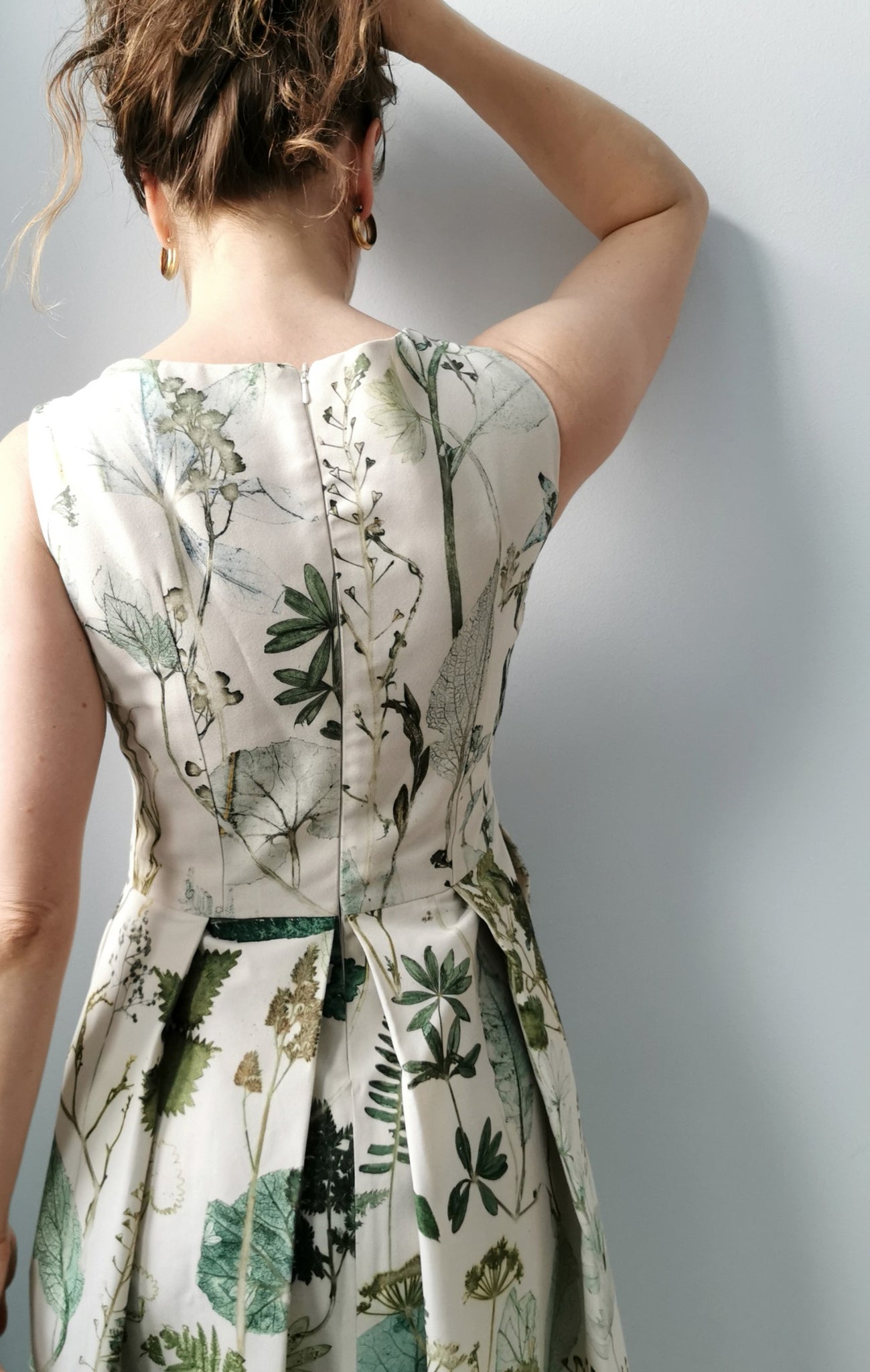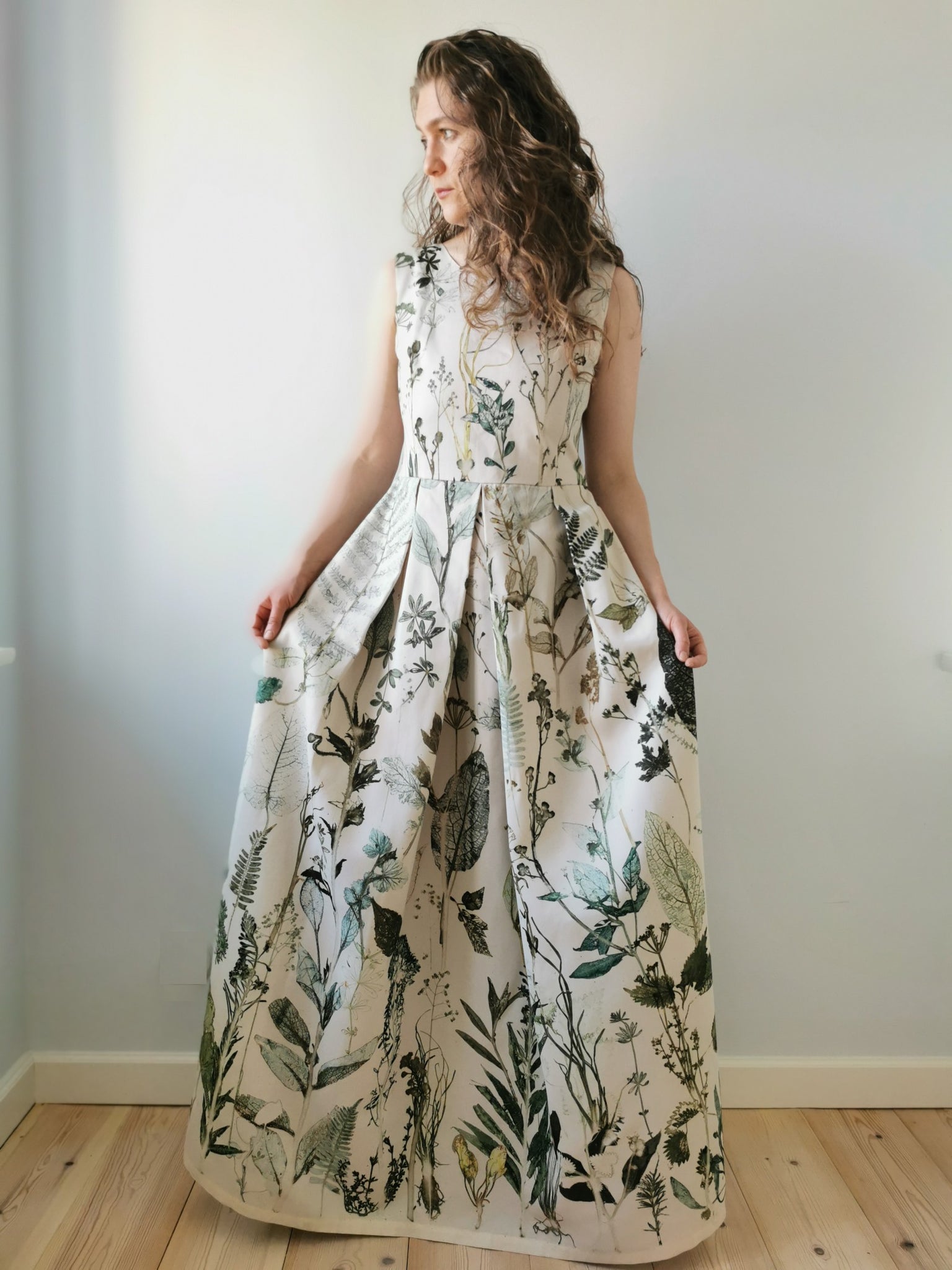Before this textile was made into a botanical dress, it served as a table cloth in Danish restaurants and were ment to end up as textile waste. Now this upcycled material will be joining fancy dinner parties once more - just as a slow fashion creation.
