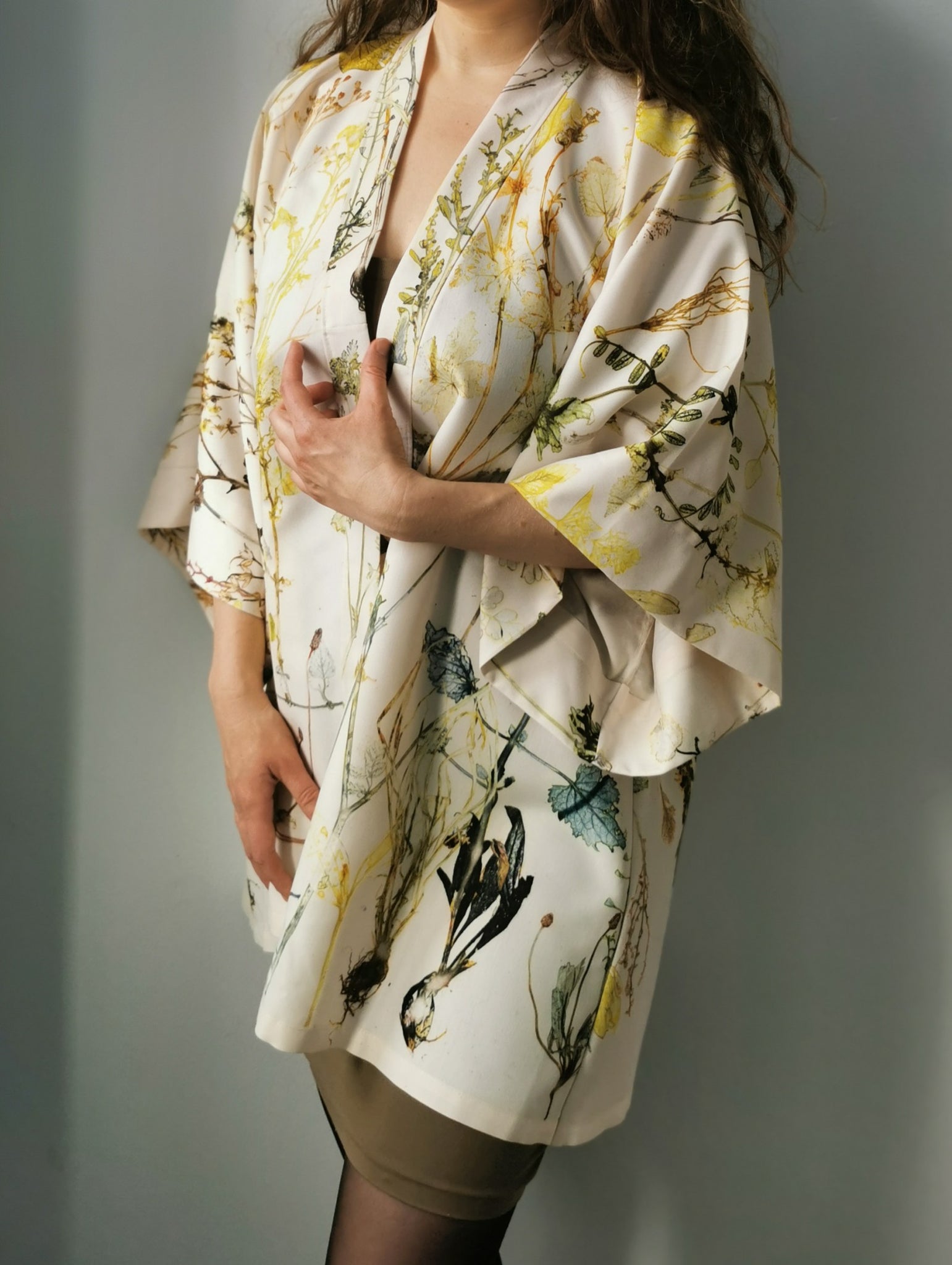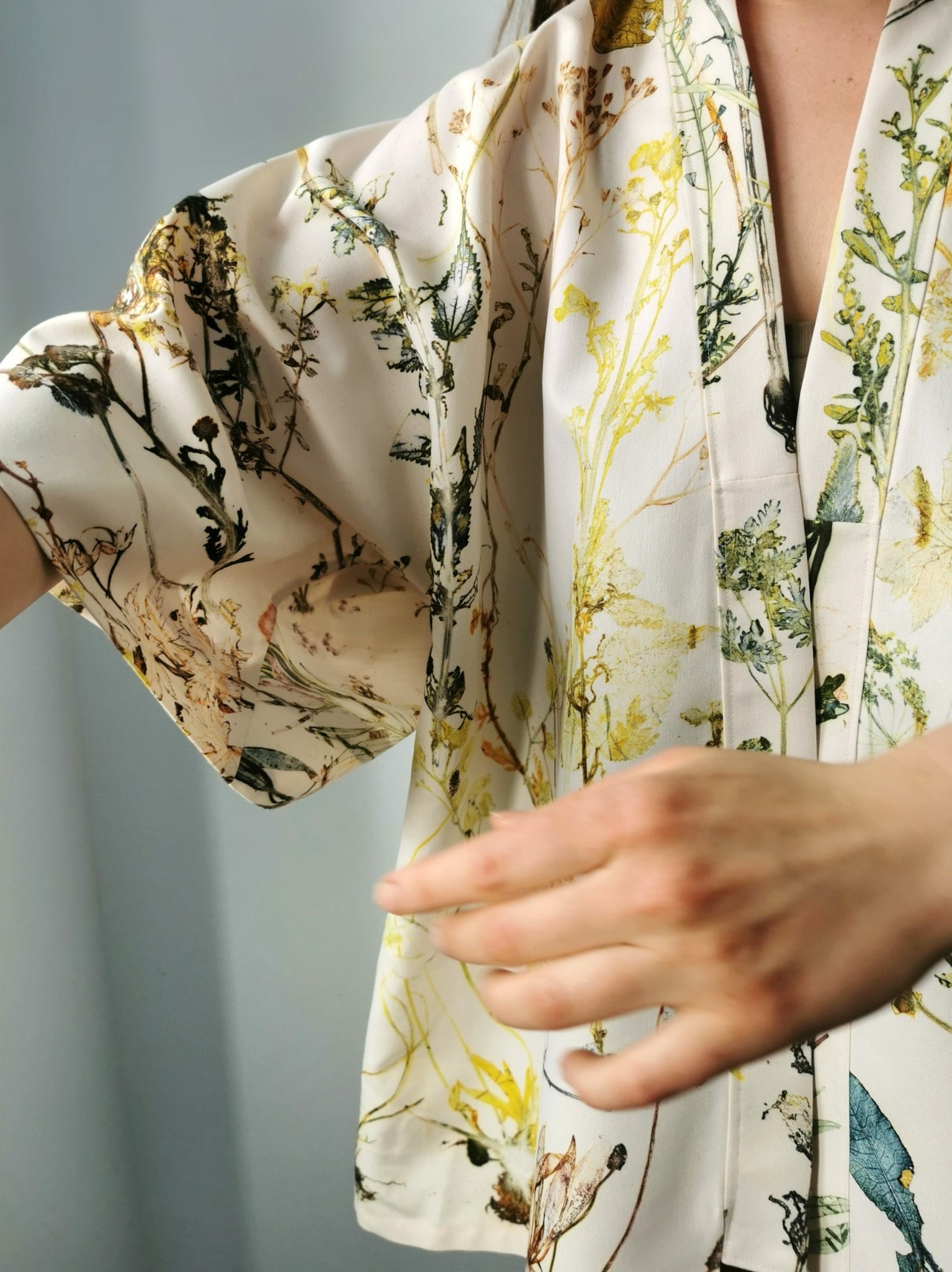 The botanical kimono jacket is a sample for a collection of kimonos that never reached production due to too high production costs. Therefore this is the only item of this kind of style. Wide sleves and lose fit.