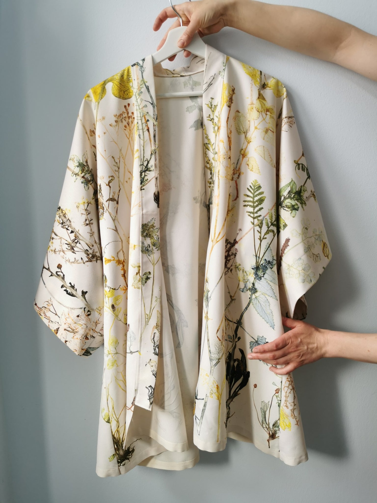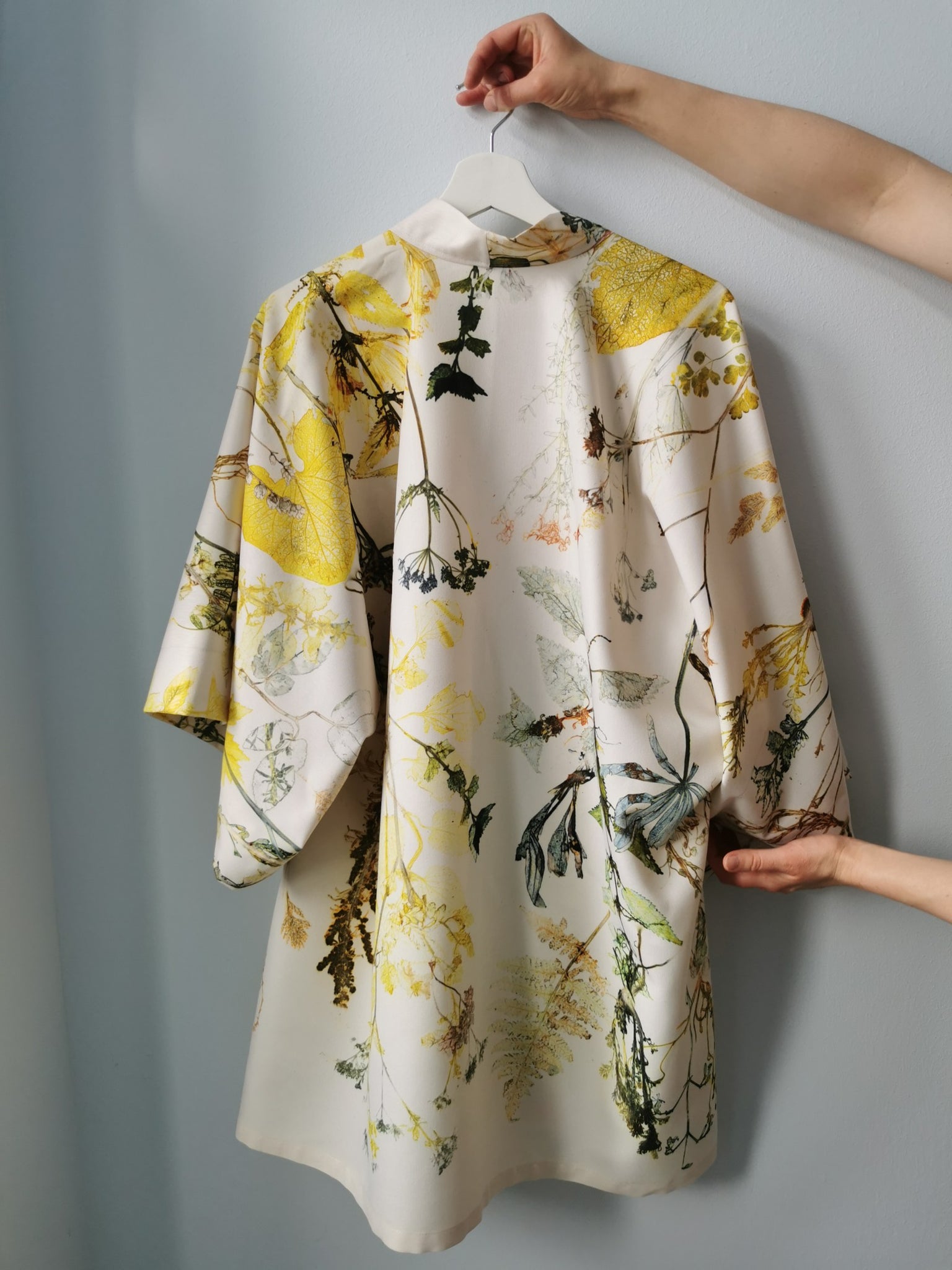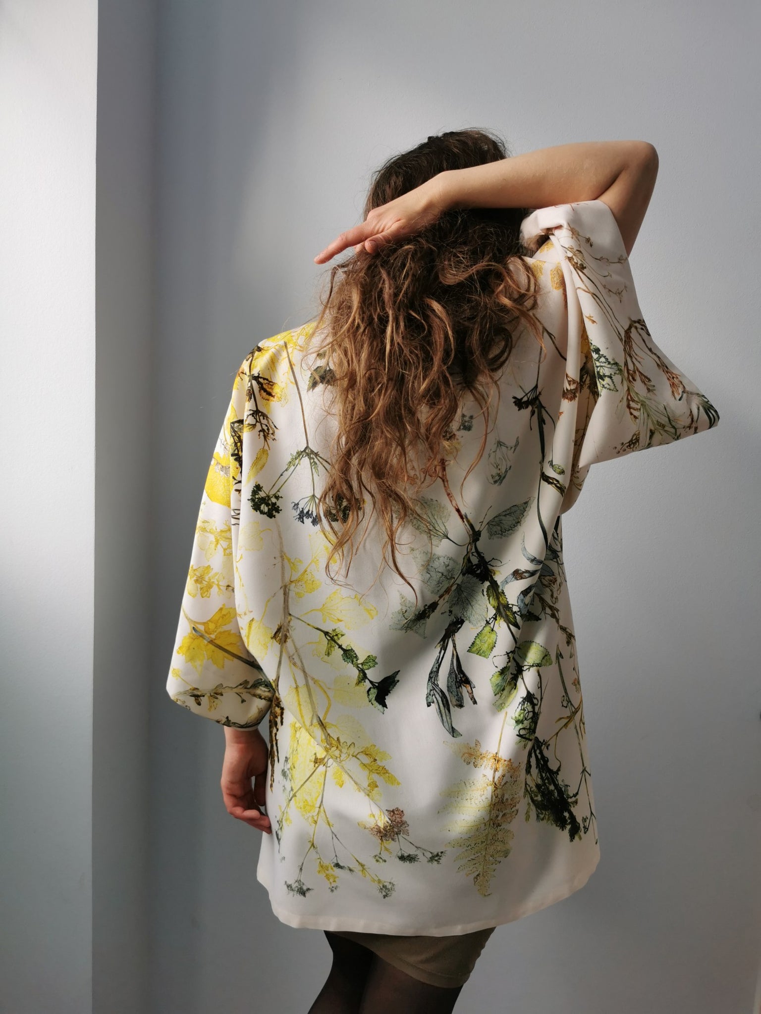 The kimono jackets is made of upcycled textile waste and decorated with handmade botanical monoprints. Therefore each item is a single edition were the botanical motif and colour composition varies from piece to piece. This has a green and yellow colour palette.
