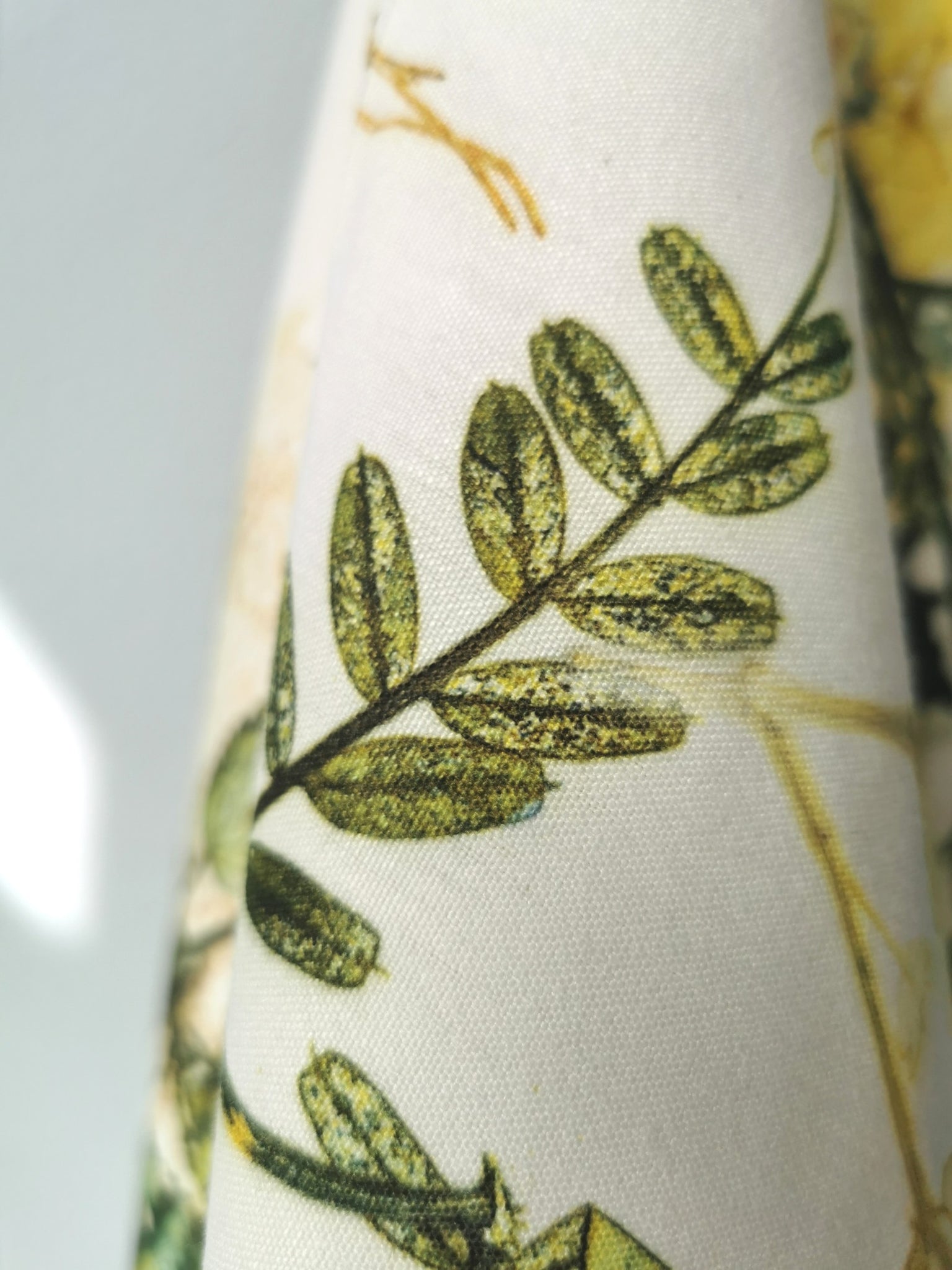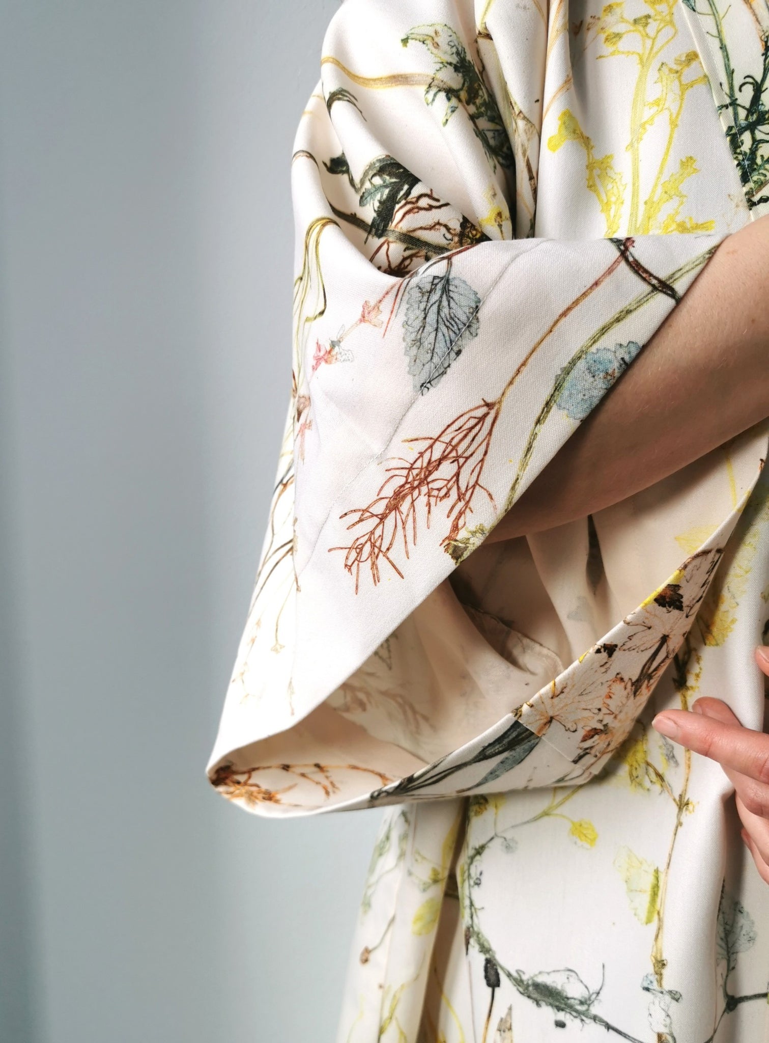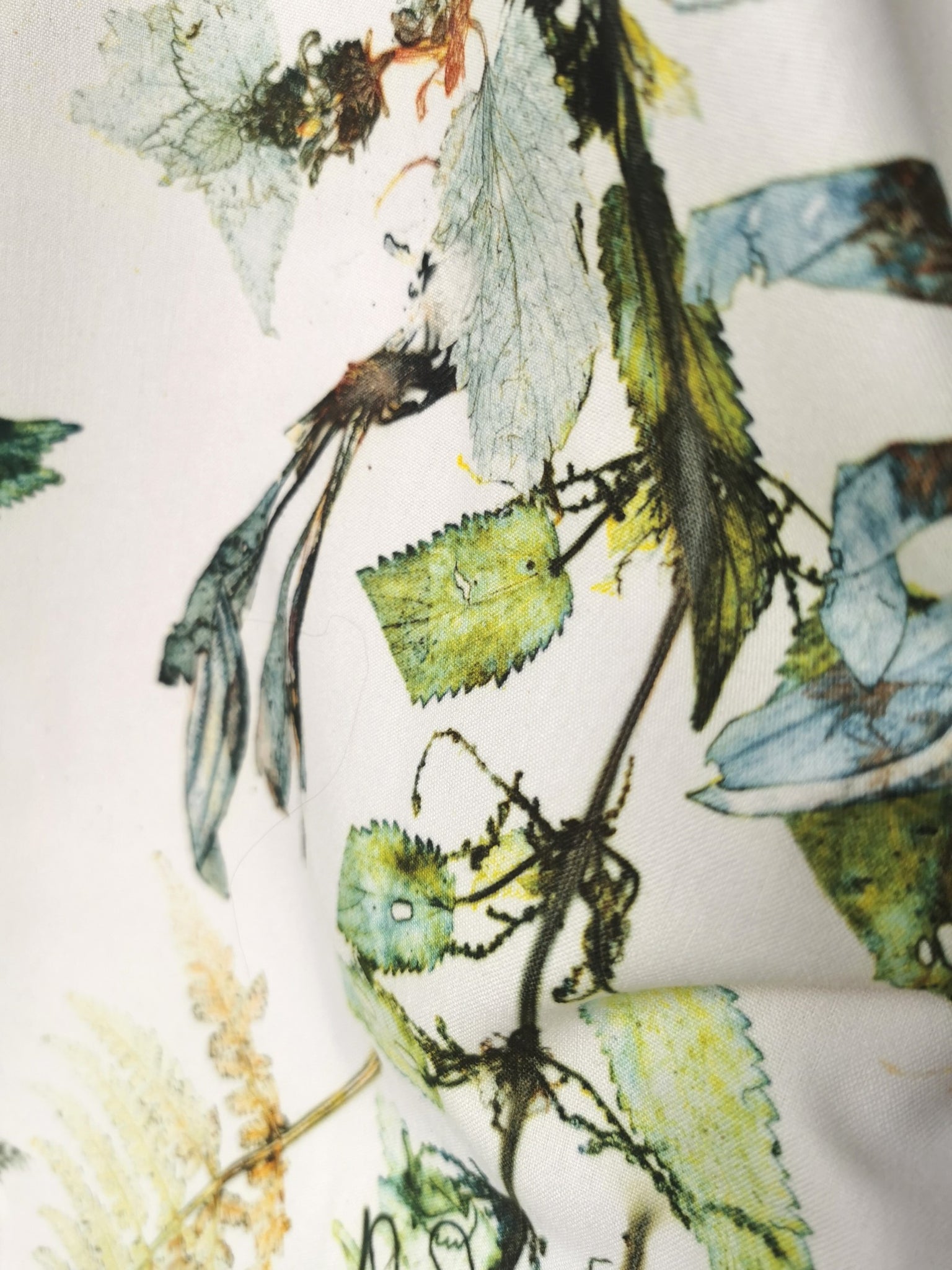 Please notice: This is a collection sample and so the sewing work is not made with perfection and is made in the mind for testing the style. Yet, is is wearable and the botanical print is made with the same quality as any other normal collection.