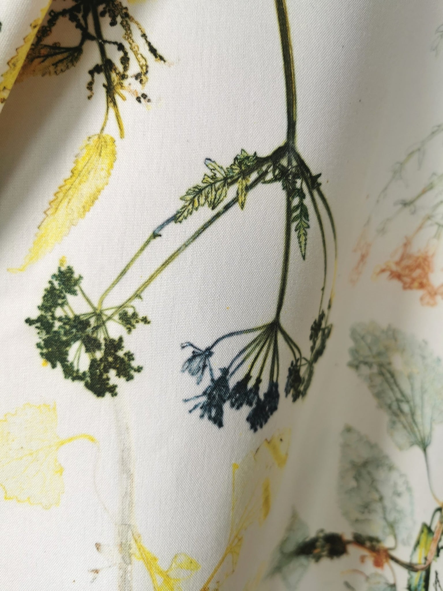 The textile is handprinted by Nathalie Gaia Dahl, who has collected local plants from the city space.