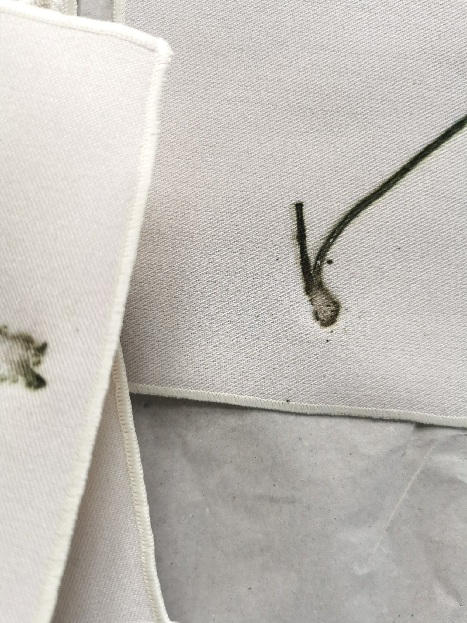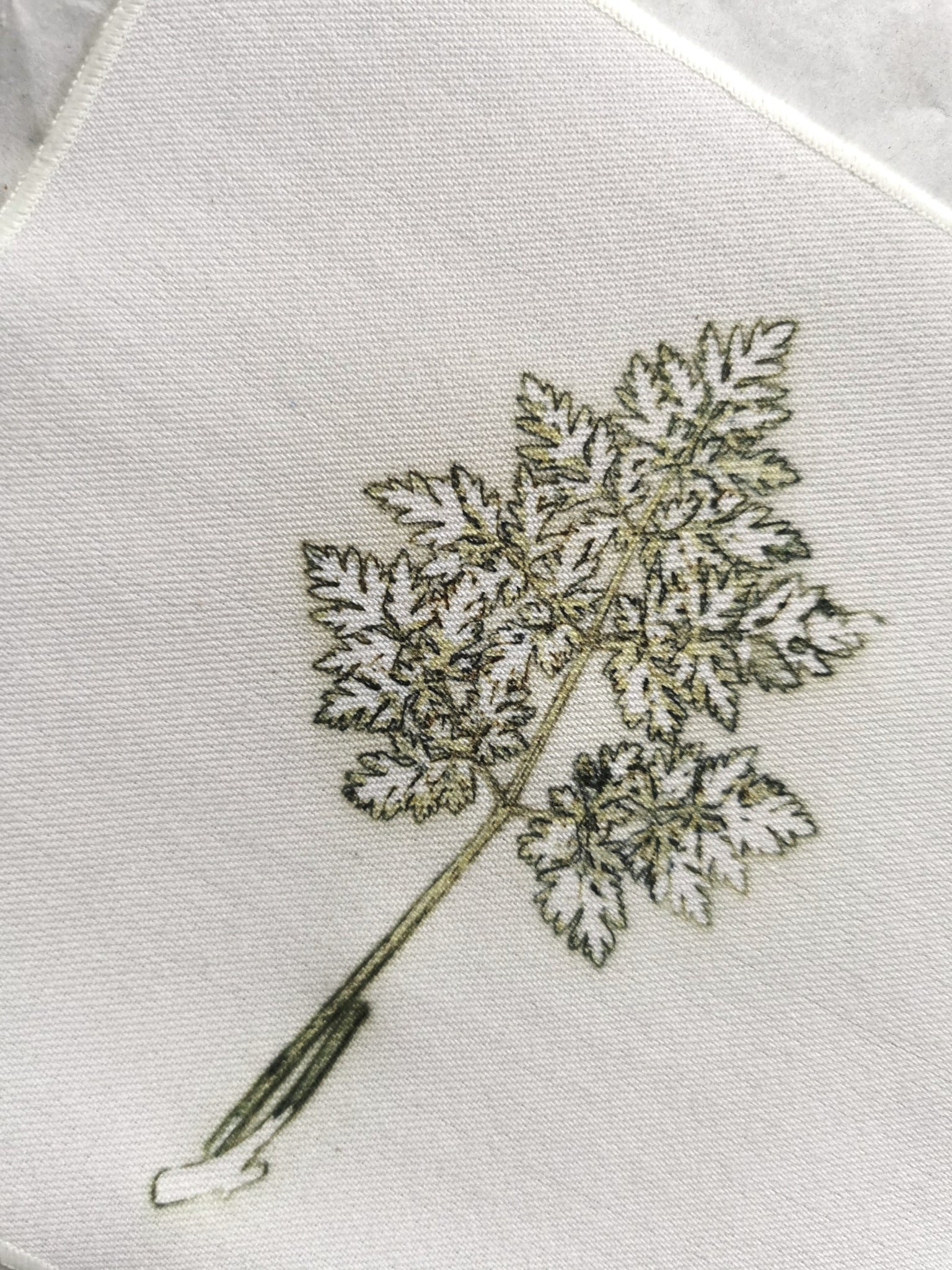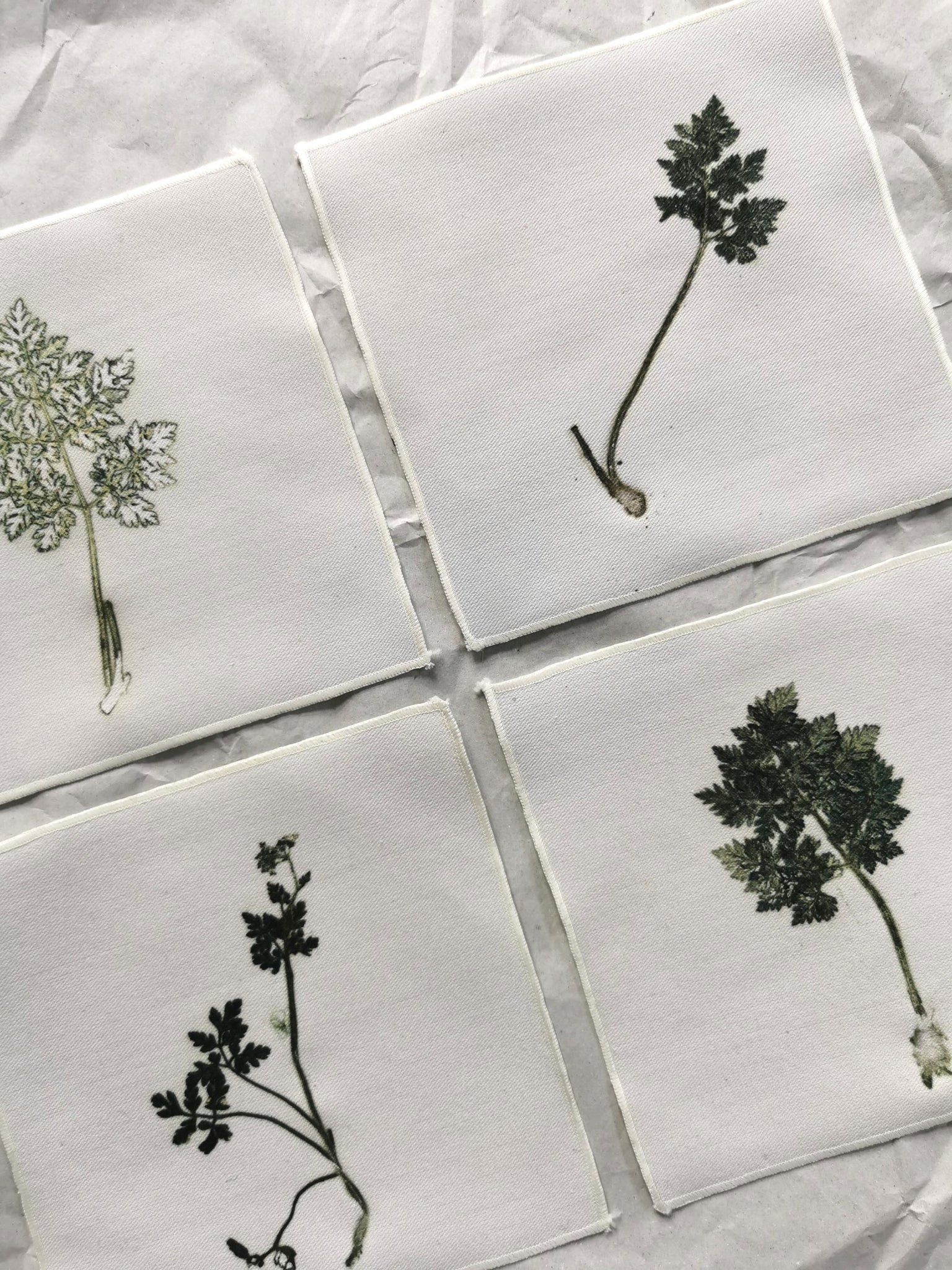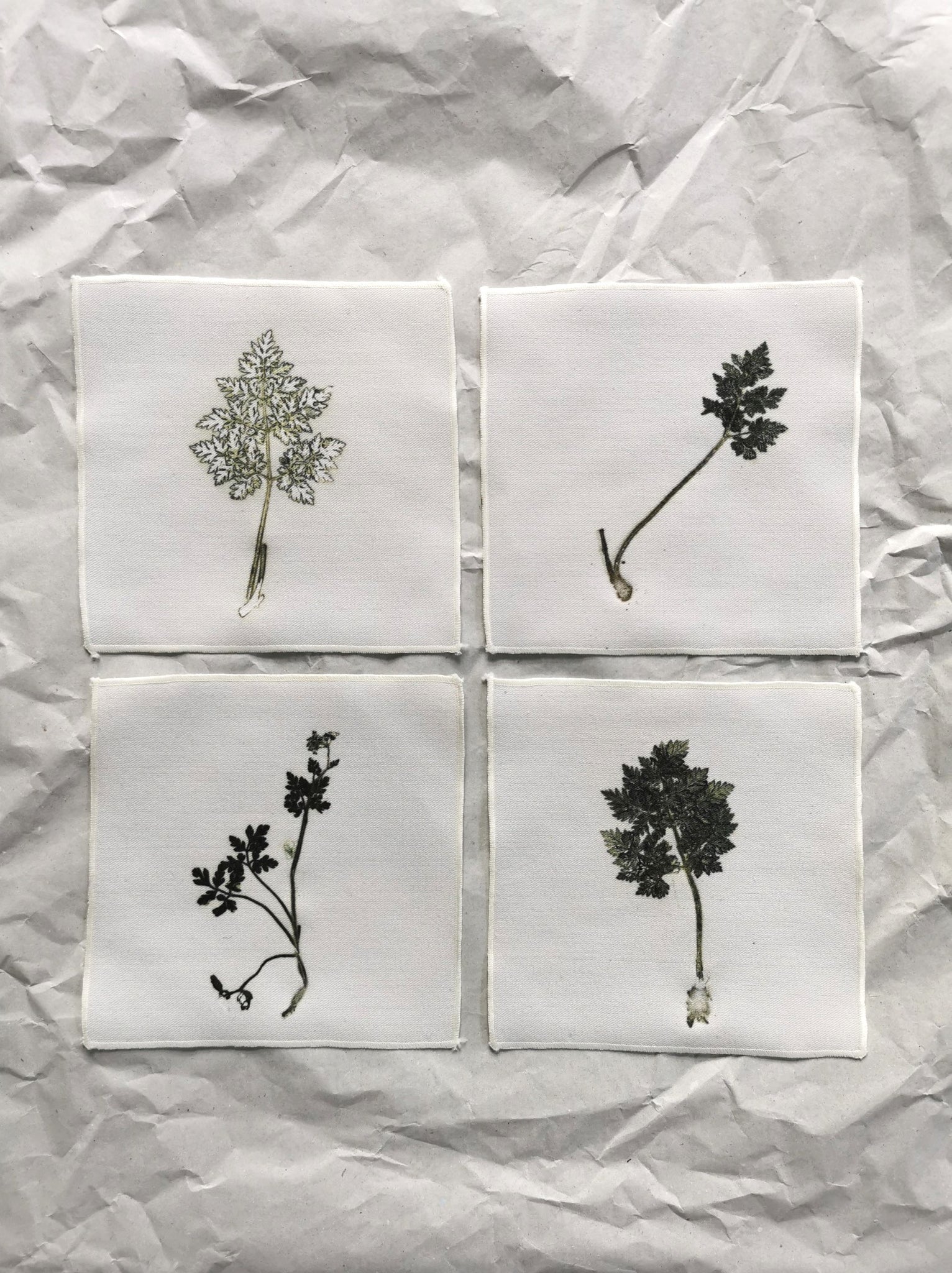 Local plants have been carefully collected, dried, painted and then pressed directly on the fabric which leaves a very precise single edition imprint.