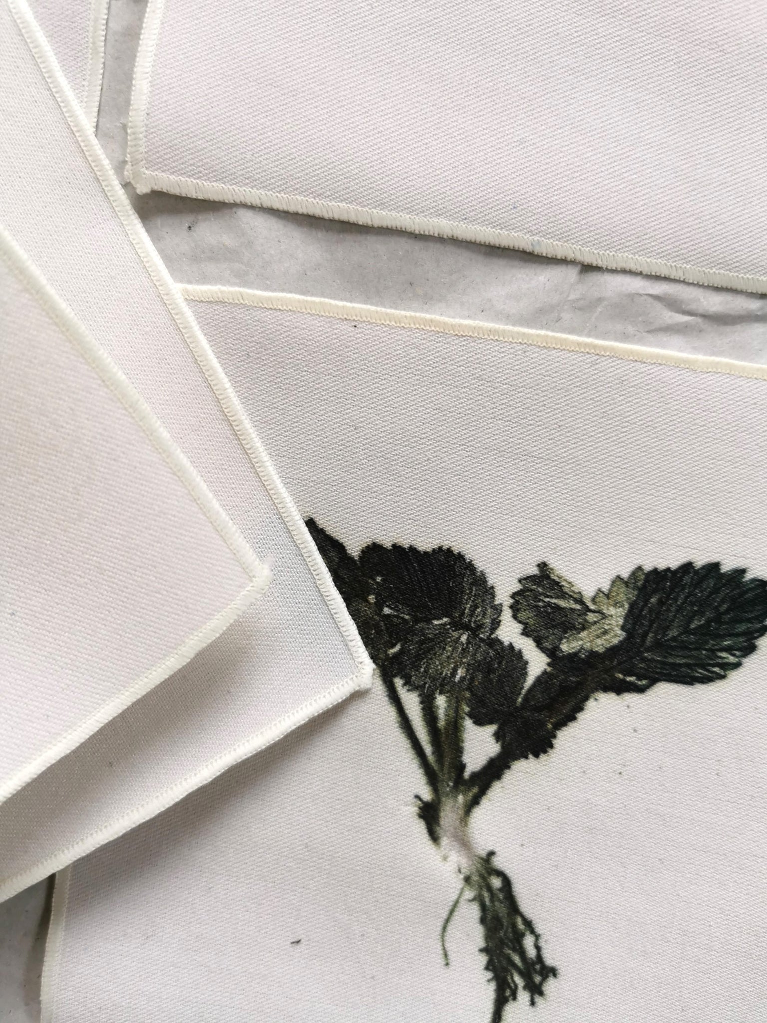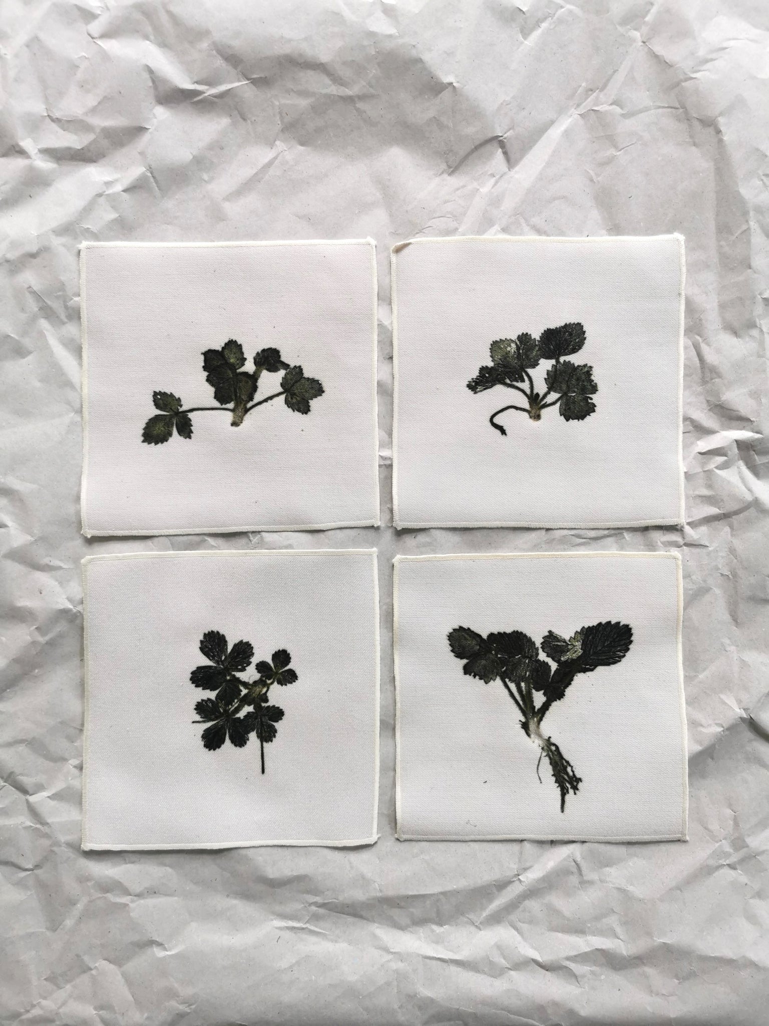Local plants have been carefully collected, dried, painted and then pressed directly on the fabric which leaves a very precise single edition imprint.