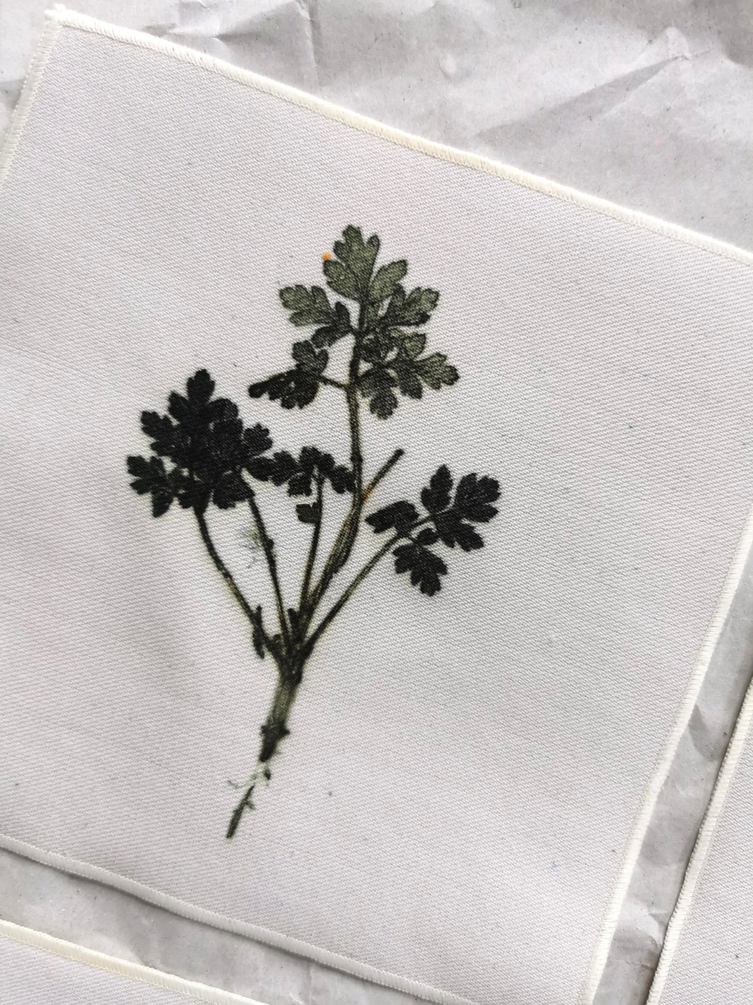 Local plants have been carefully collected, dried, painted and then pressed directly on the fabric which leaves a very precise single edition imprint.
