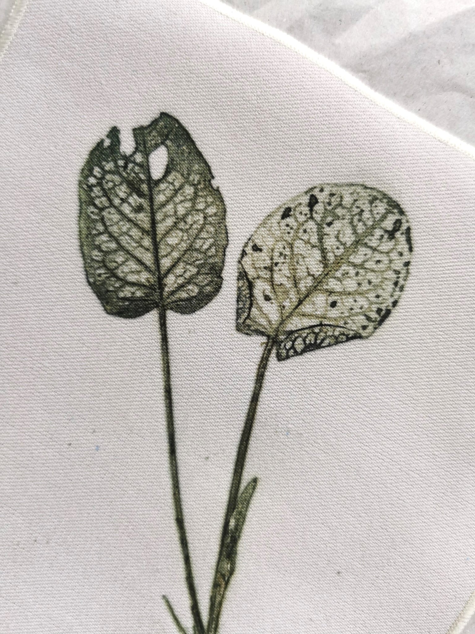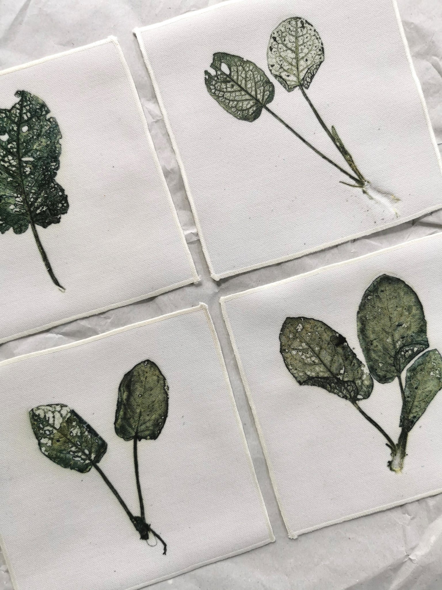 Local plants have been carefully collected, dried, painted and then pressed directly on the fabric which leaves a very precise single edition imprint.