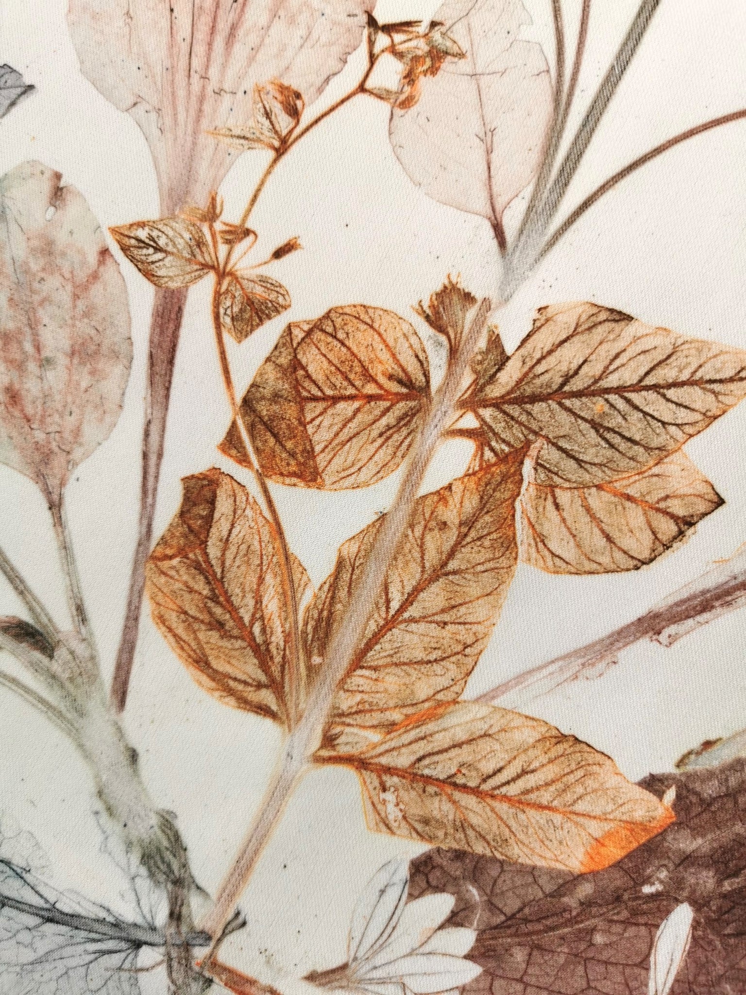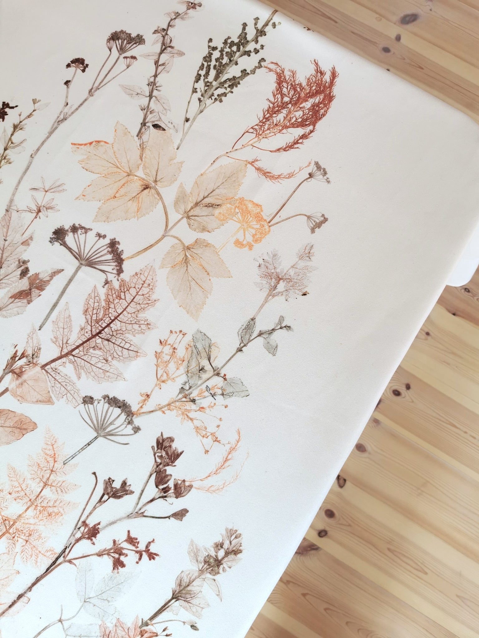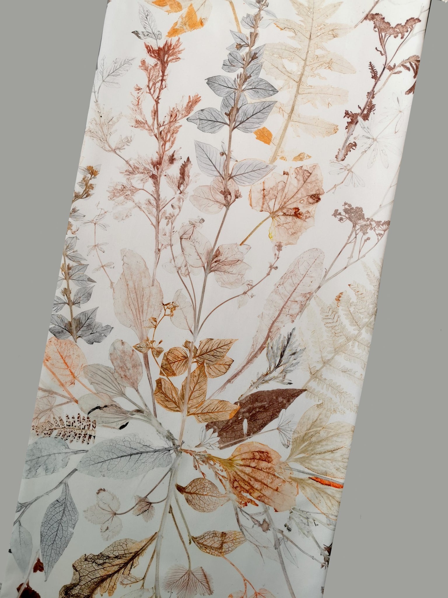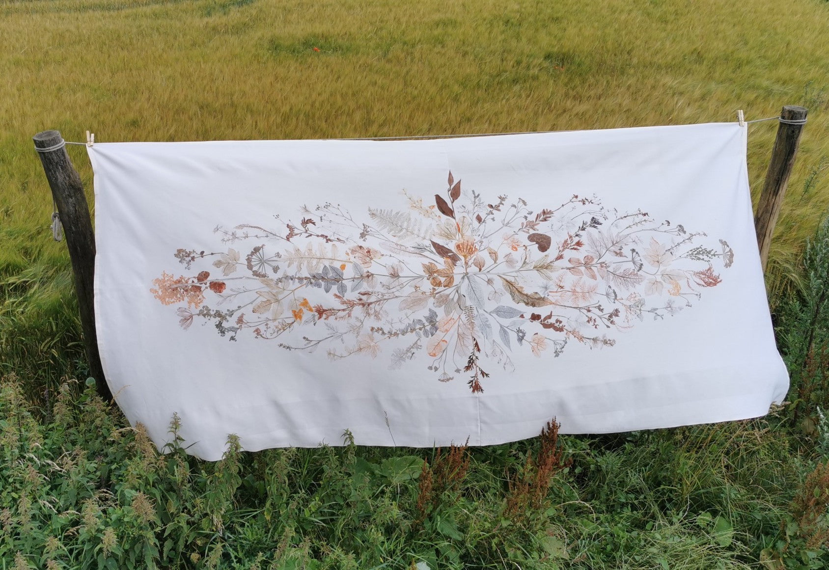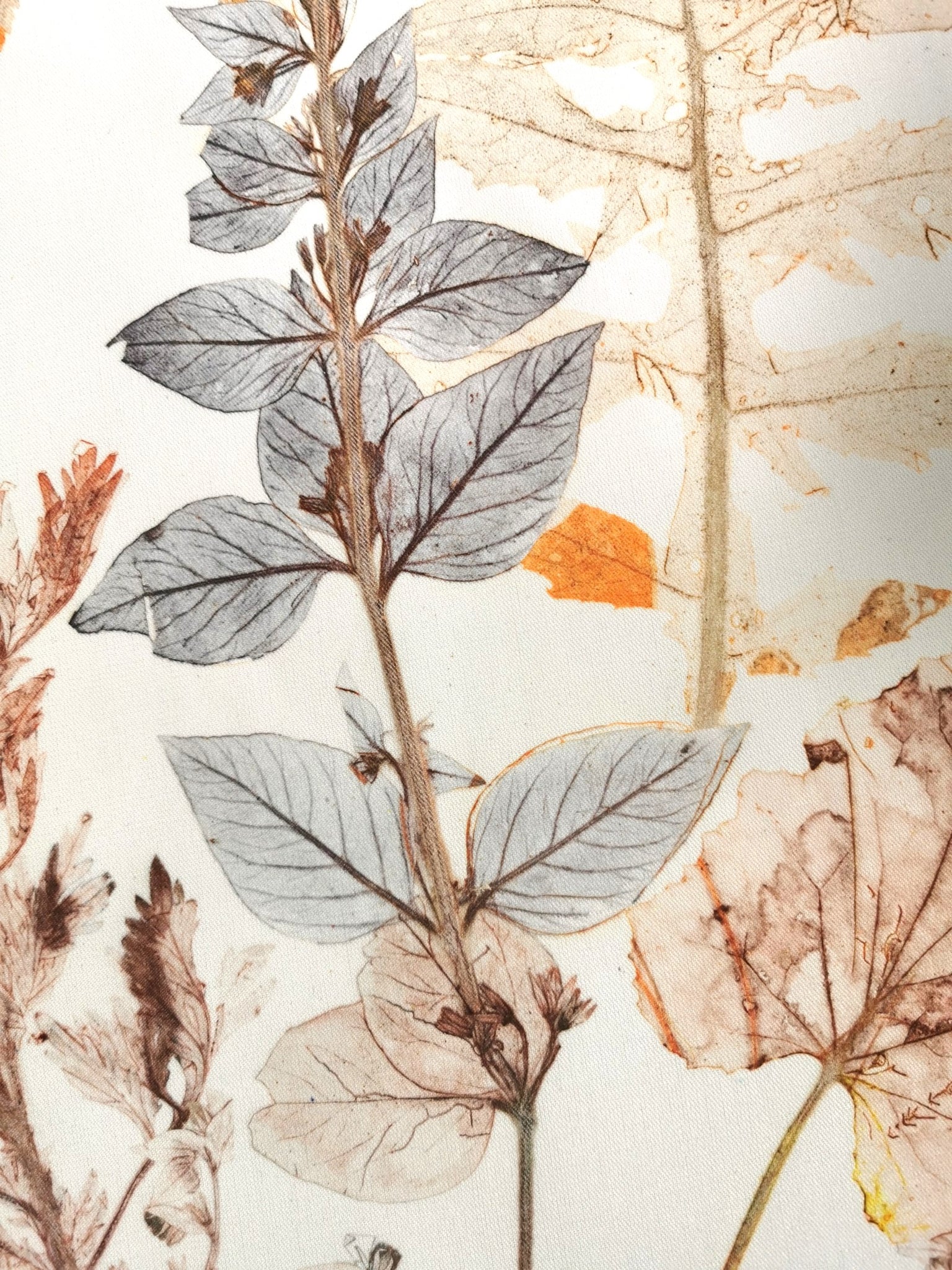 Local plants have been carefully collected, dried, painted and then pressed directly on the fabric which leaves a very precise single edition imprint.