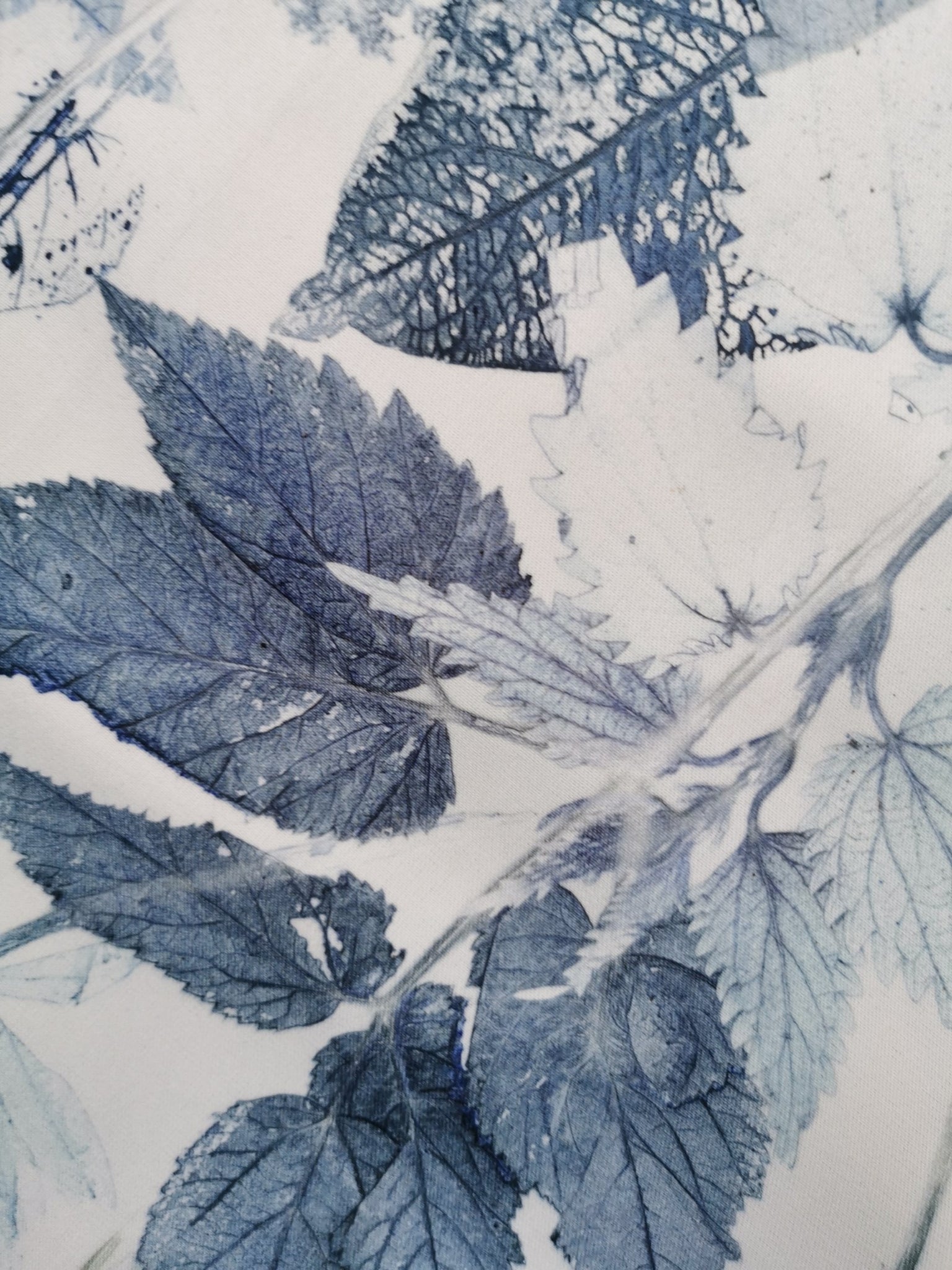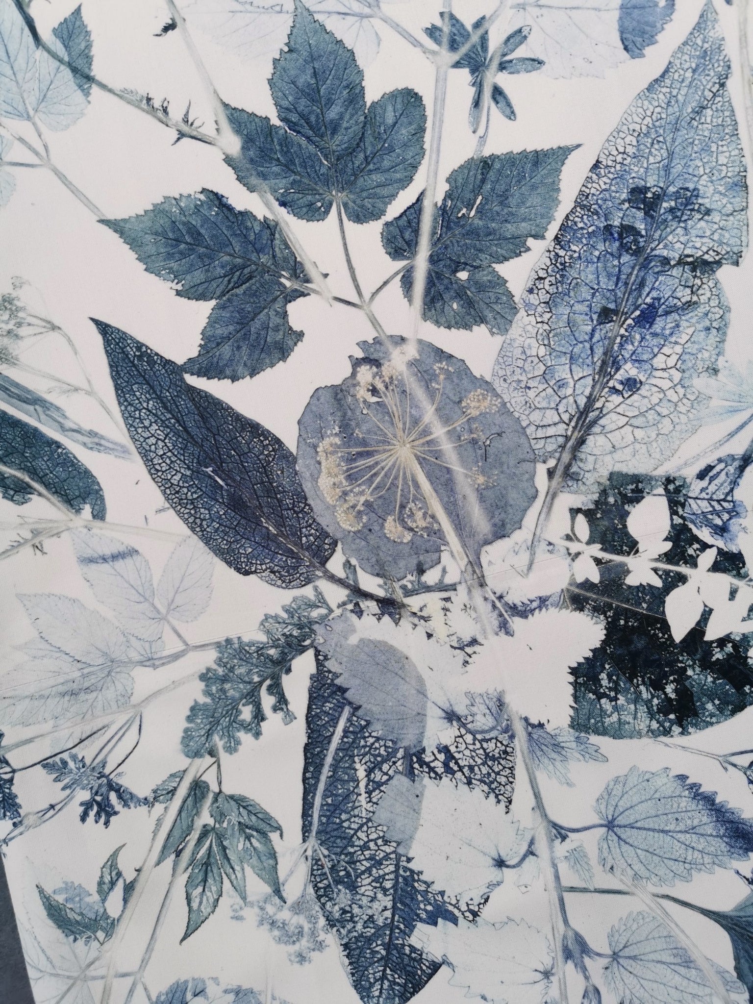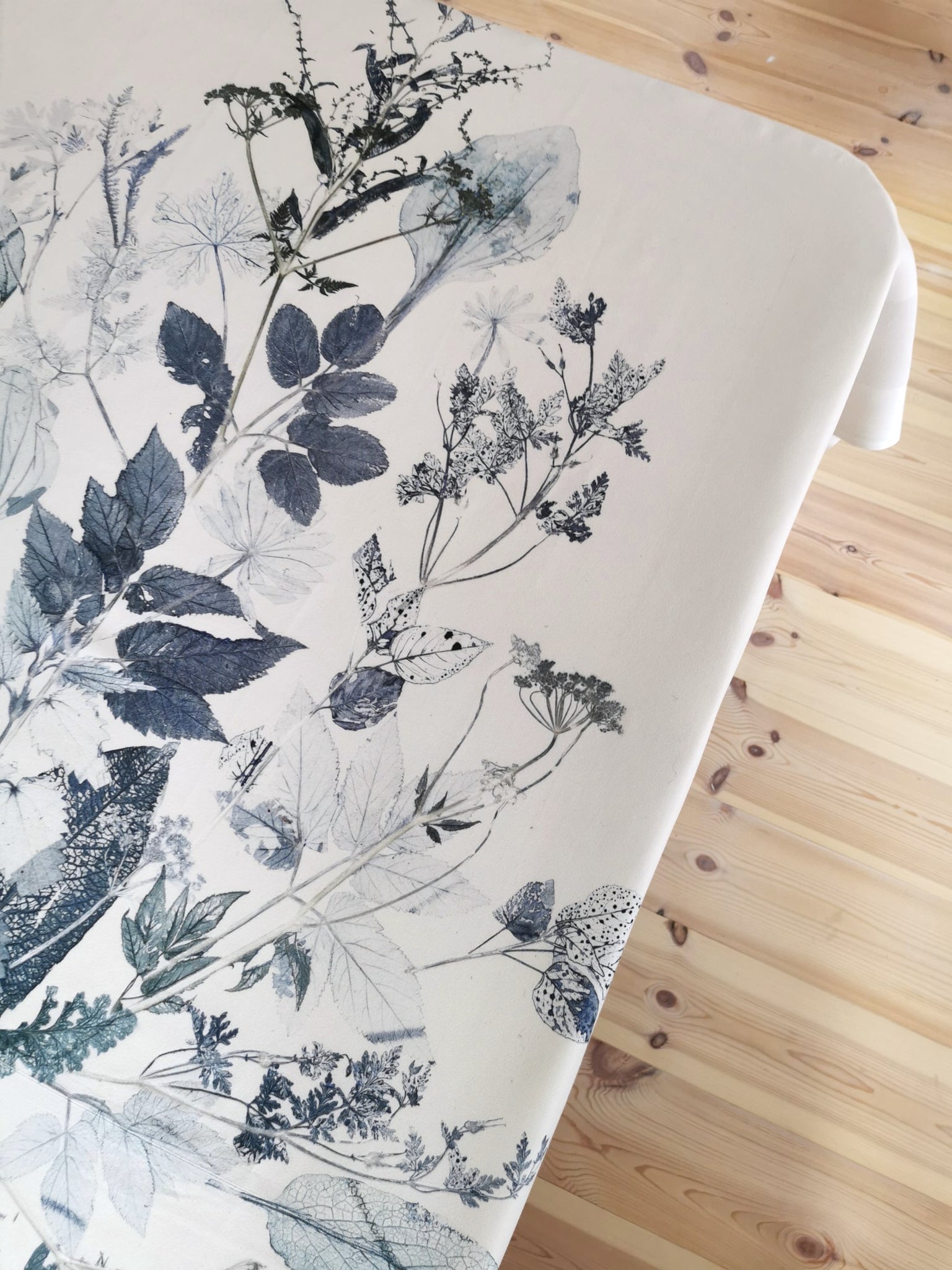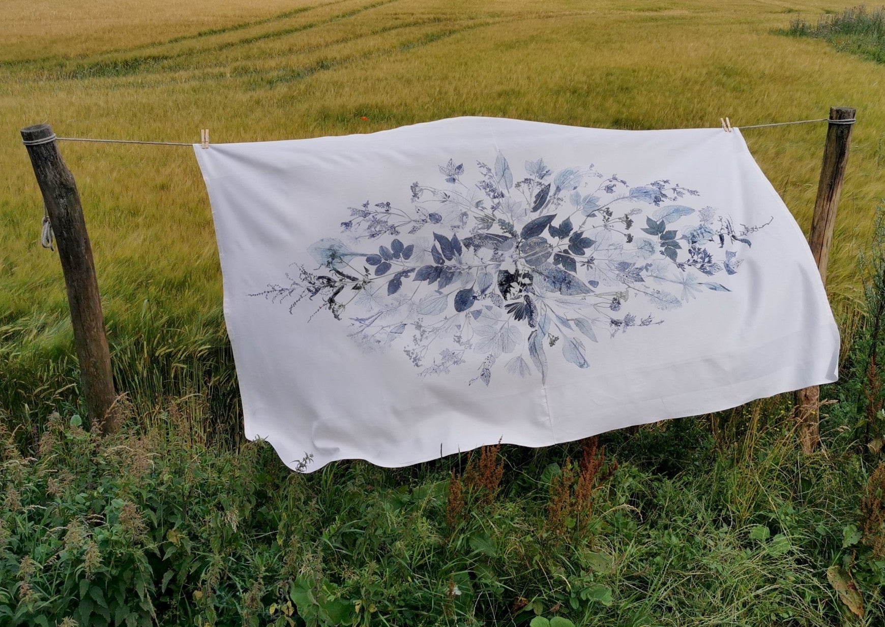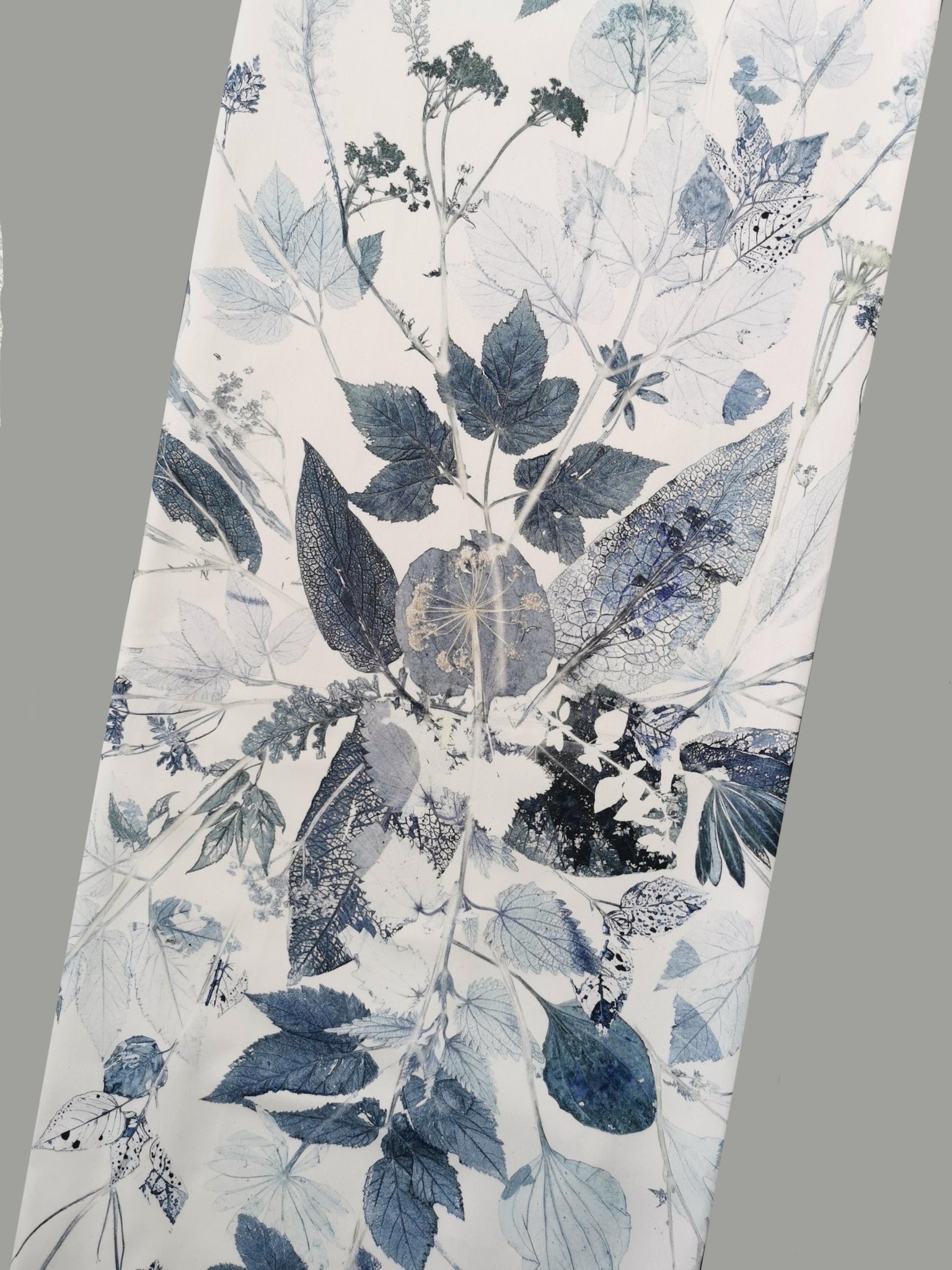 Local plants have been carefully collected, dried, painted and then pressed directly on the fabric which leaves a very precise single edition imprint.