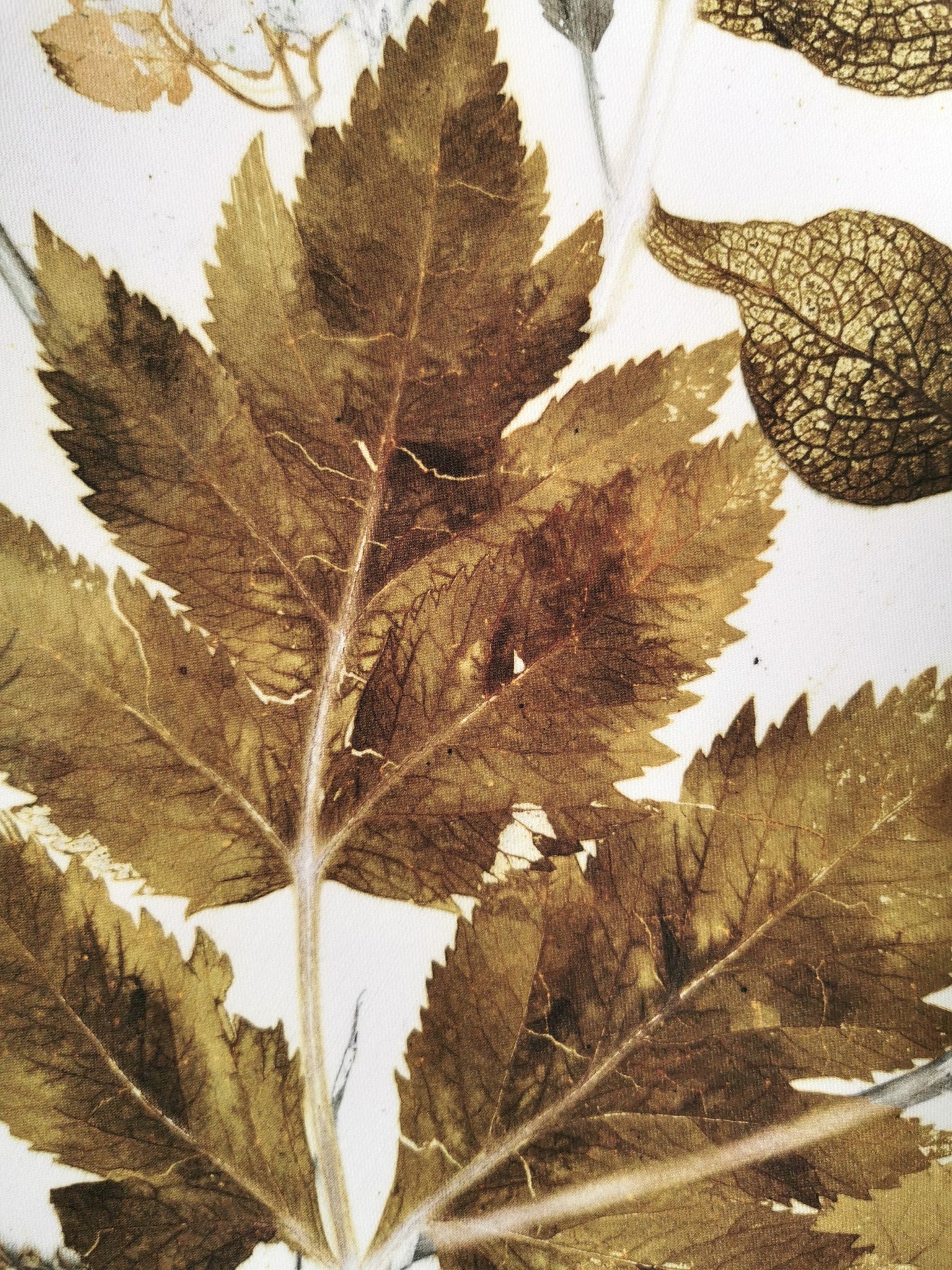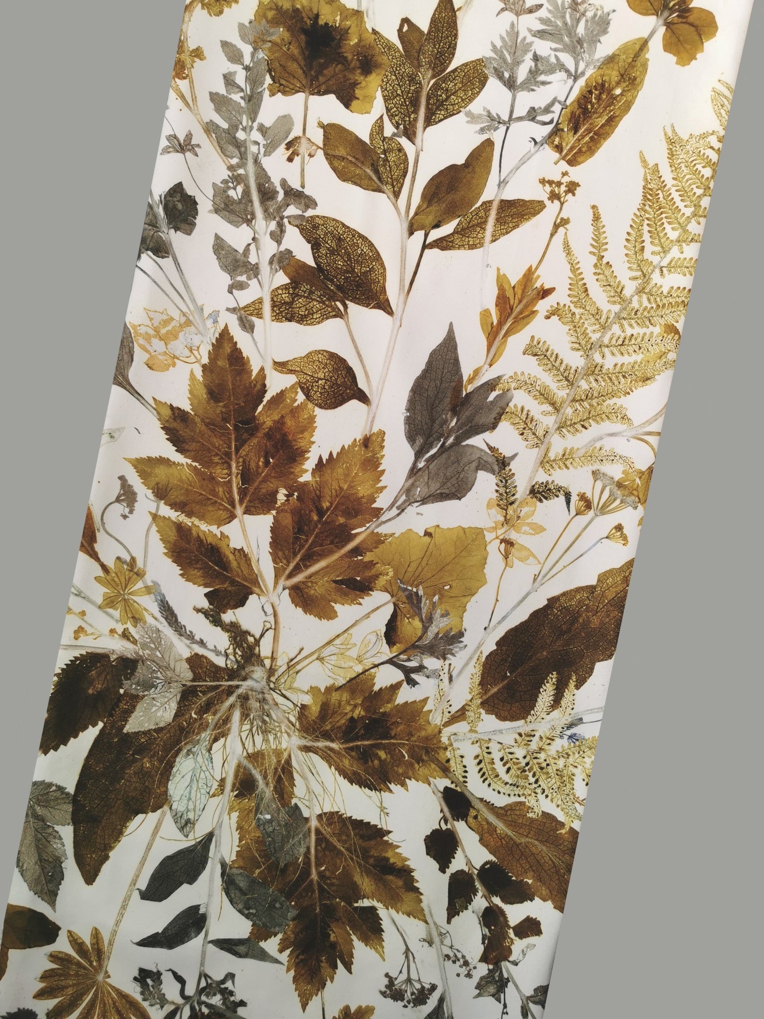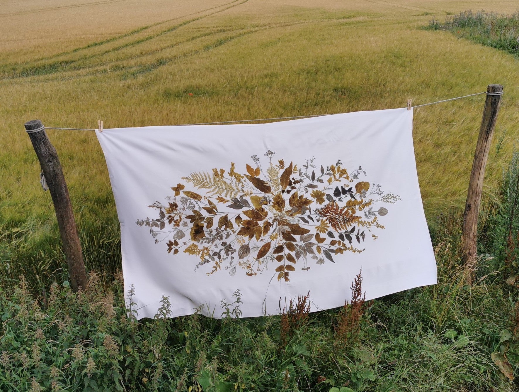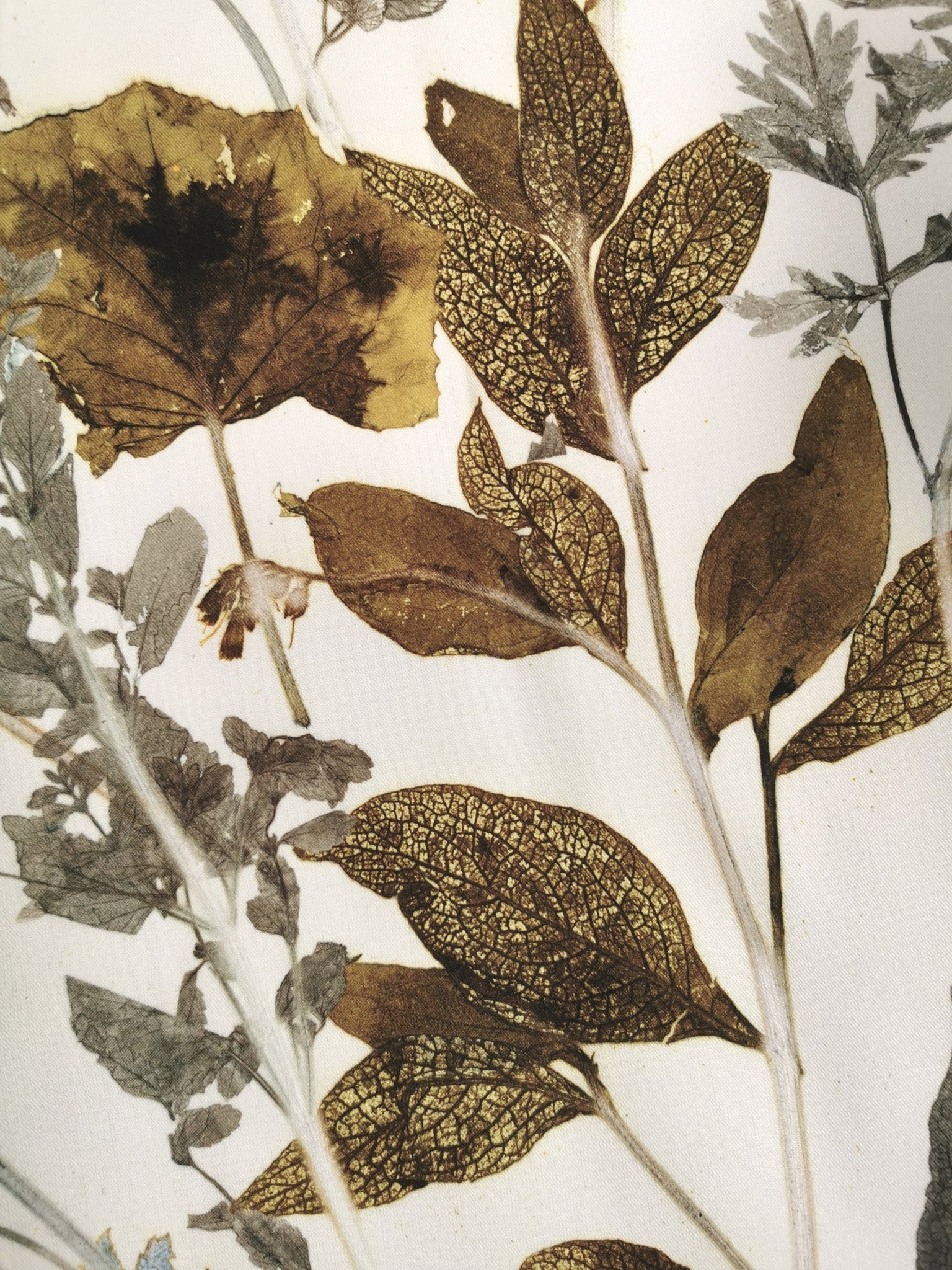 Local plants have been carefully collected, dried, painted and then pressed directly on the fabric which leaves a very precise single edition imprint.