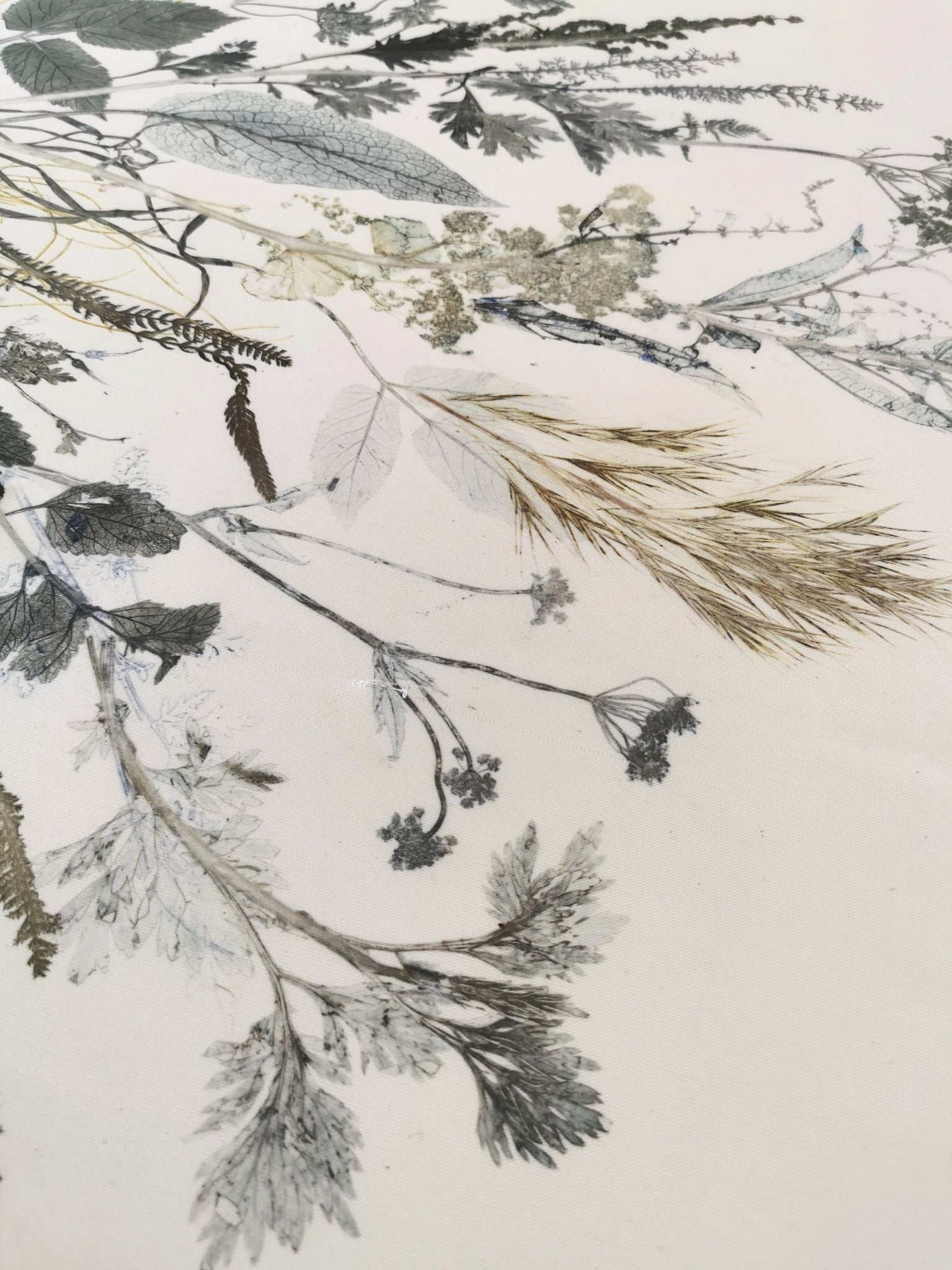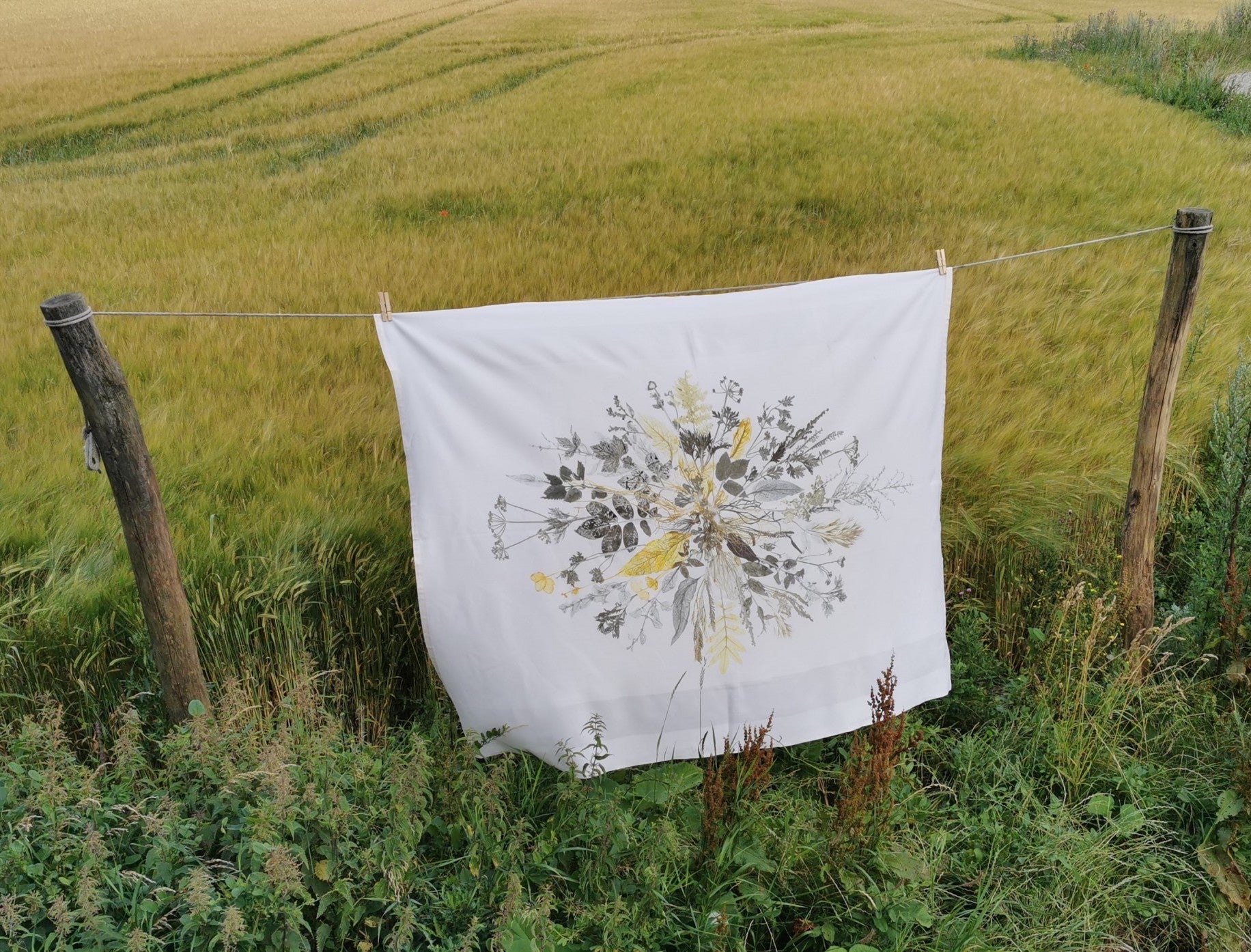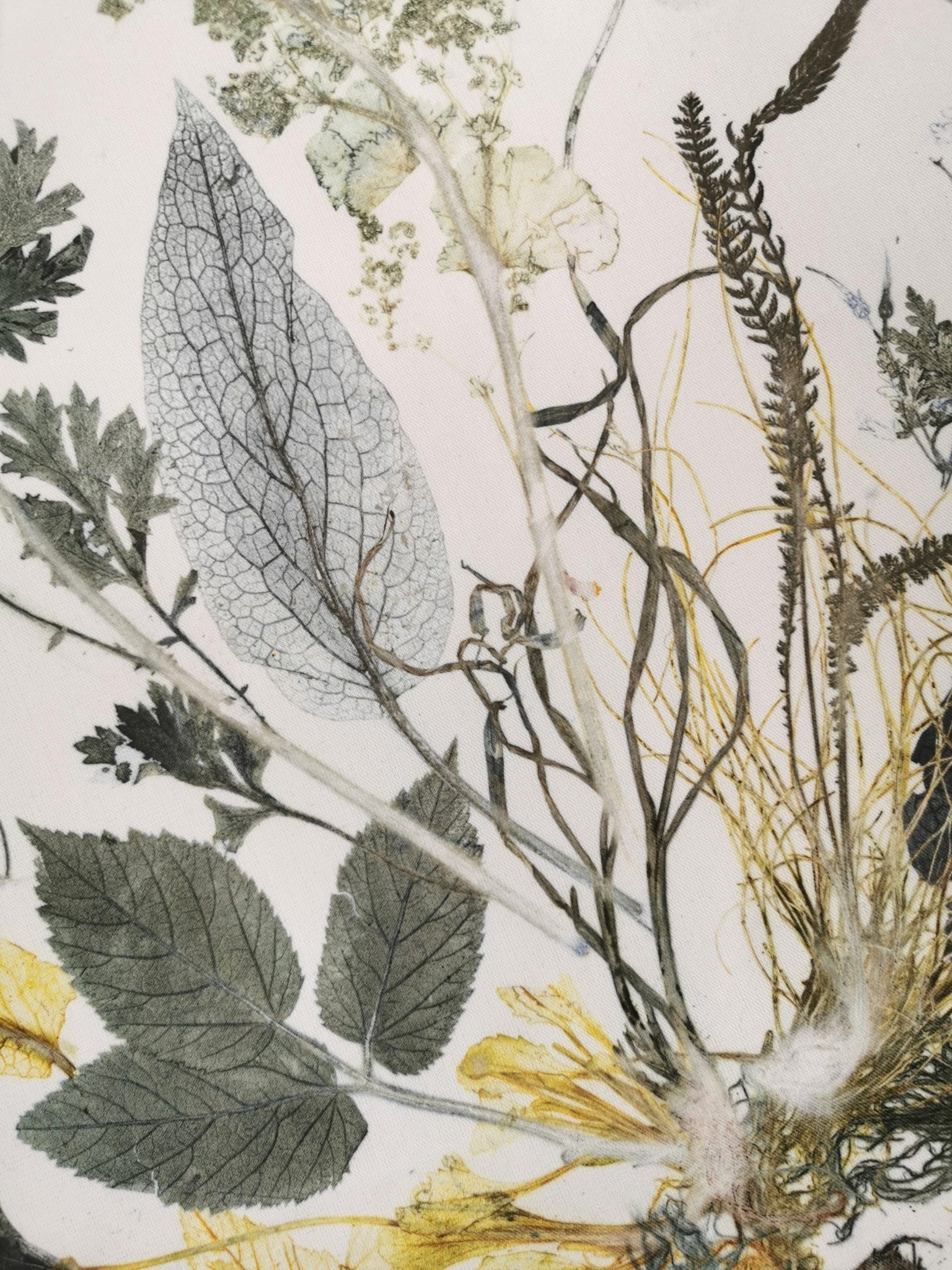 Local plants have been carefully collected, dried, painted and then pressed directly on the fabric which leaves a very precise single edition imprint.