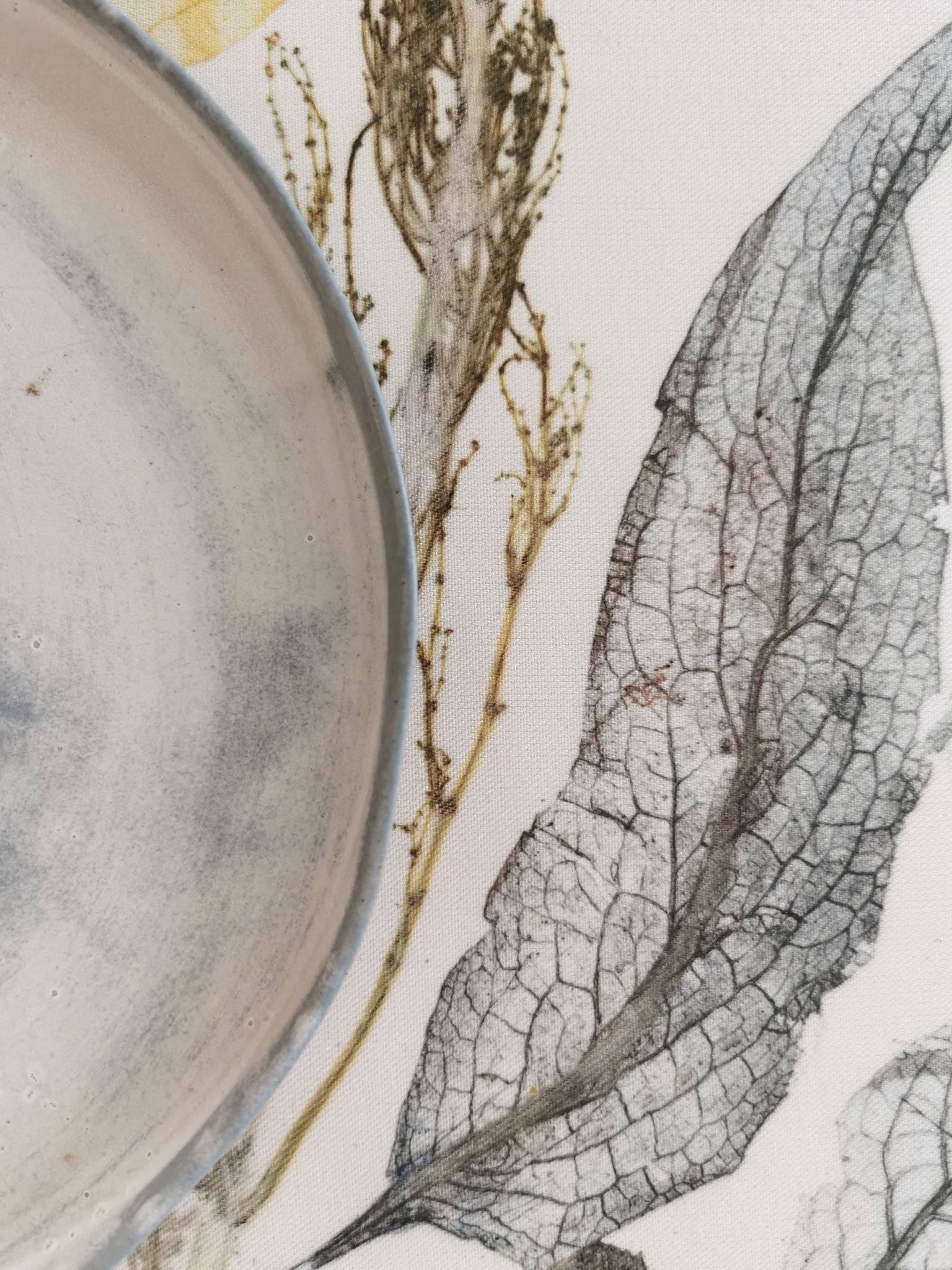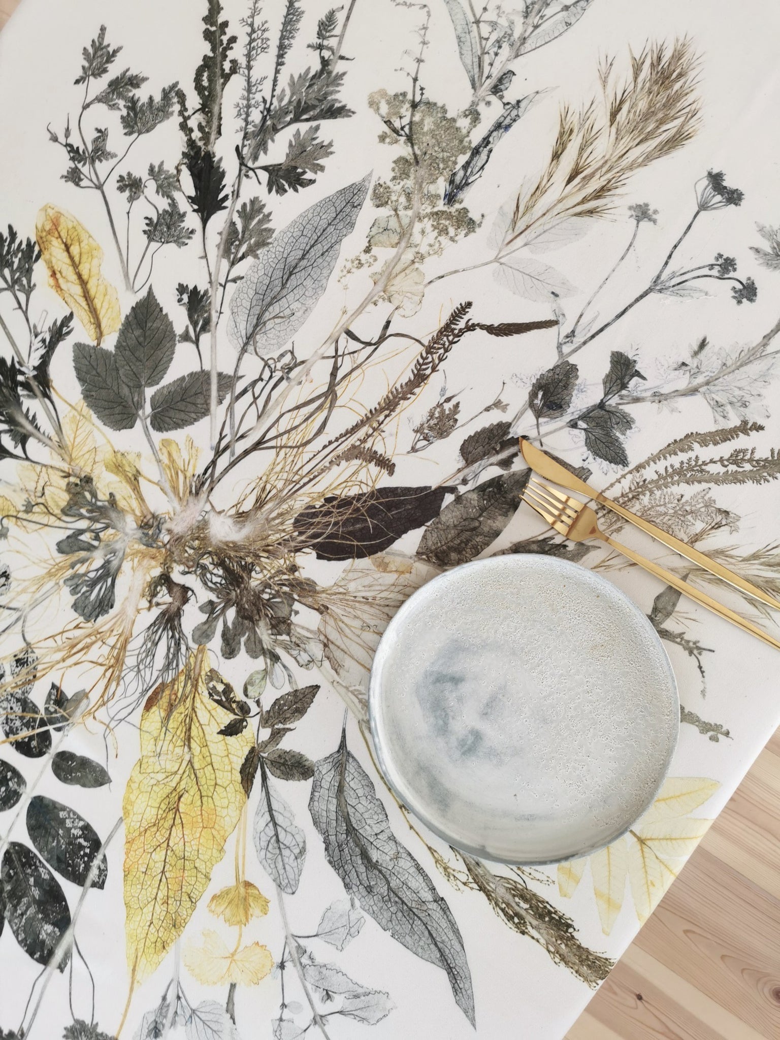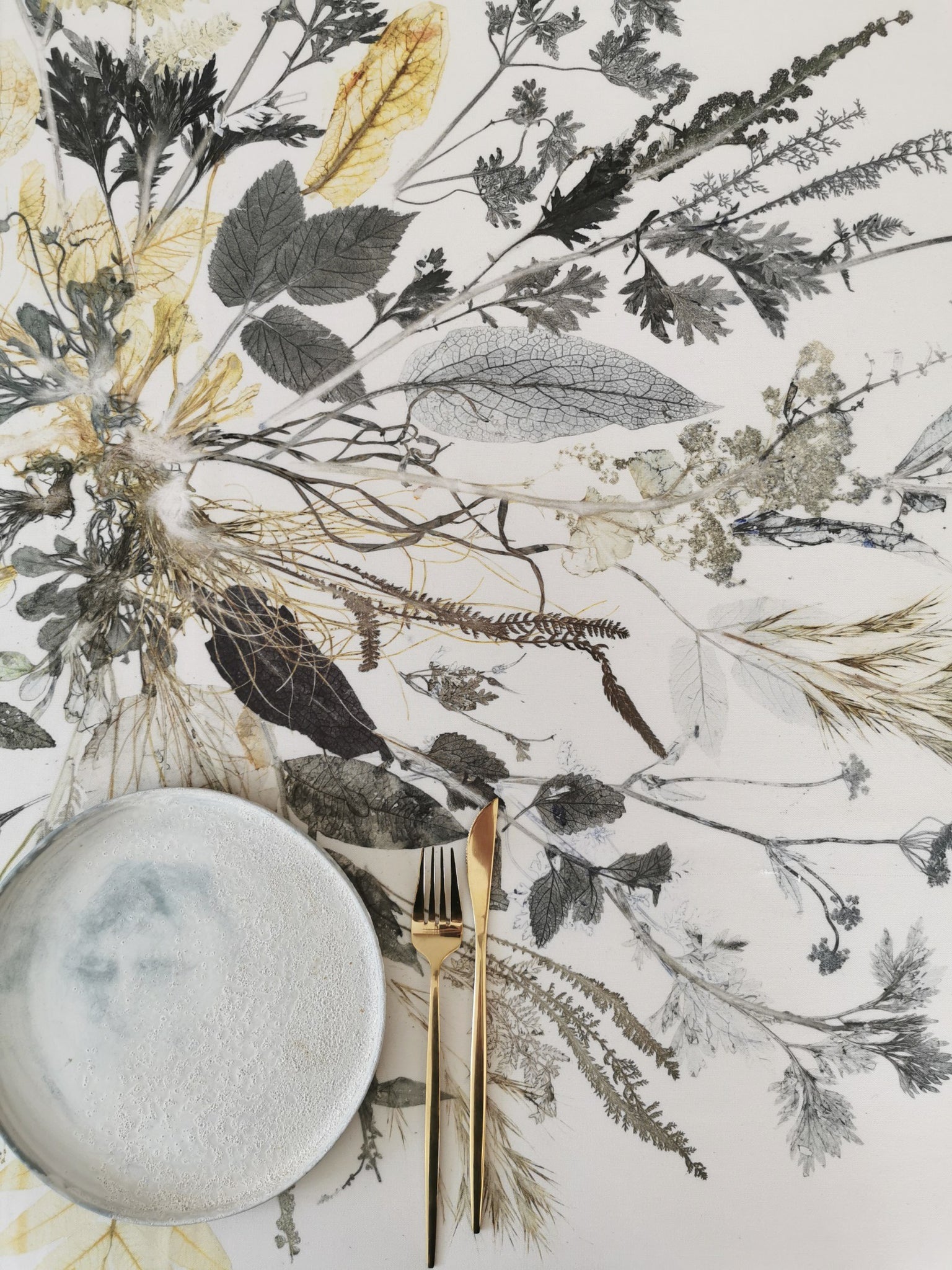 All table linens have an unique plant motif, which is handmade locally in the studio at Ulriksholm Slot near Kerteminde // Denmark; so there is exclusively one of each piece since the monoprint cannot be duplicated.