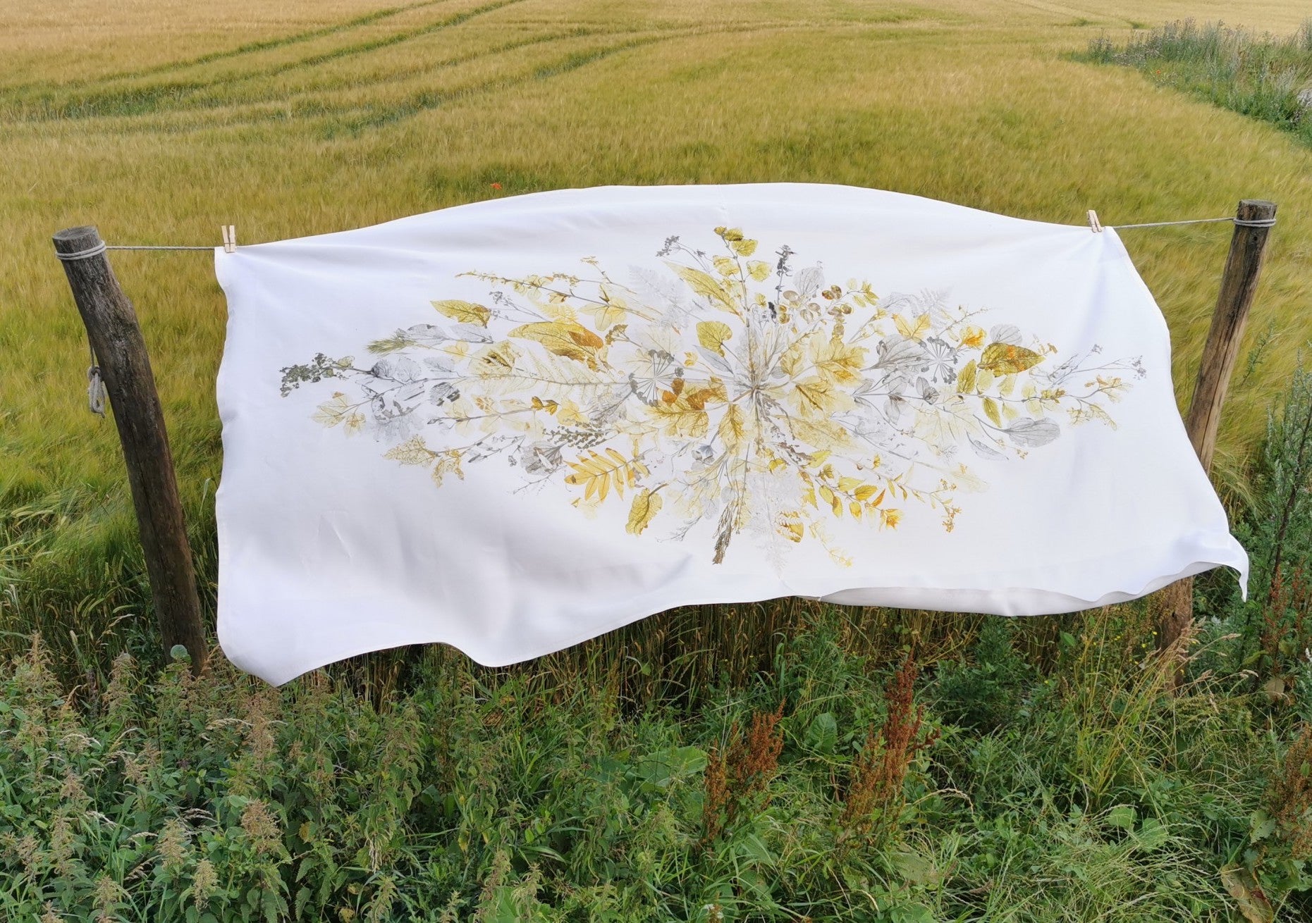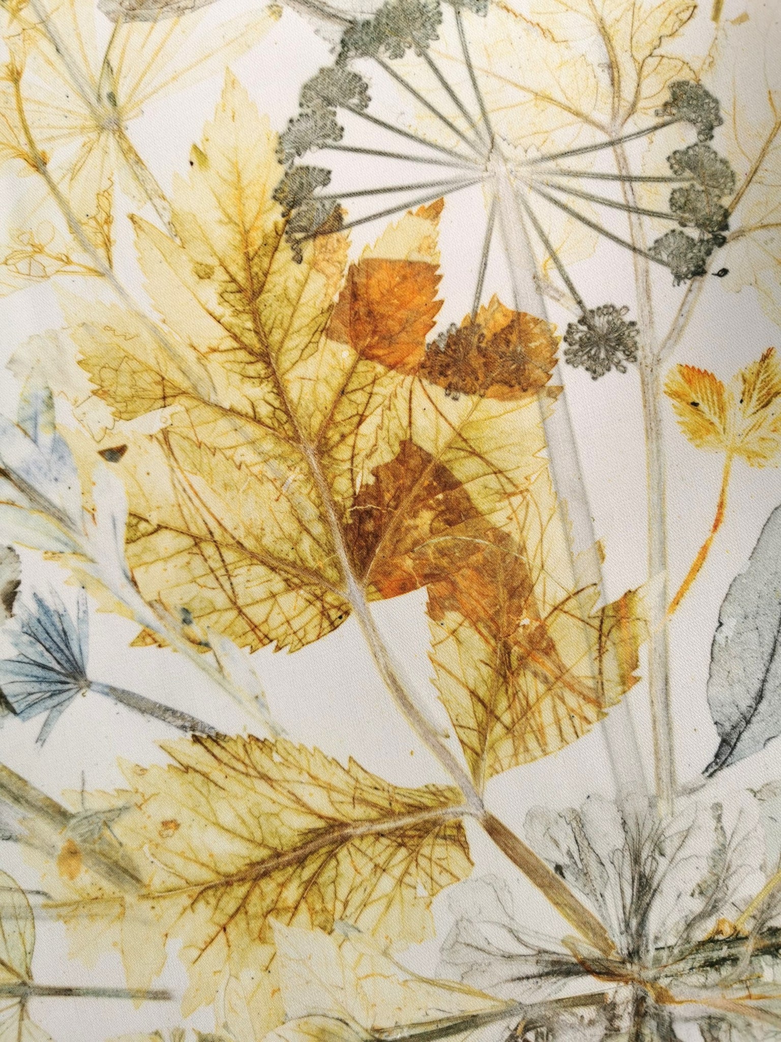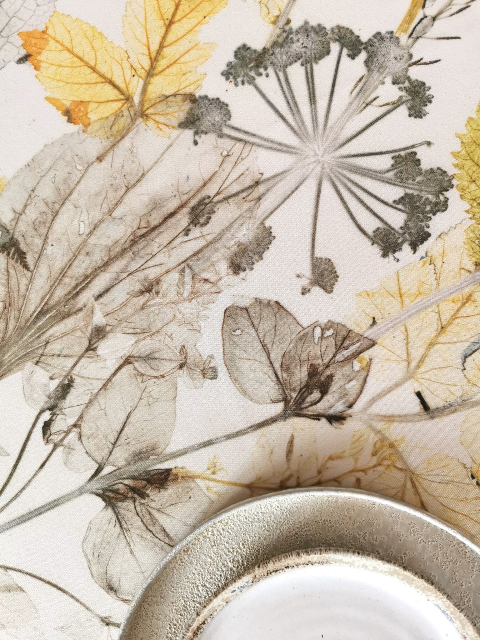 Local plants have been carefully collected, dried, painted and then pressed directly on the fabric which leaves a very precise single edition imprint.