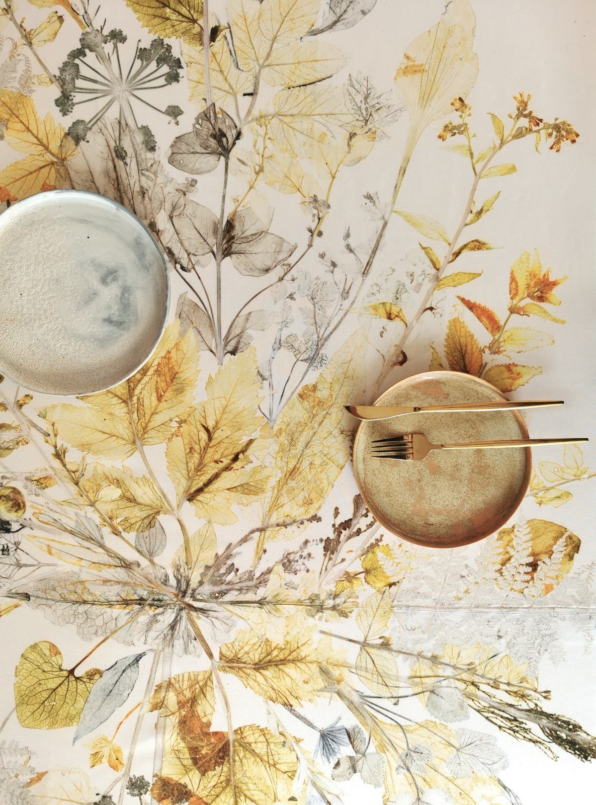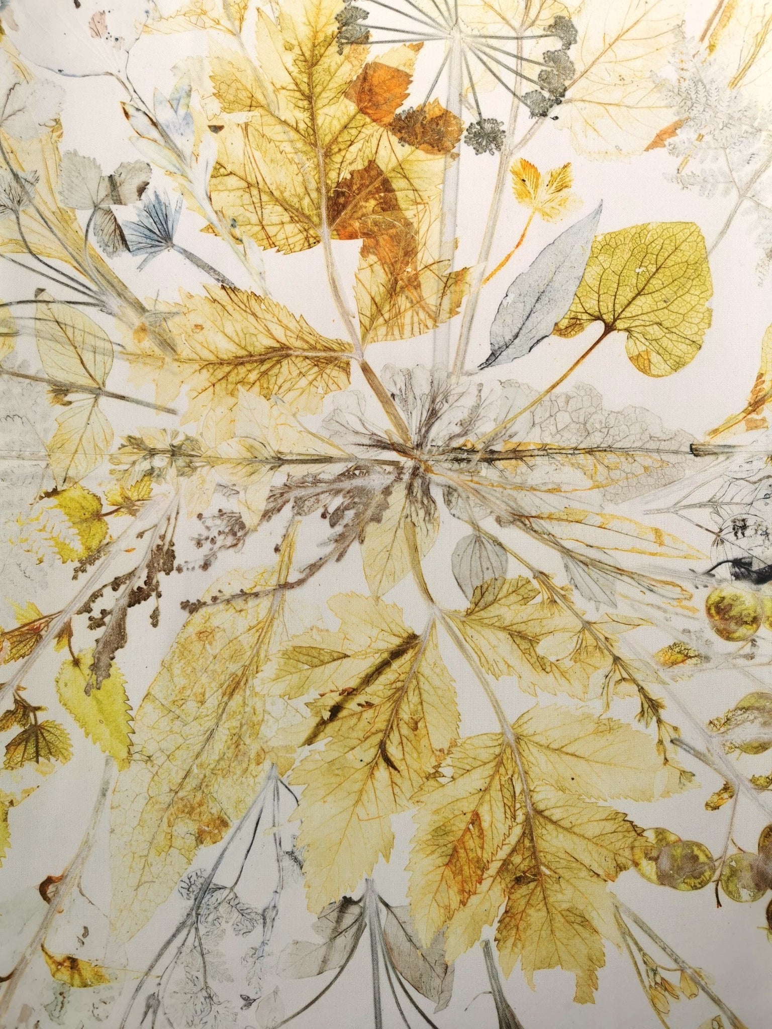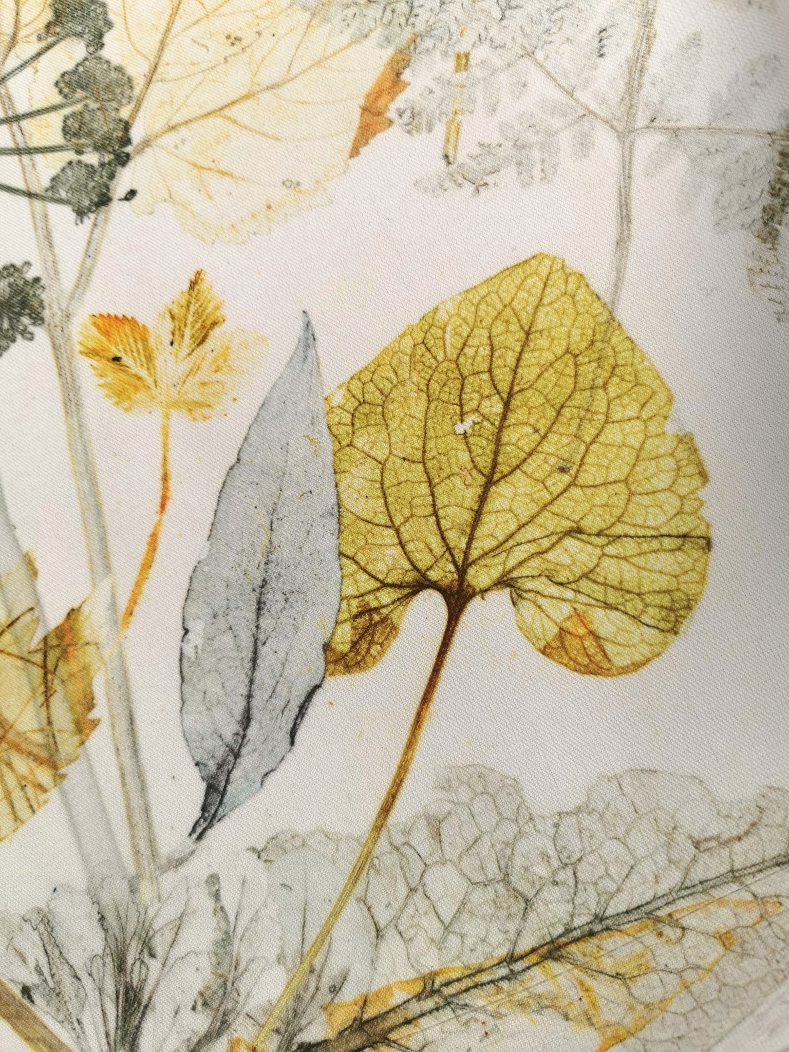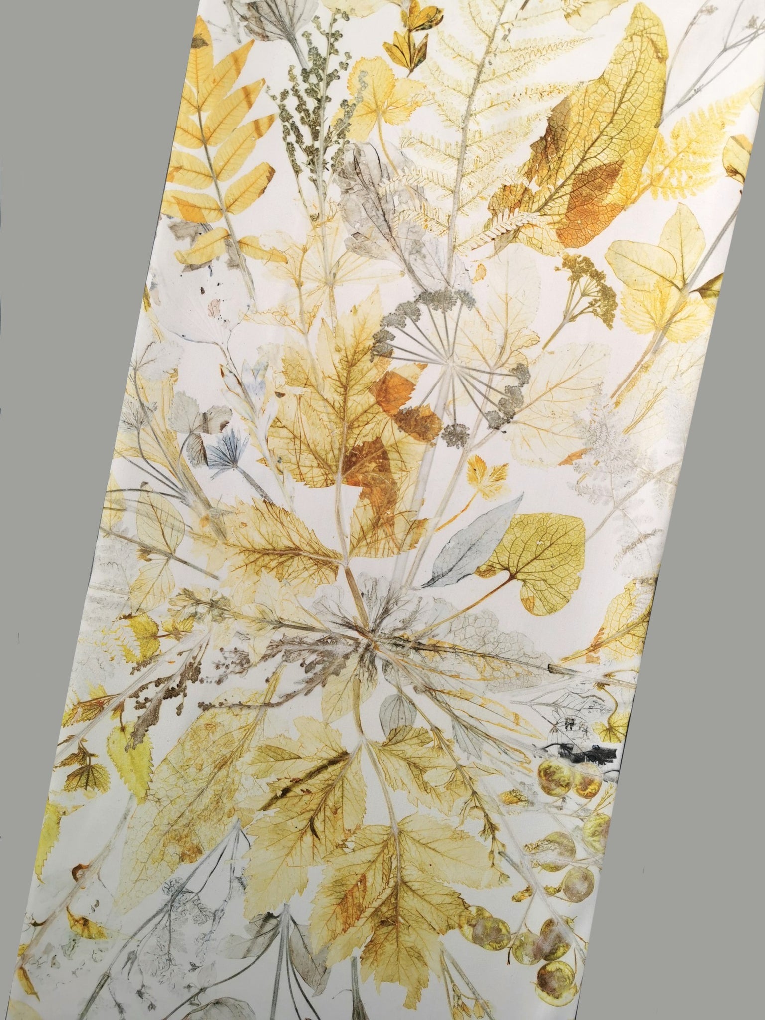 Local plants have been carefully collected, dried, painted and then pressed directly on the fabric which leaves a very precise single edition imprint.