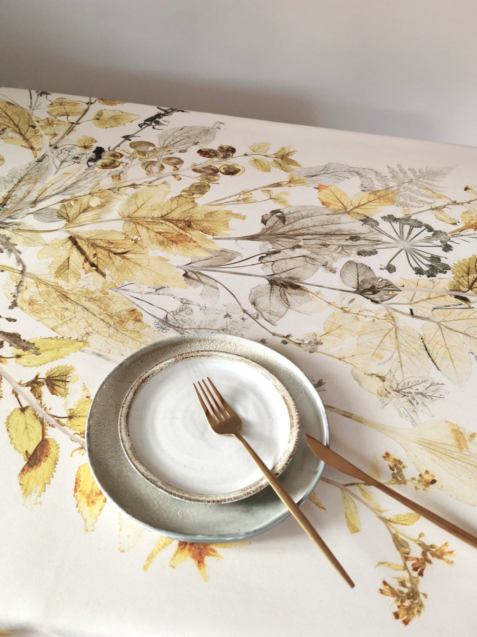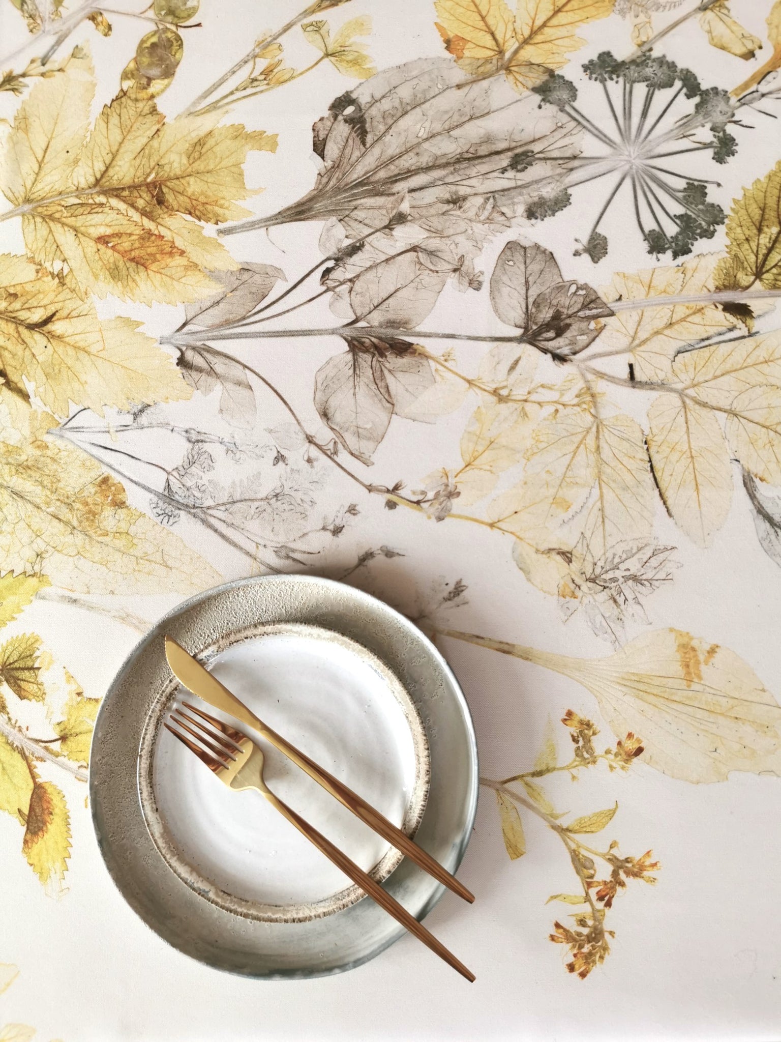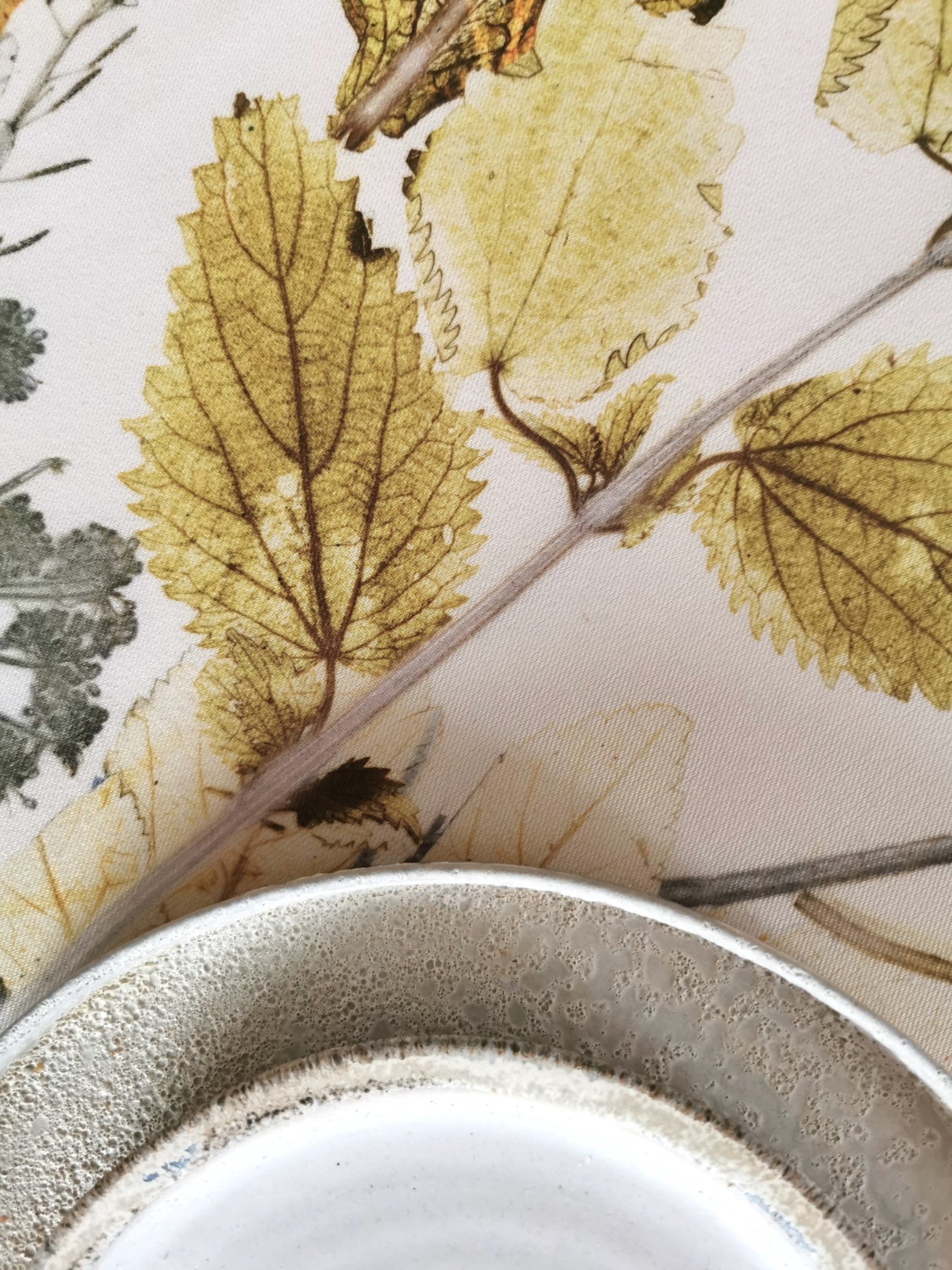 All table linens have an unique plant motif, which is handmade locally in the studio at Ulriksholm Slot near Kerteminde // Denmark; so there is exclusively one of each piece since the monoprint cannot be duplicated.