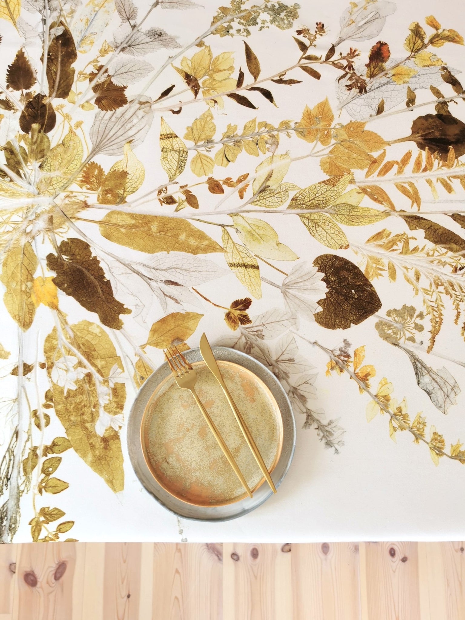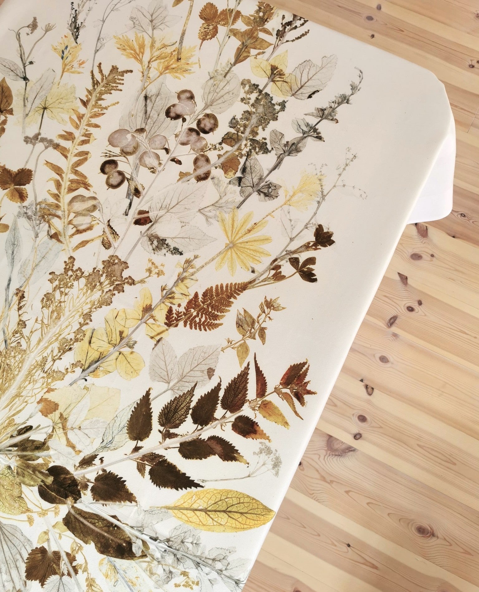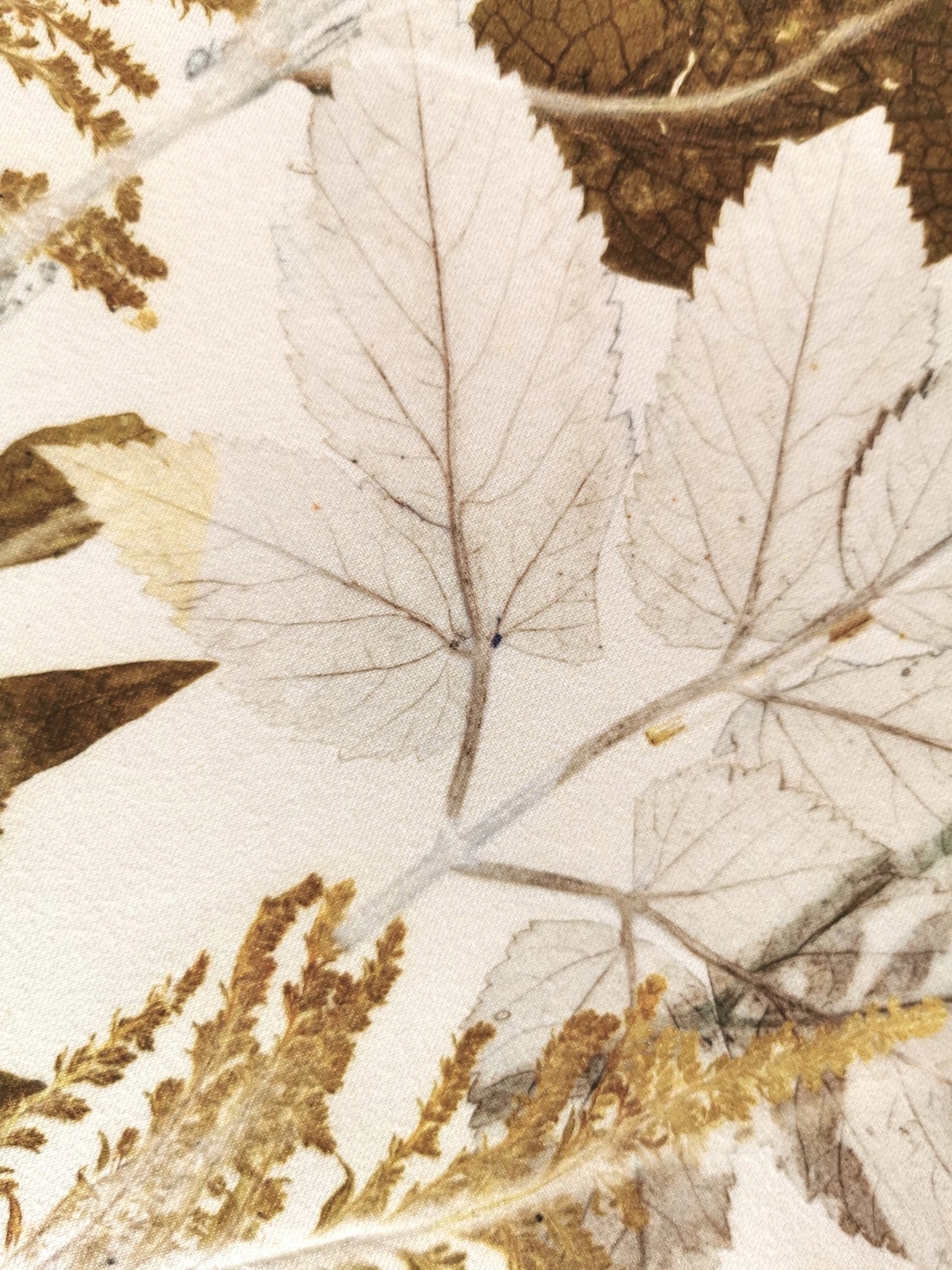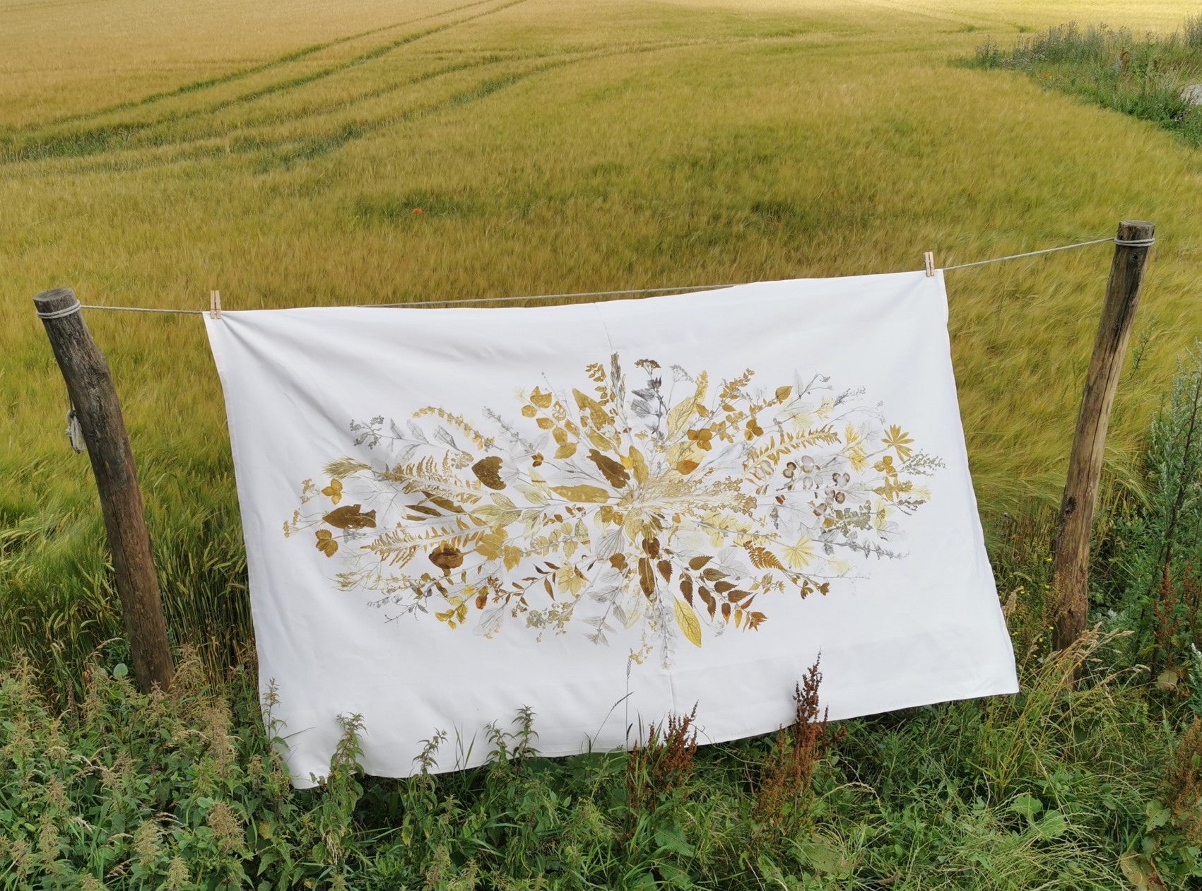 Local plants have been carefully collected, dried, painted and then pressed directly on the fabric which leaves a very precise single edition imprint.