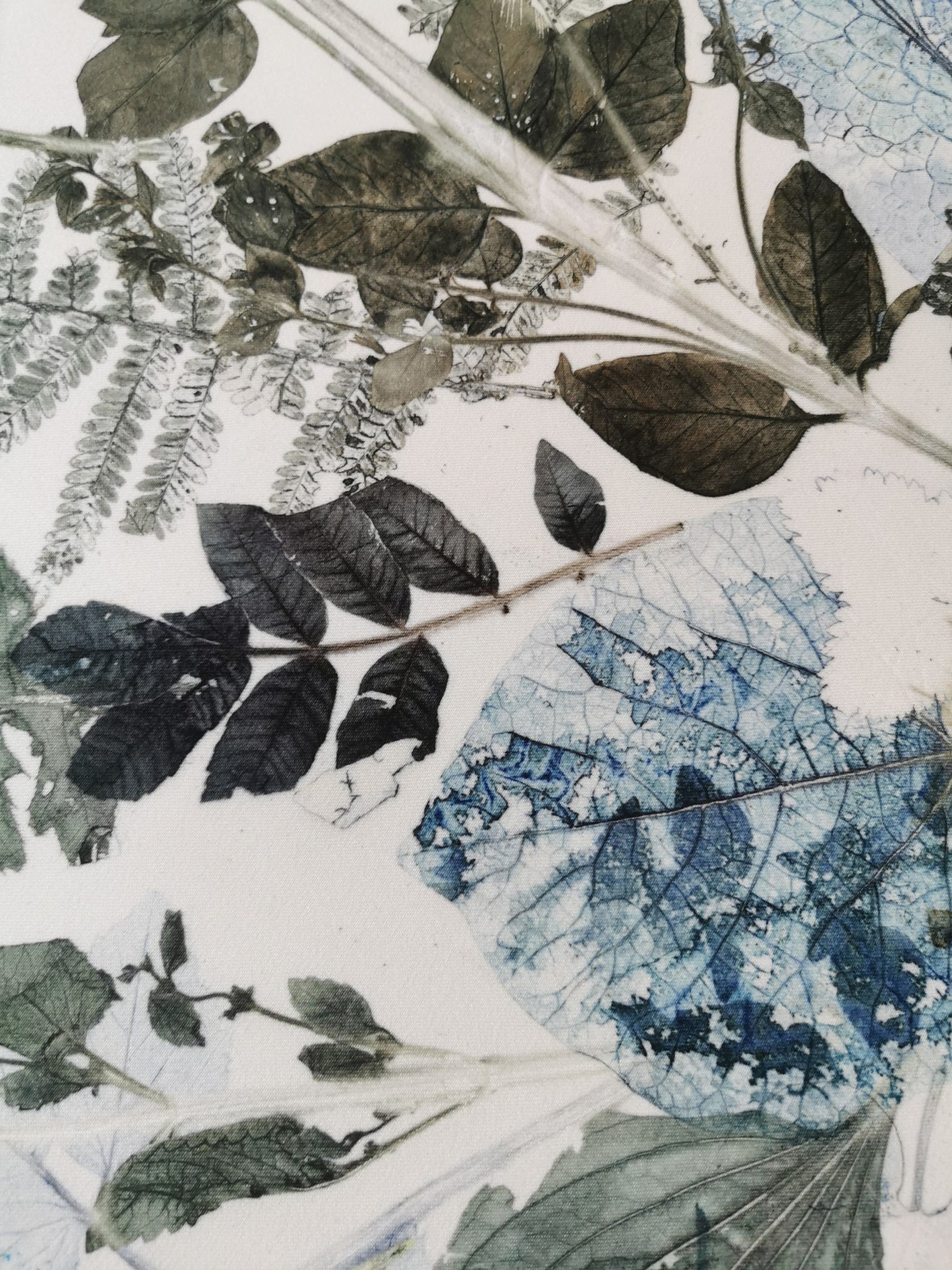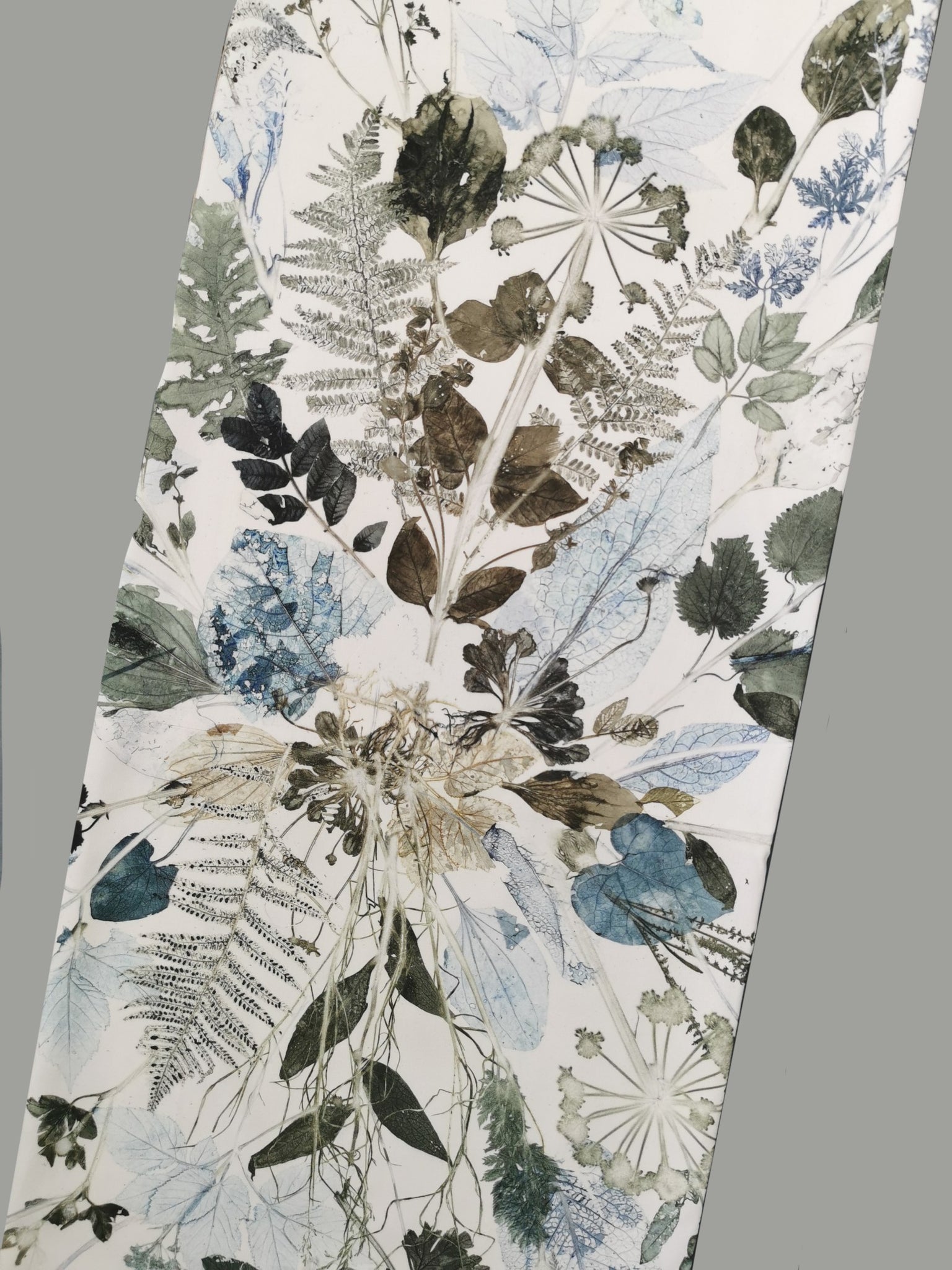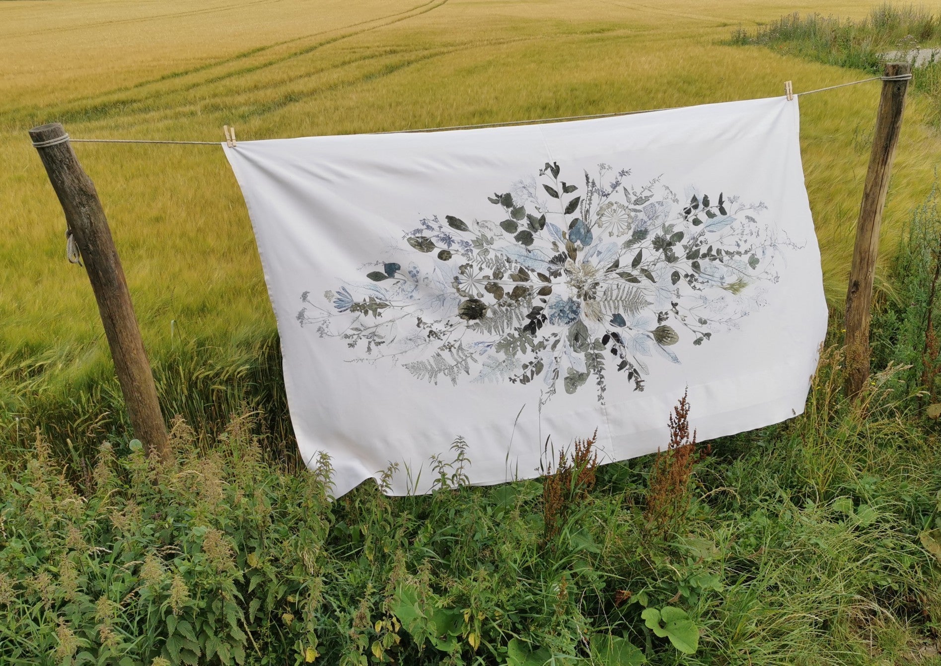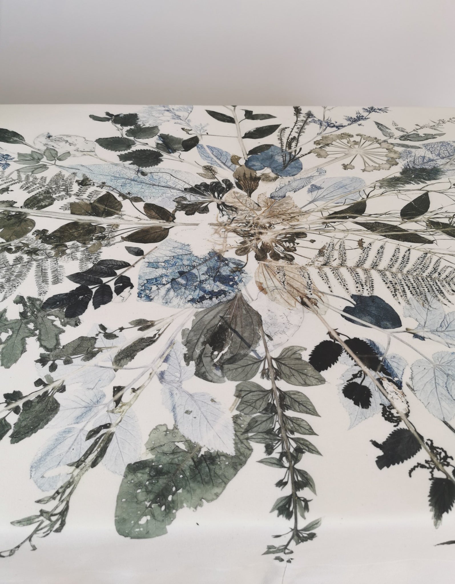 Local plants have been carefully collected, dried, painted and then pressed directly on the fabric which leaves a very precise single edition imprint.