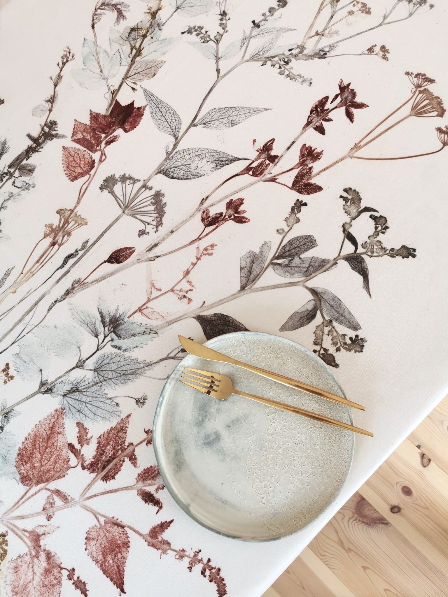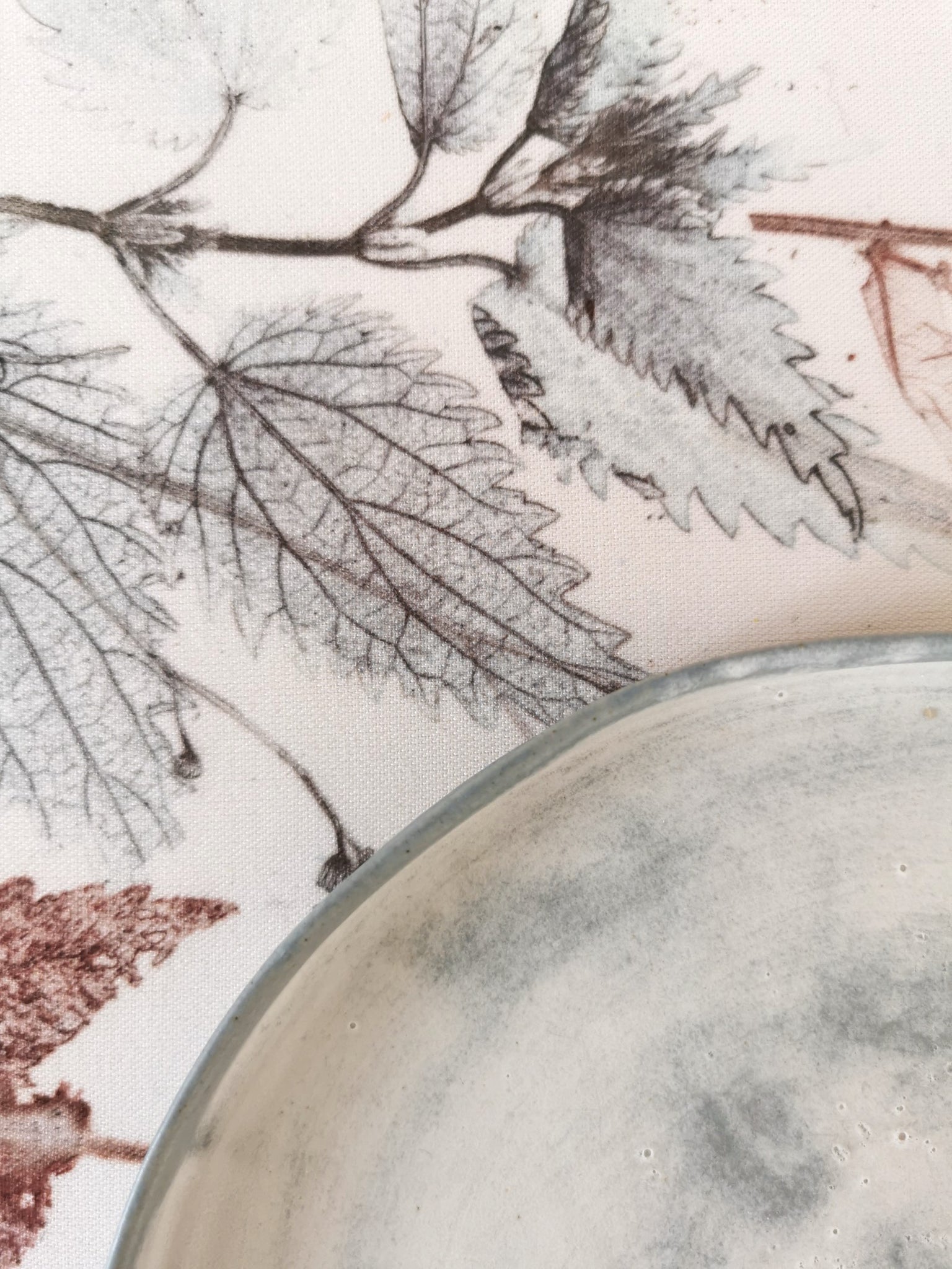 All table linens have an unique plant motif, which is handmade locally in the studio at Ulriksholm Slot near Kerteminde // Denmark; so there is exclusively one of each piece since the monoprint cannot be duplicated.