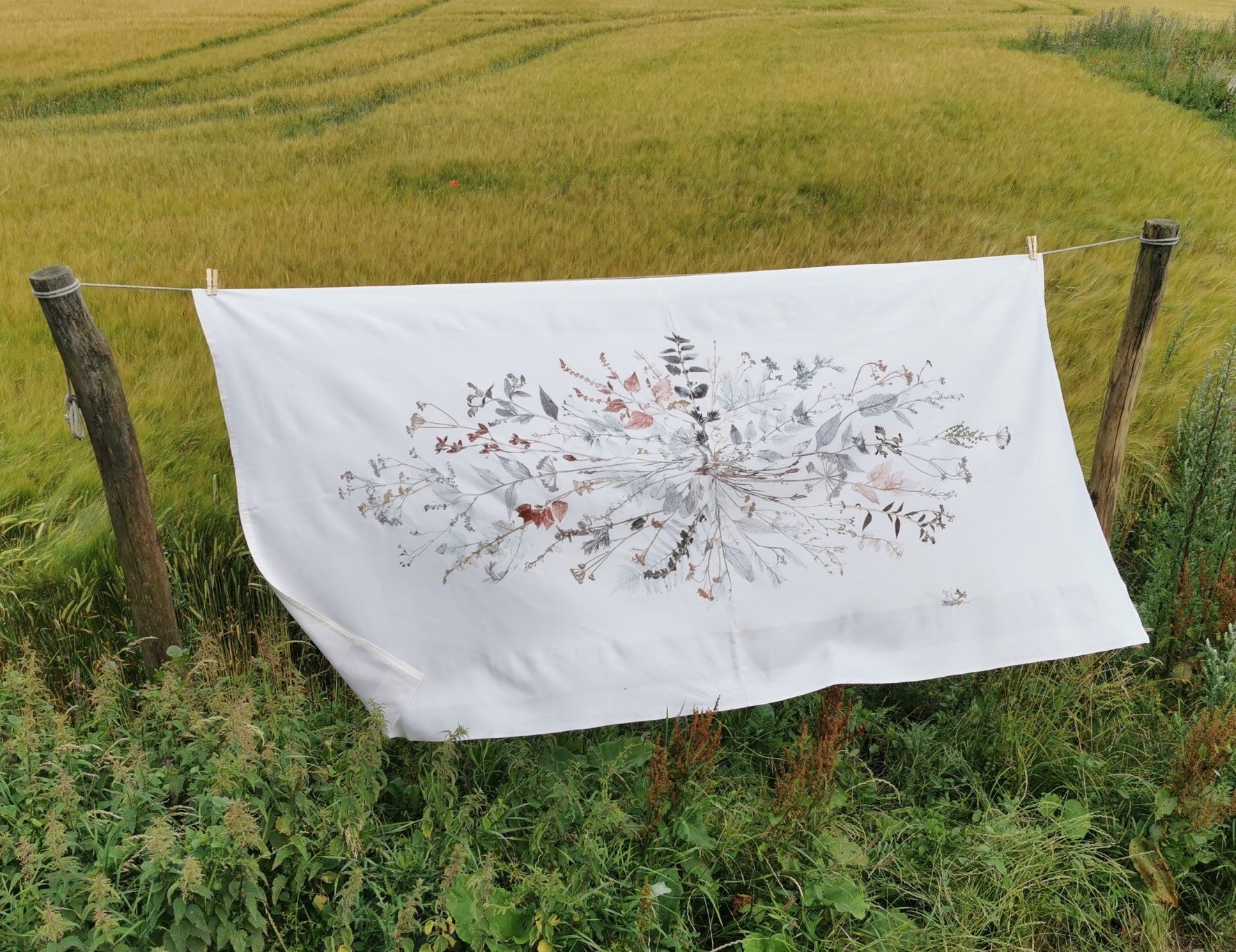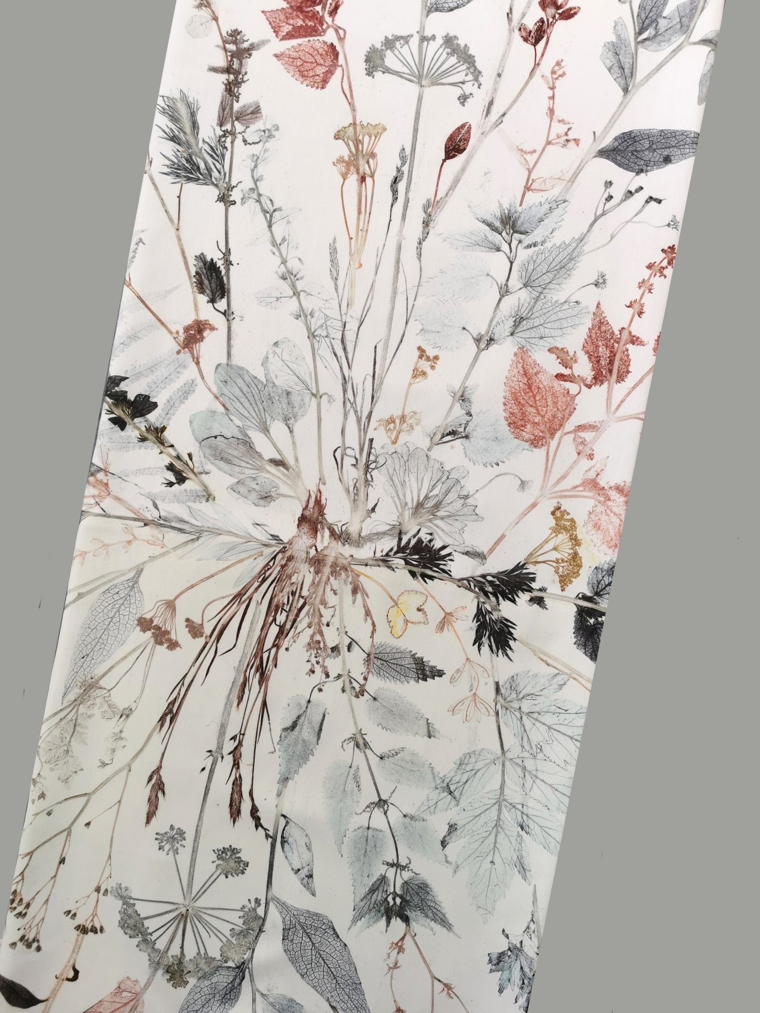 Local plants have been carefully collected, dried, painted and then pressed directly on the fabric which leaves a very precise single edition imprint.