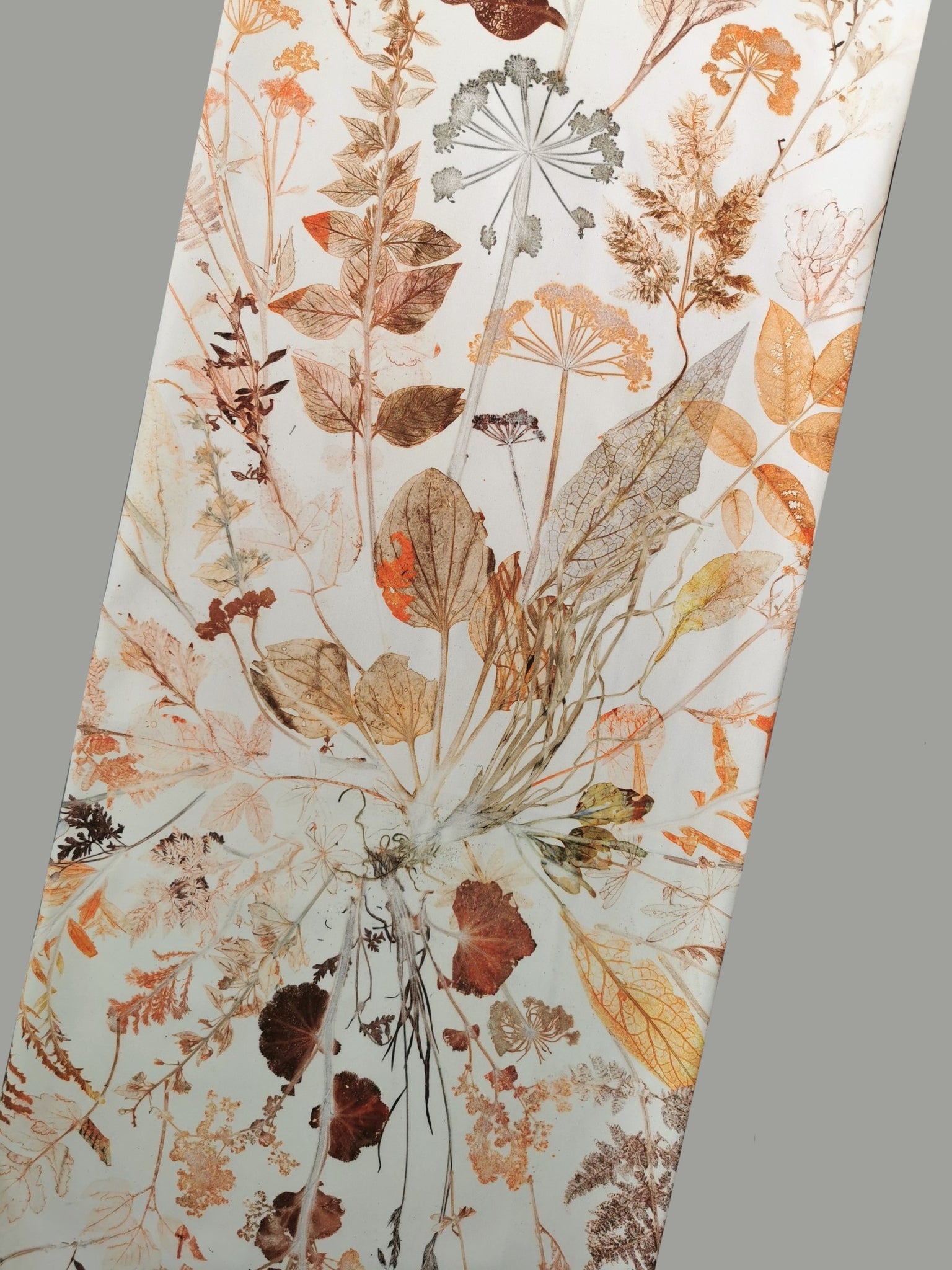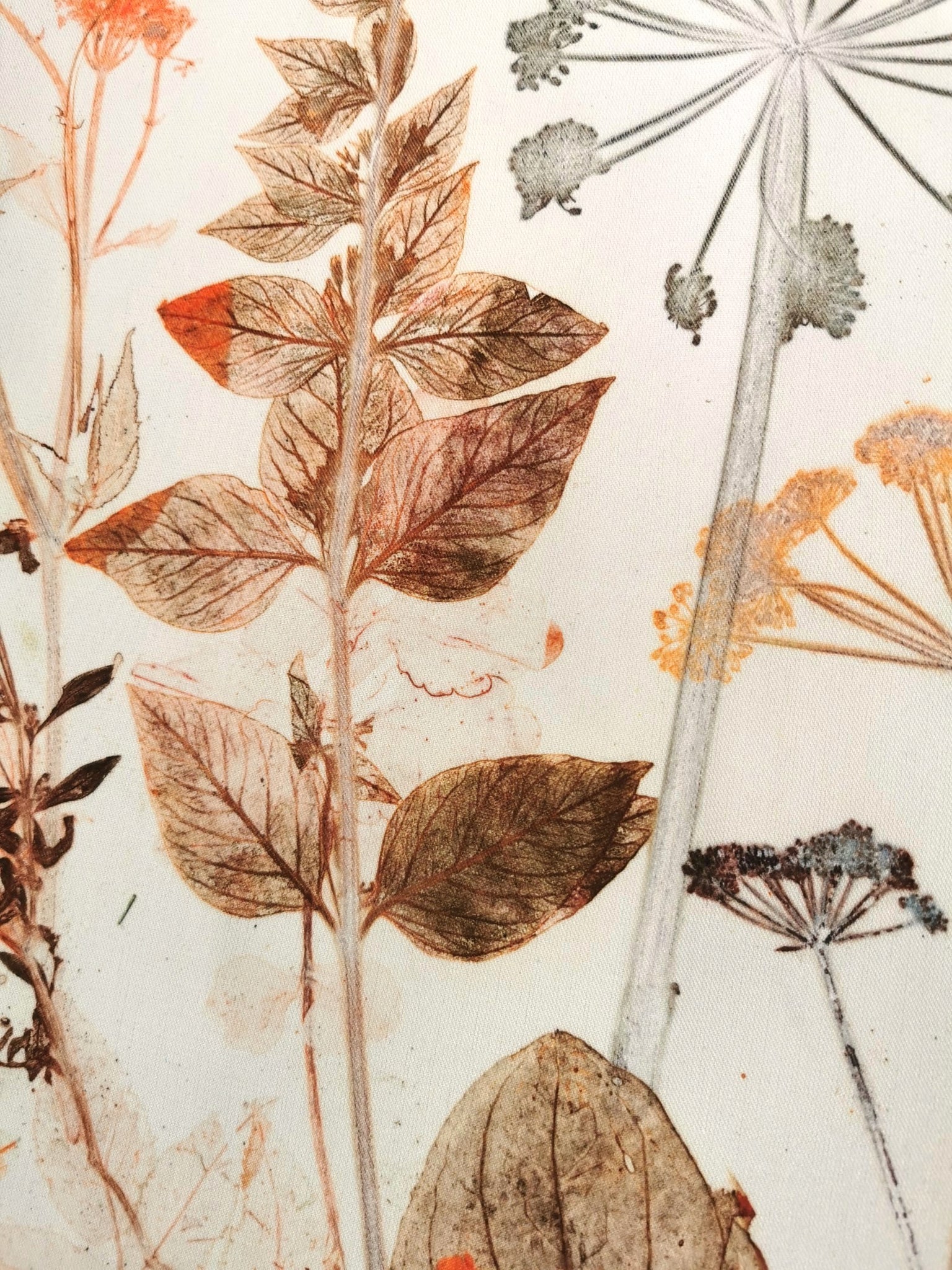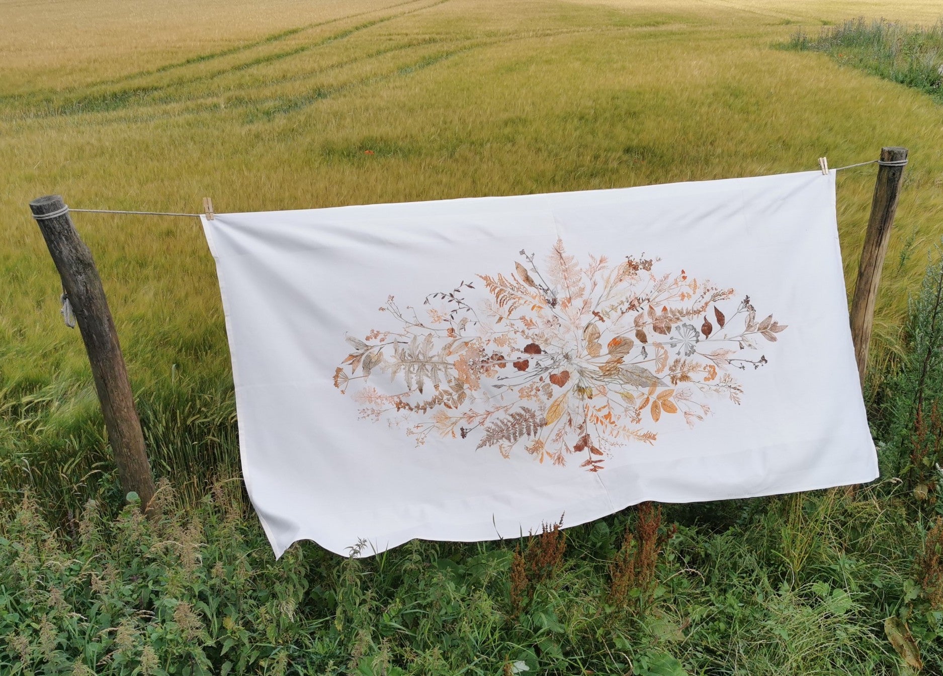 Local plants have been carefully collected, dried, painted and then pressed directly on the fabric which leaves a very precise single edition imprint.