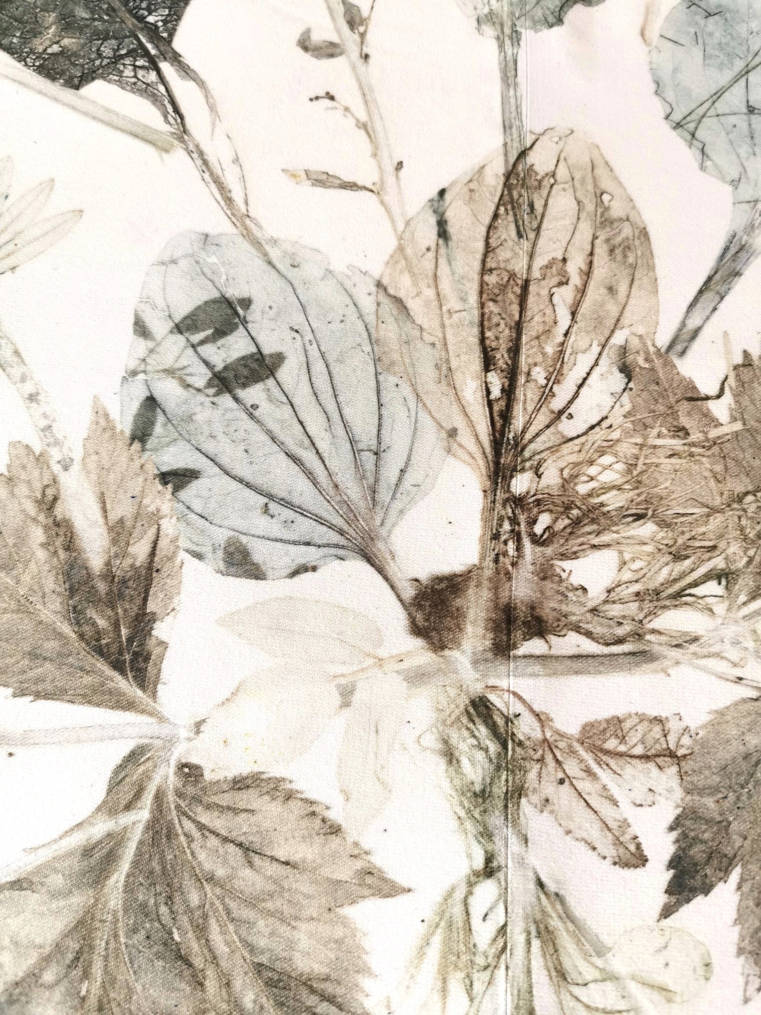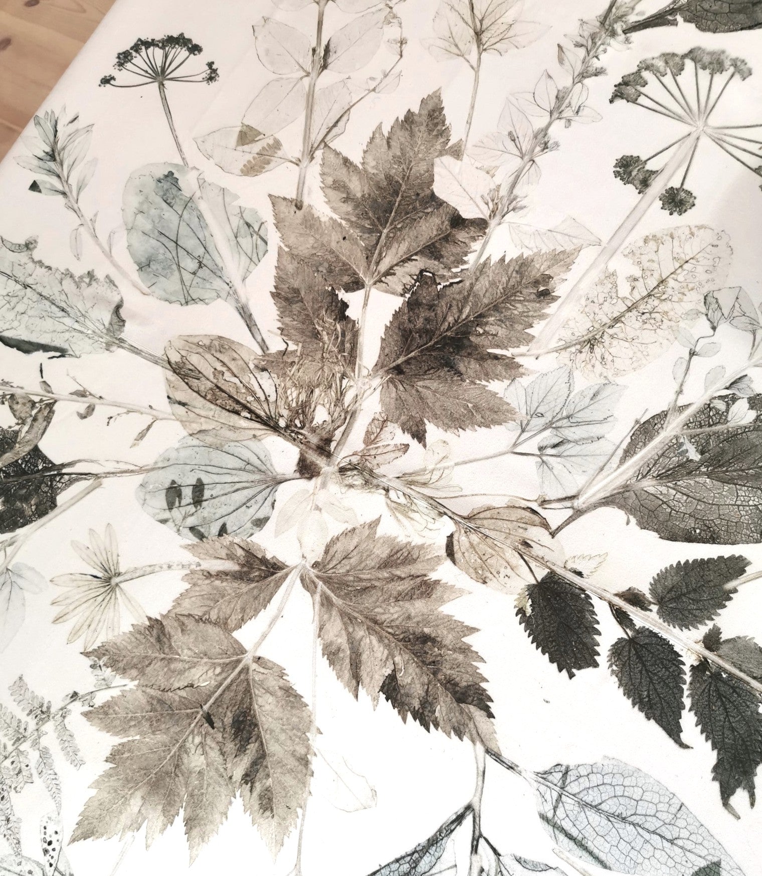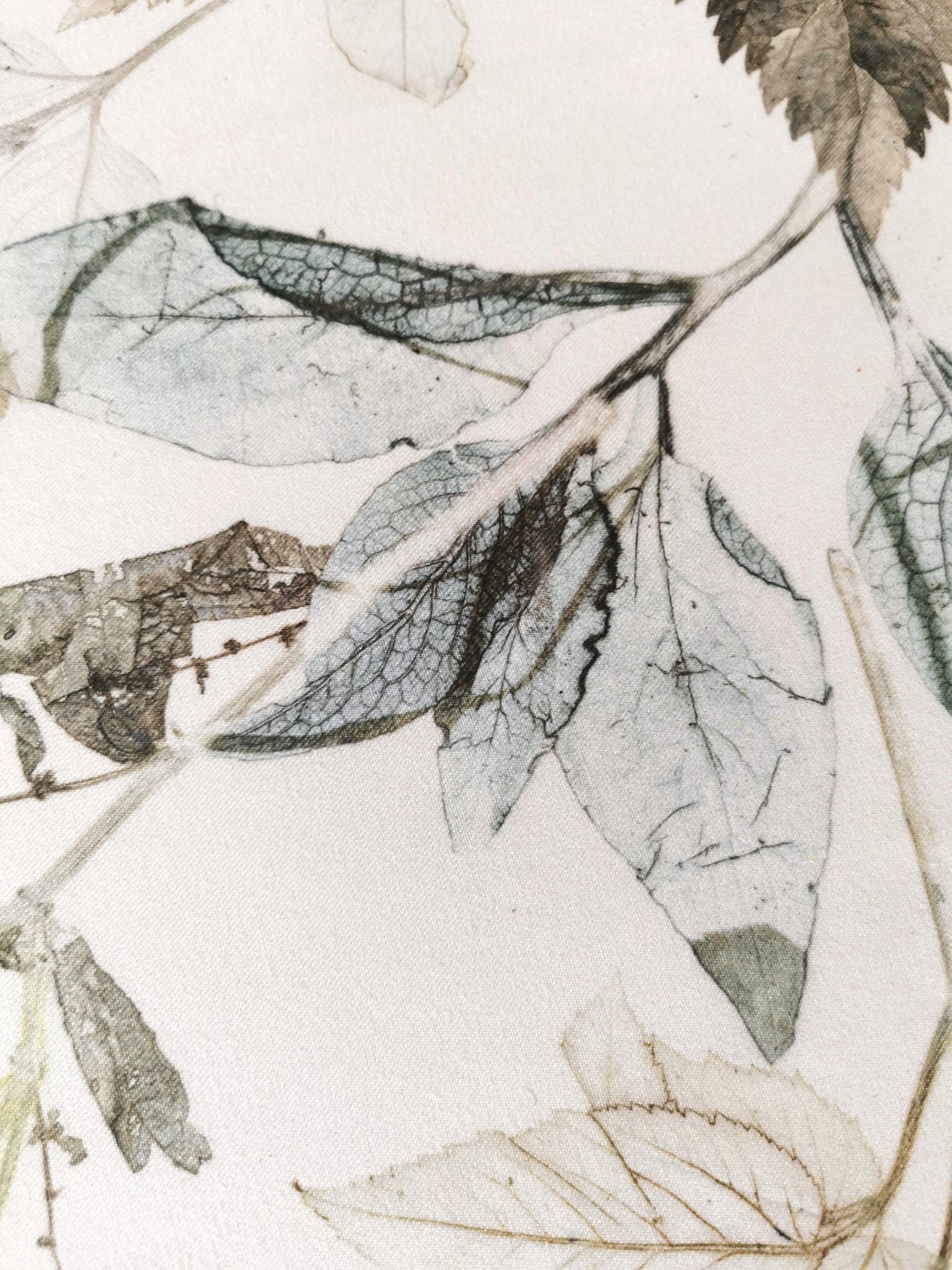 Local plants have been carefully collected, dried, painted and then pressed directly on the fabric which leaves a very precise single edition imprint.