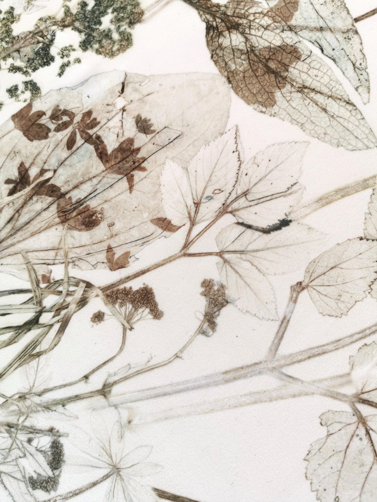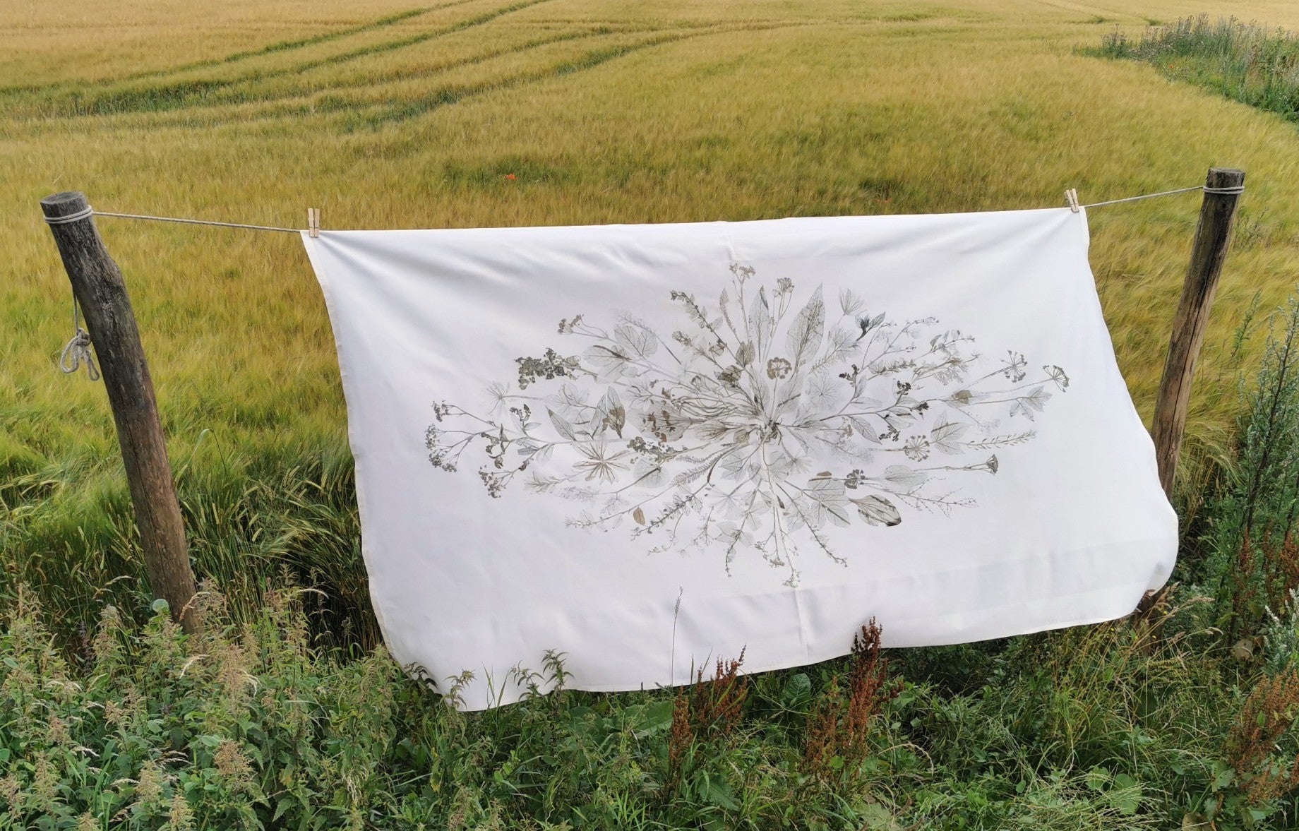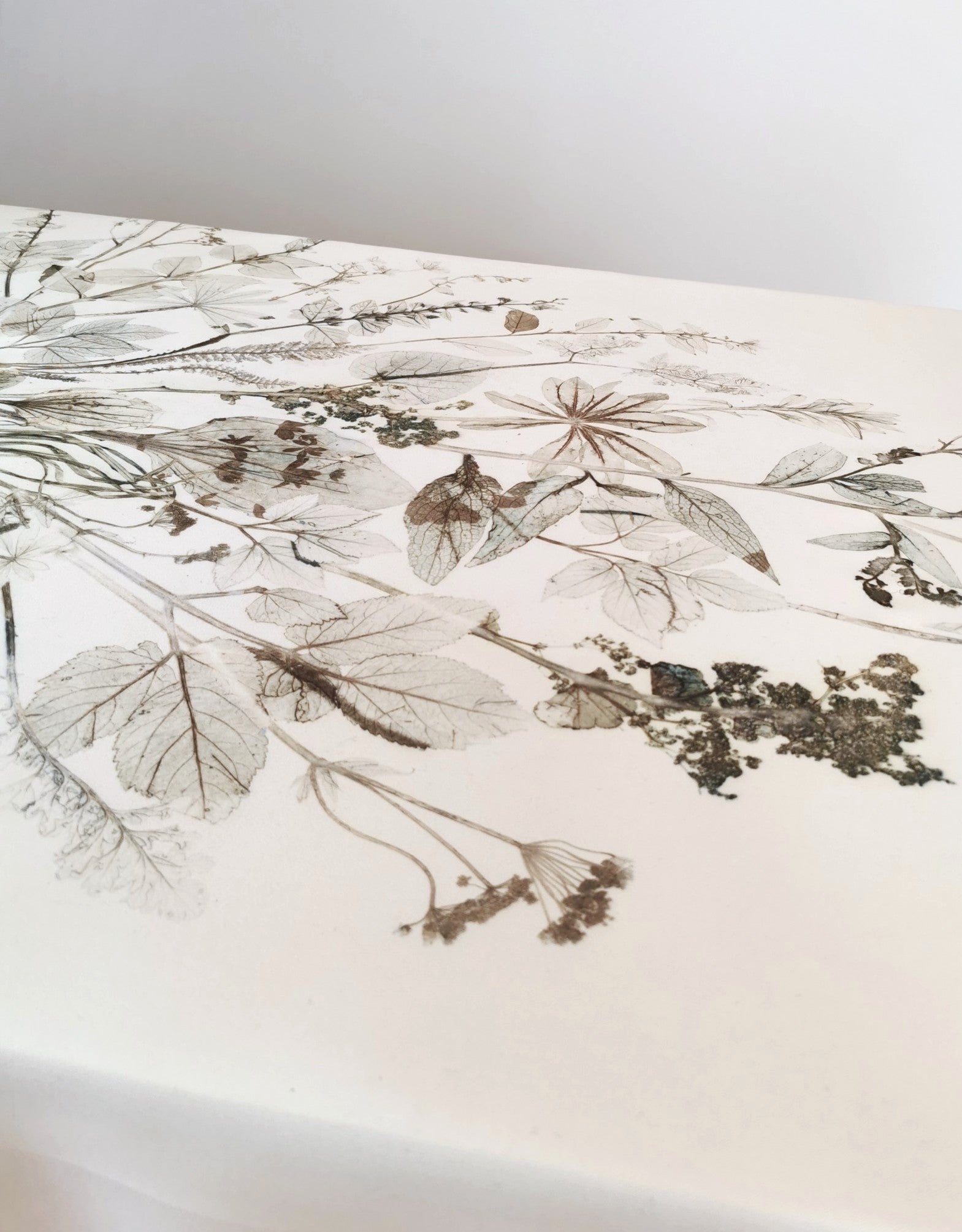 Local plants have been carefully collected, dried, painted and then pressed directly on the fabric which leaves a very precise single edition imprint.