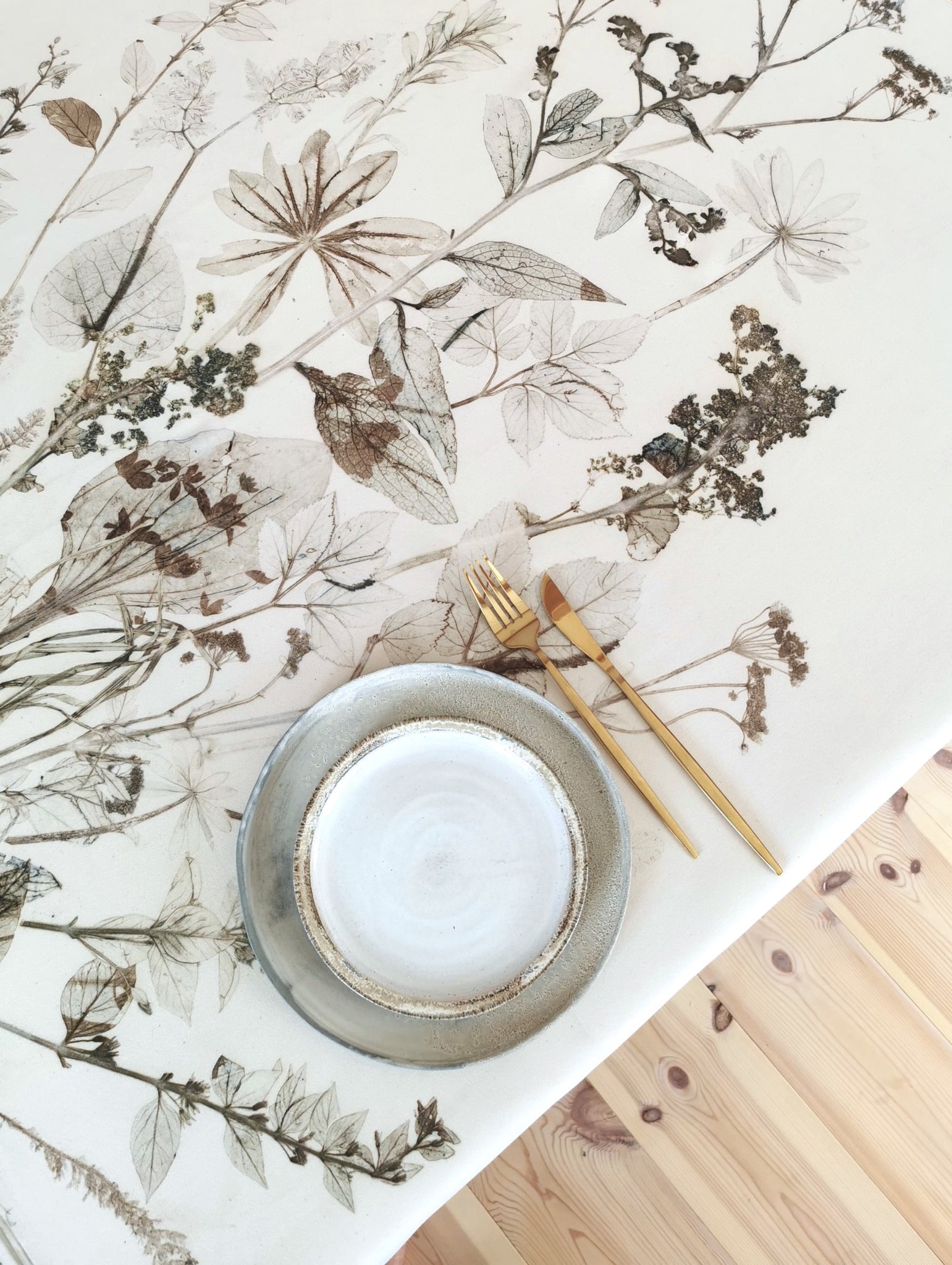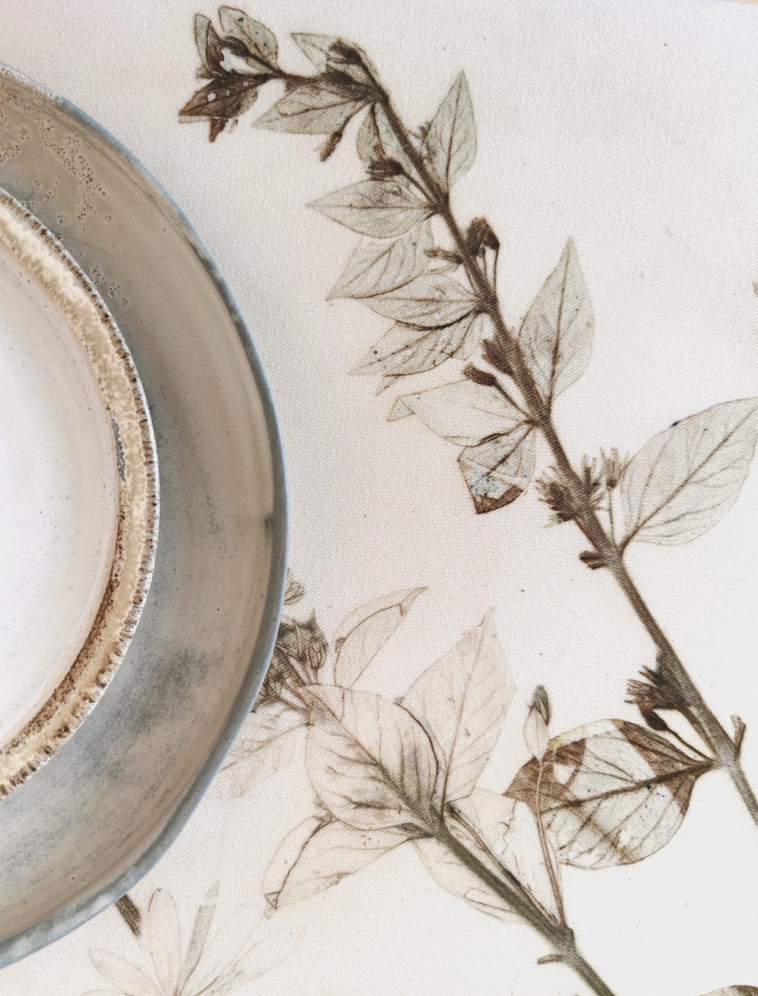 All table linens have an unique plant motif, which is handmade locally in the studio at Ulriksholm Slot near Kerteminde // Denmark; so there is exclusively one of each piece since the monoprint cannot be duplicated.