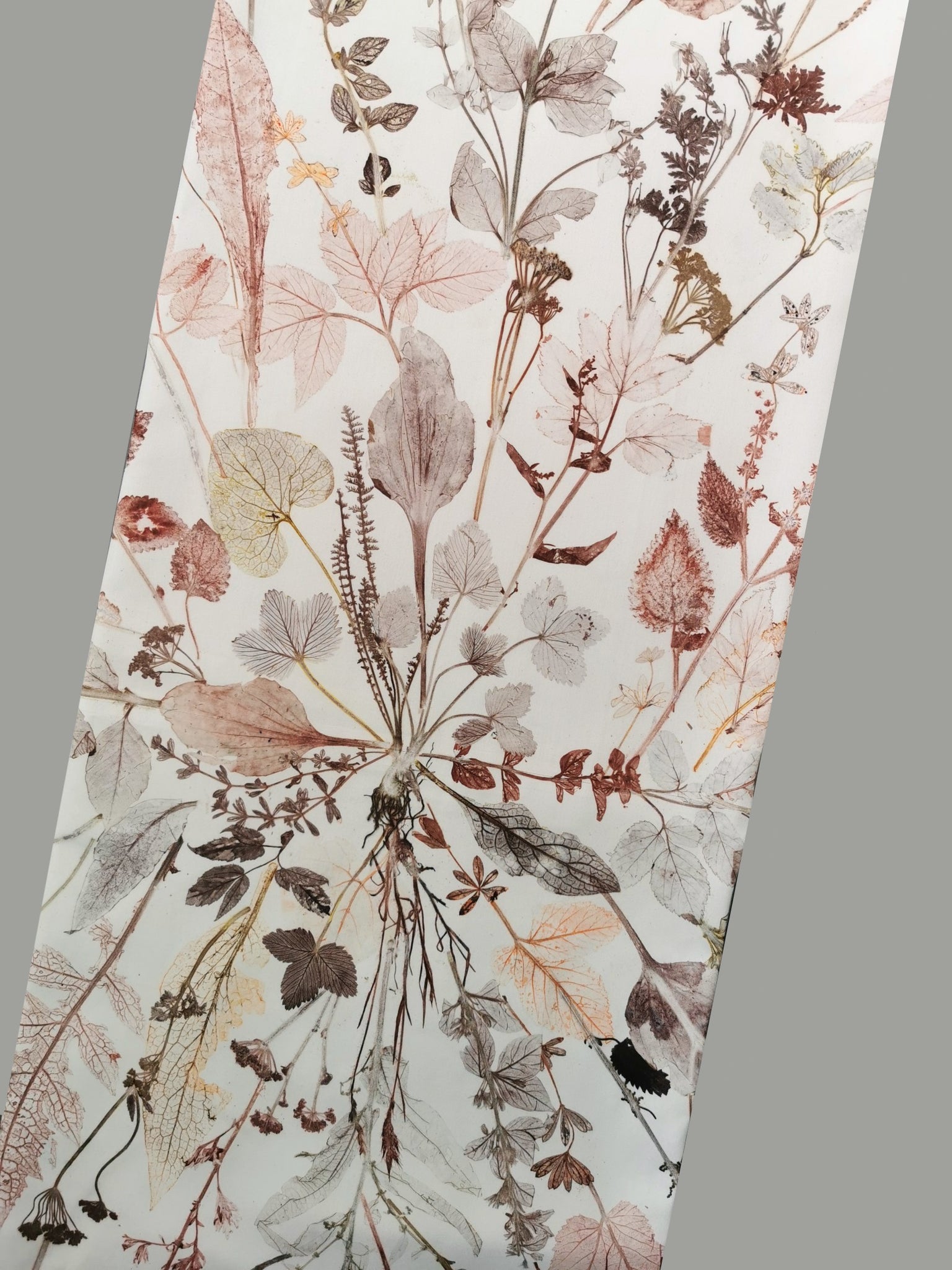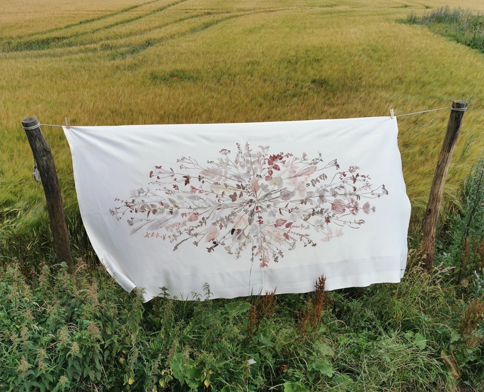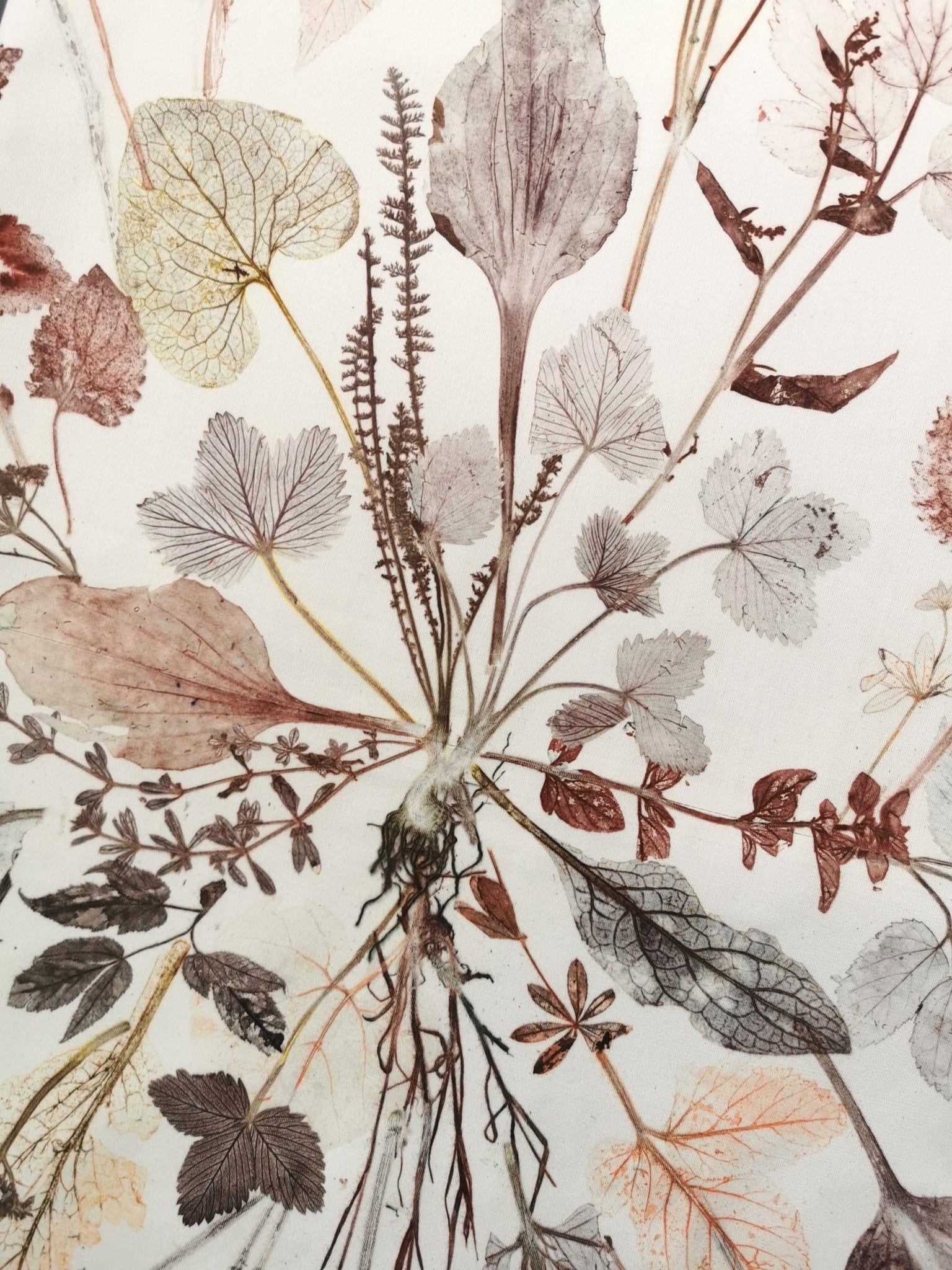 Local plants have been carefully collected, dried, painted and then pressed directly on the fabric which leaves a very precise single edition imprint.