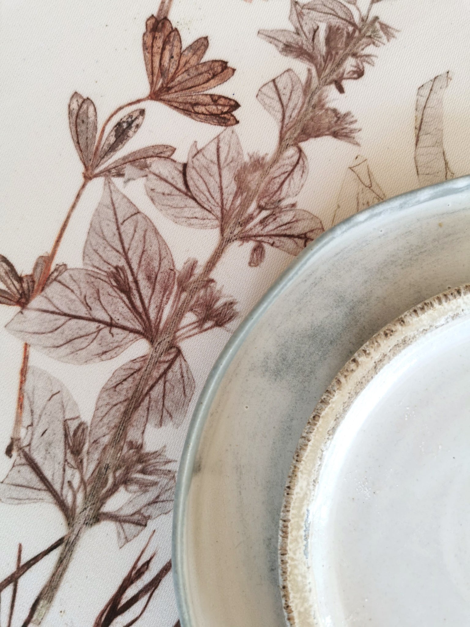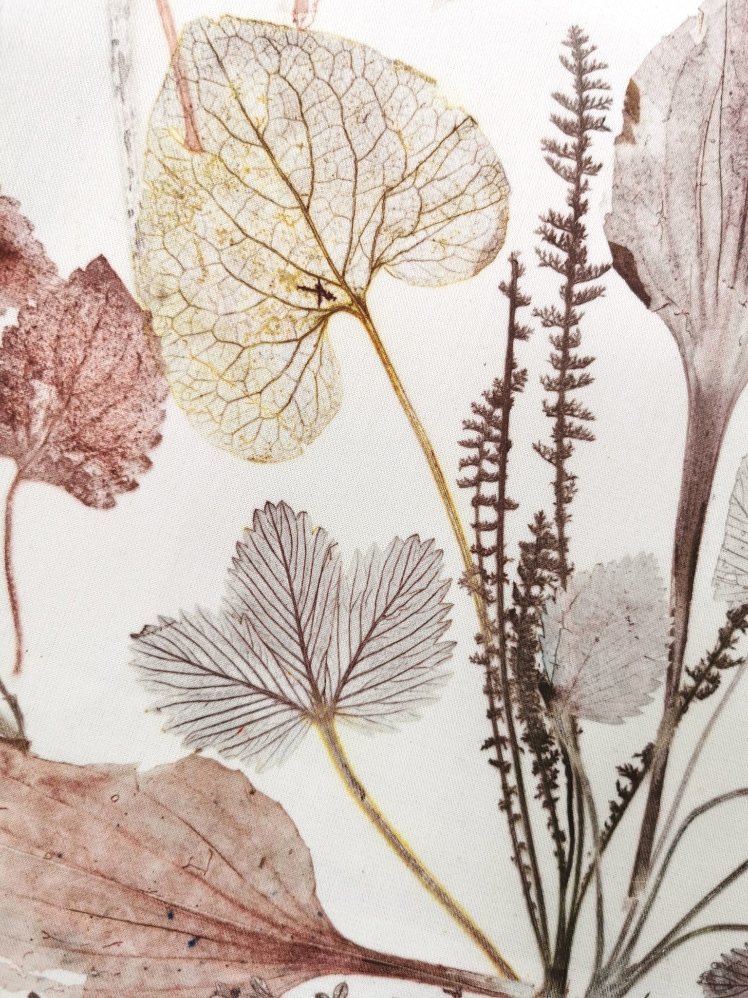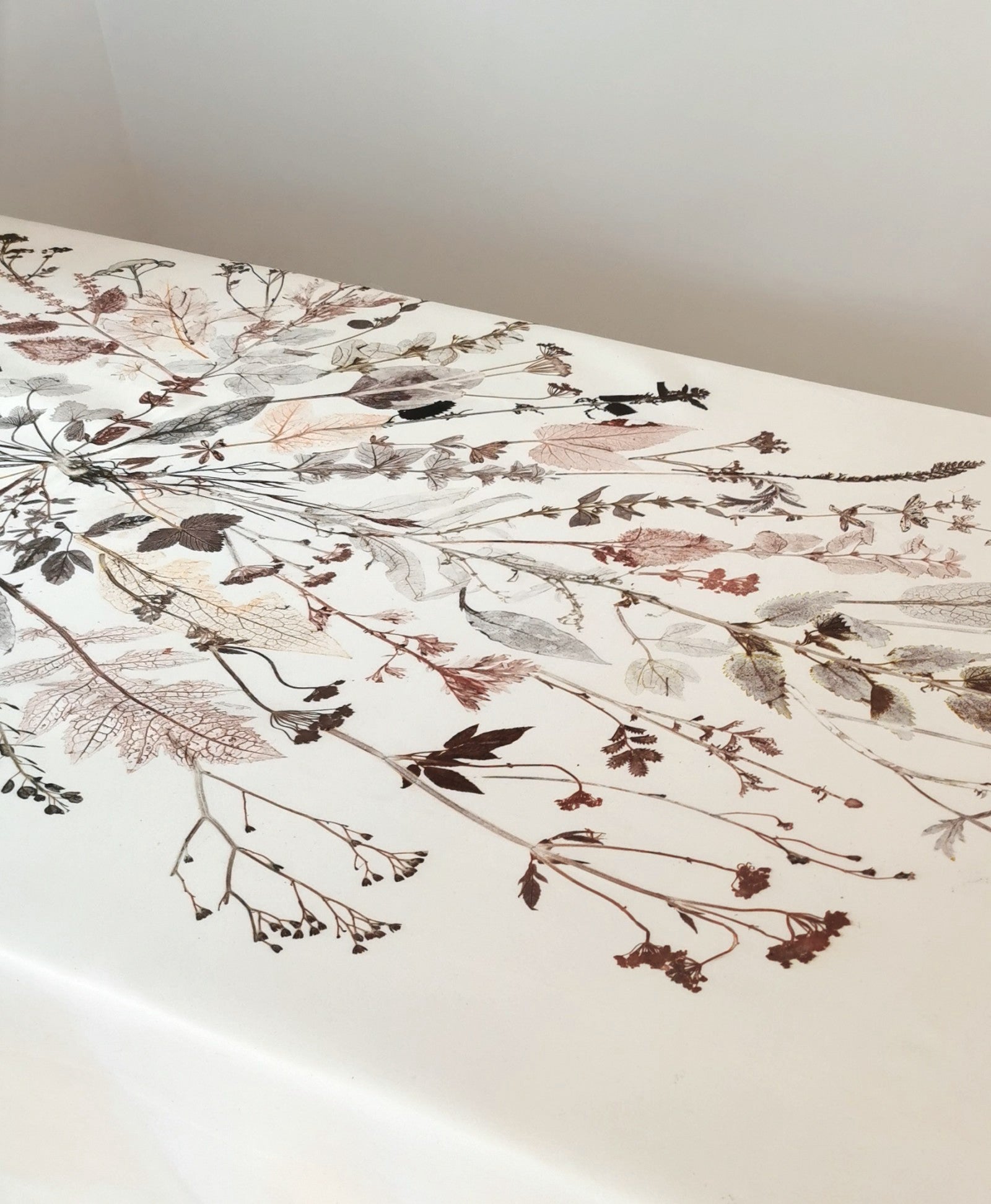 Local plants have been carefully collected, dried, painted and then pressed directly on the fabric which leaves a very precise single edition imprint.