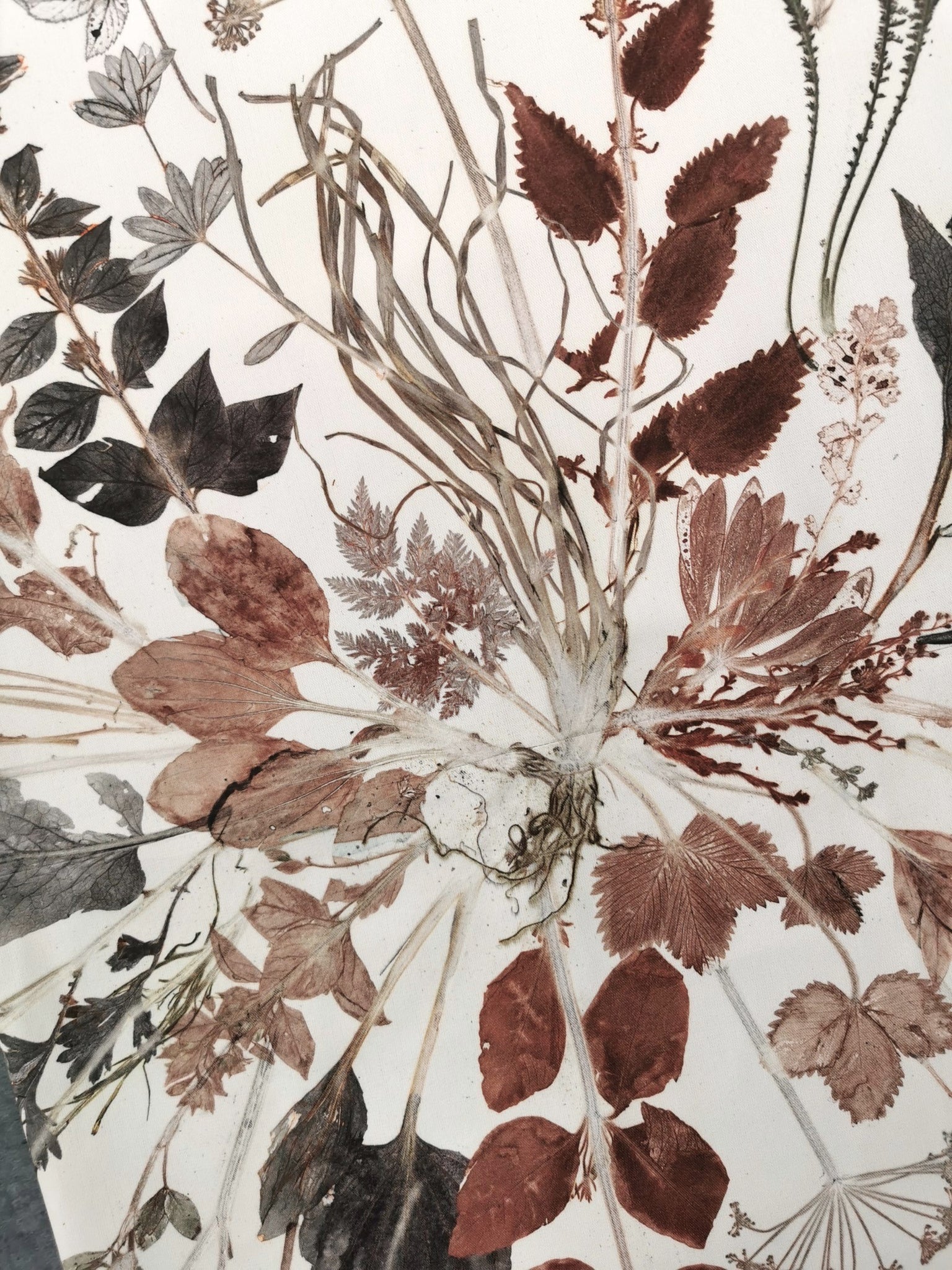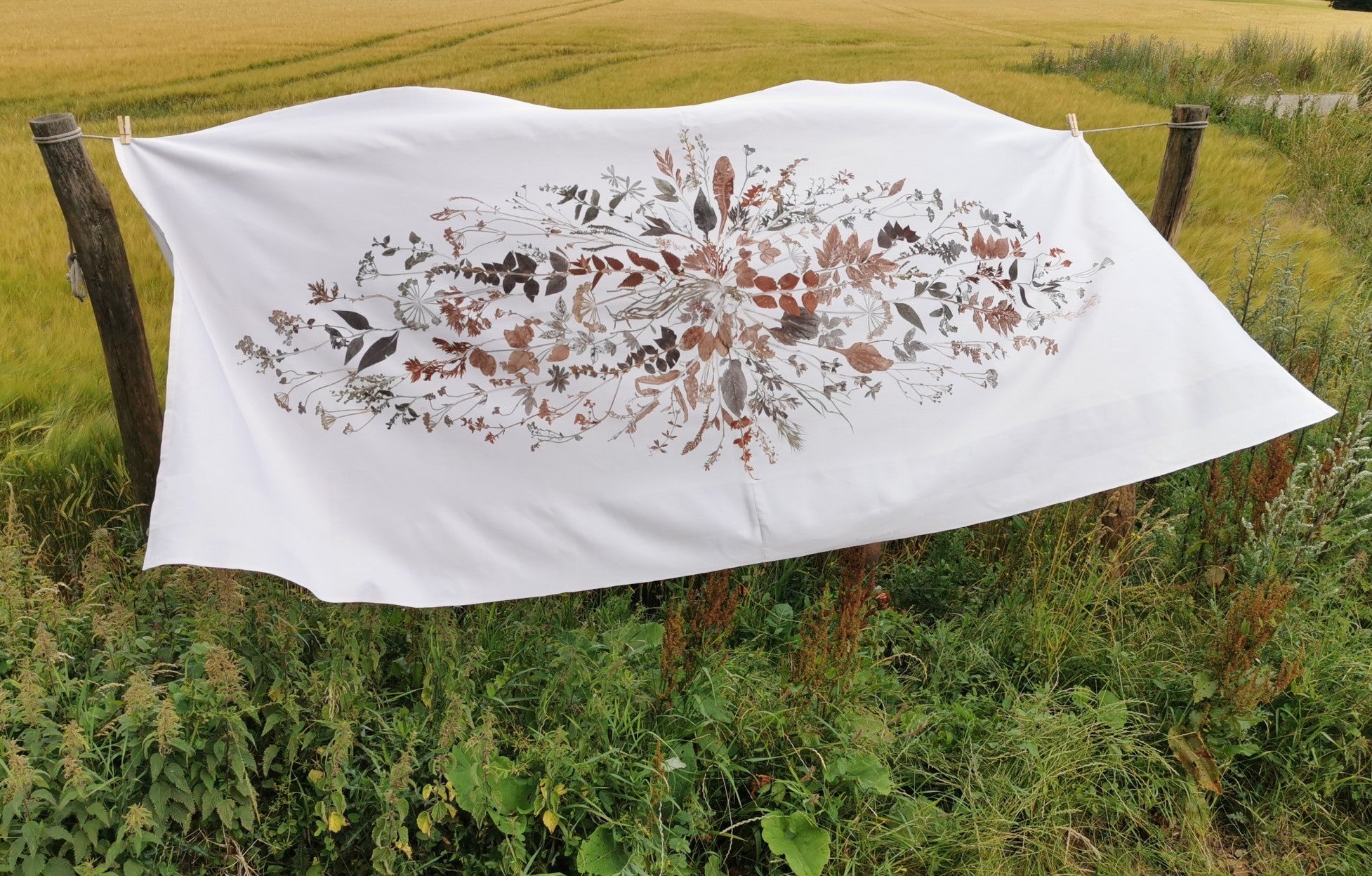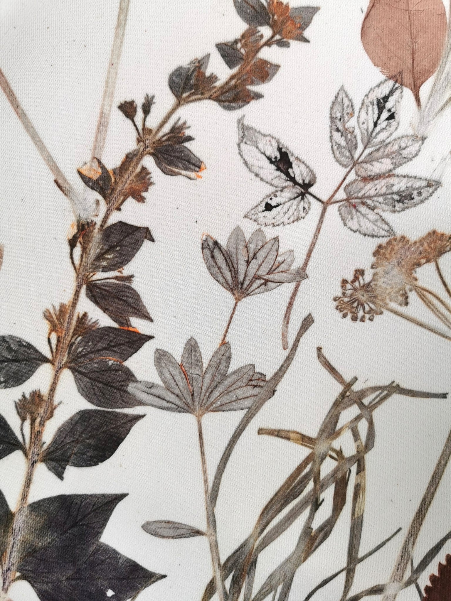 Local plants have been carefully collected, dried, painted and then pressed directly on the fabric which leaves a very precise single edition imprint.
