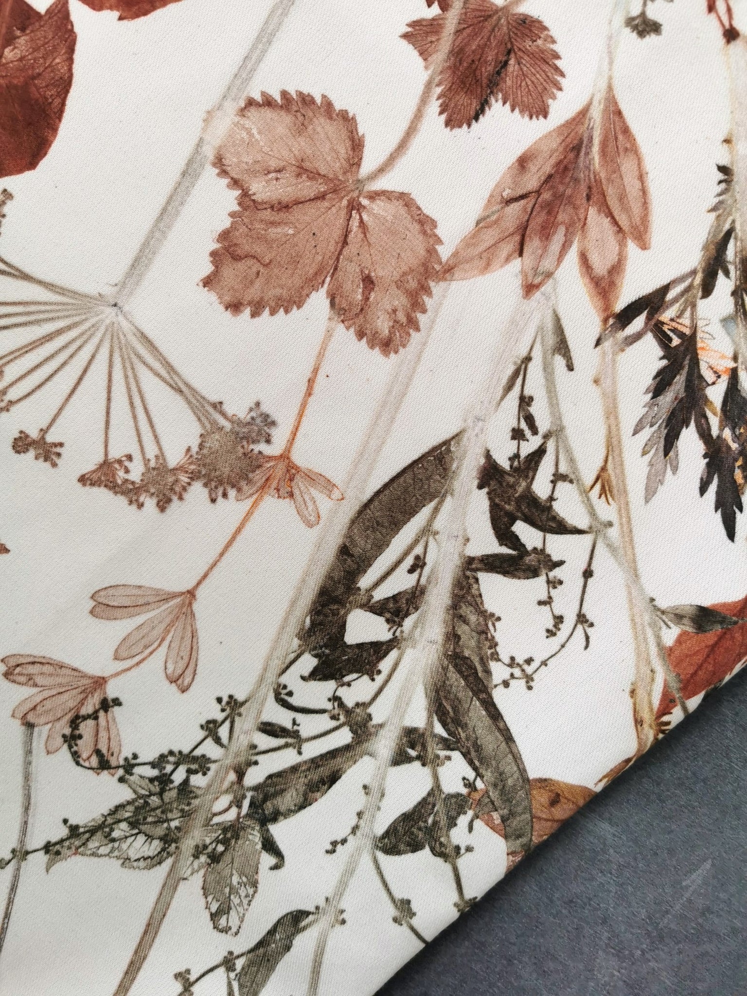 We work entirely with discarded textiles from the Danish industry, and by adding the plant print it is a way of covering traces of use, giving quality materials a second chance. The fabric used is discarded textile in collaboration with Vraa Dampvaskeri, that has a huge passion for re-using quality textiles at the end of their life, instead of letting them go to waste and be burned. Now they are transformed from trash into slow luxury interior design.