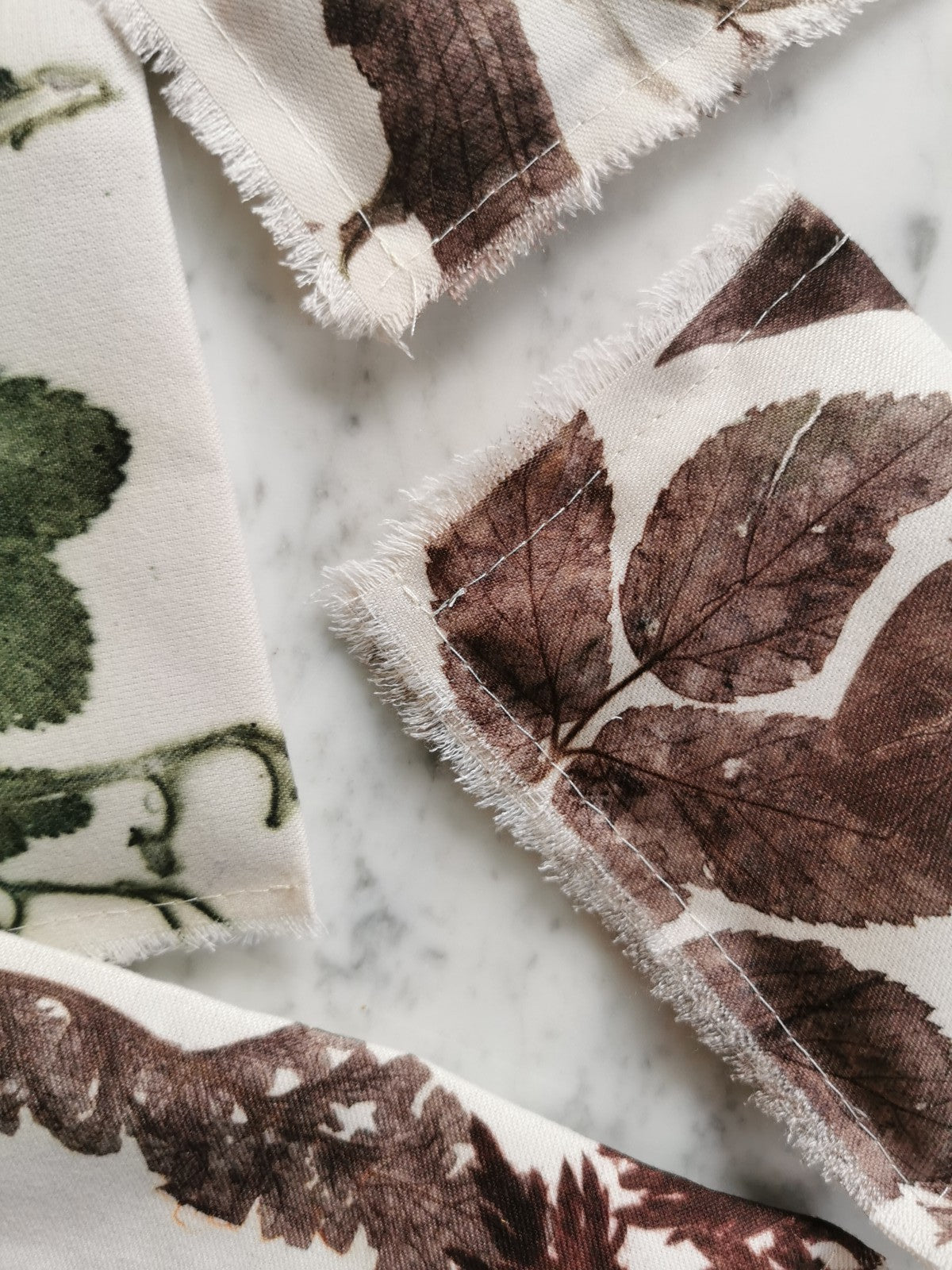 Local plants have been carefully collected, dried, painted and then pressed directly on the fabric which leaves a very precise single edition imprint. All is handmade locally in the studio at Ulriksholm Slot near Kerteminde // Denmark; so there is exclusively one of each piece since the monoprint cannot be duplicated.