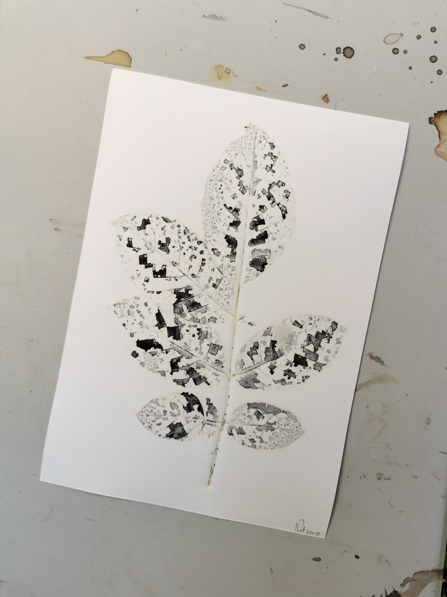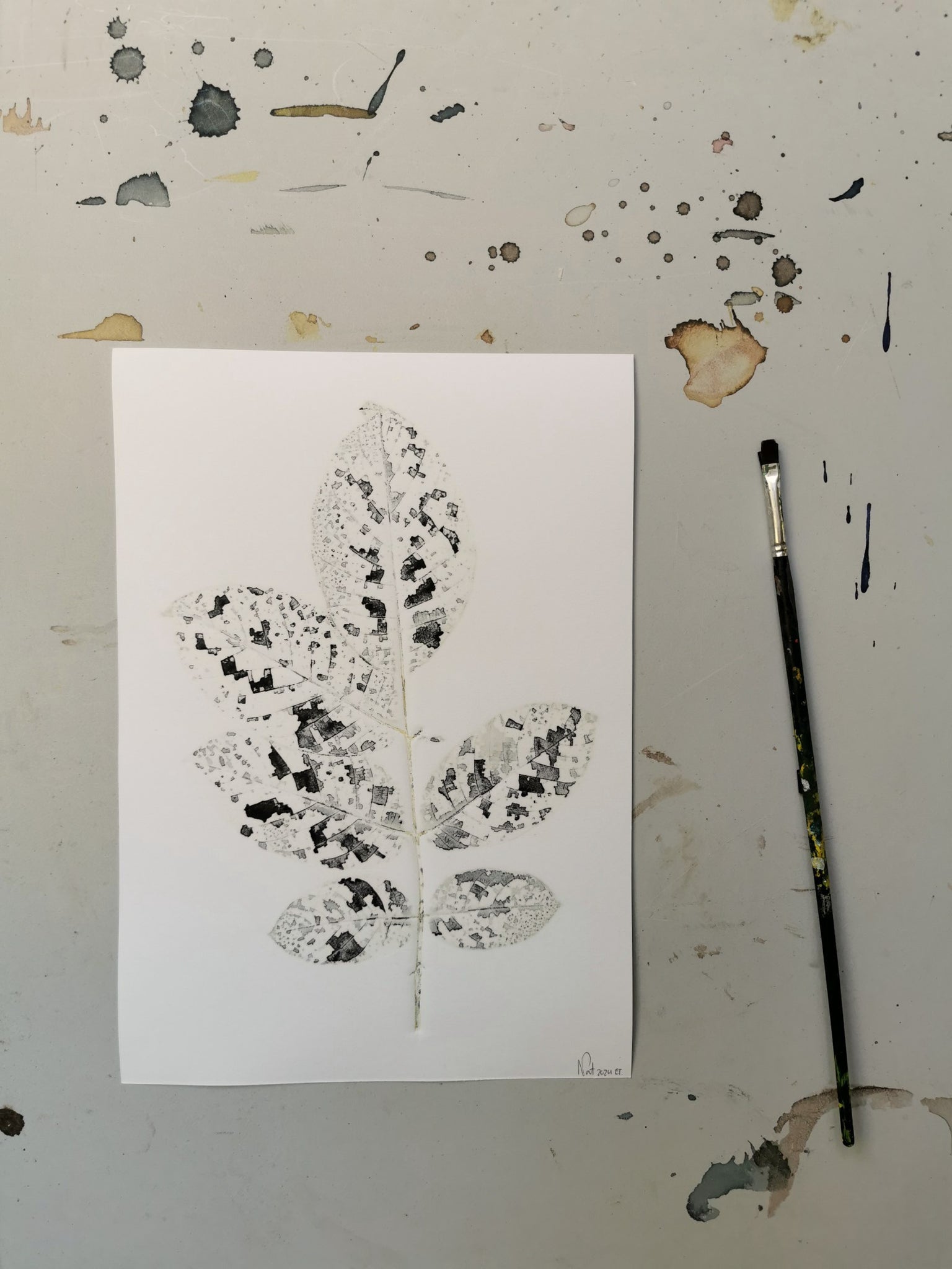 The watercolour paper is used to extract the excess colour from the wild plants used in the textile printing proces, to prevent it from interferring with the next work in the press.