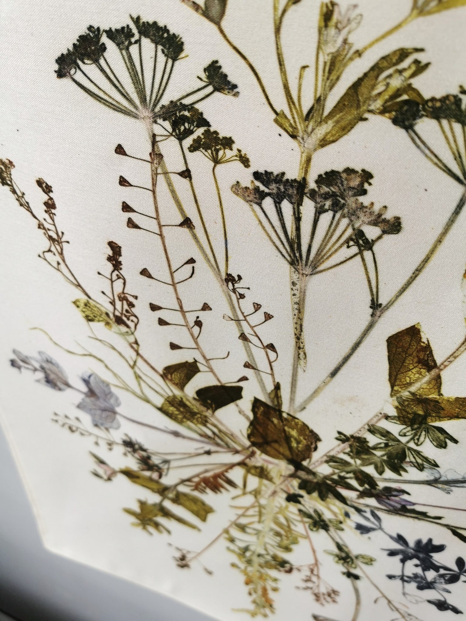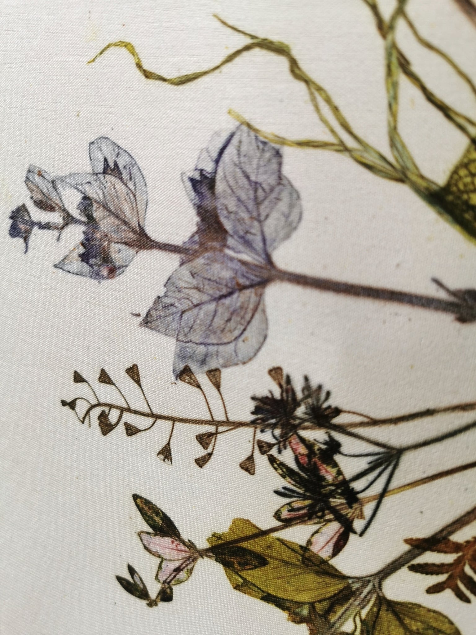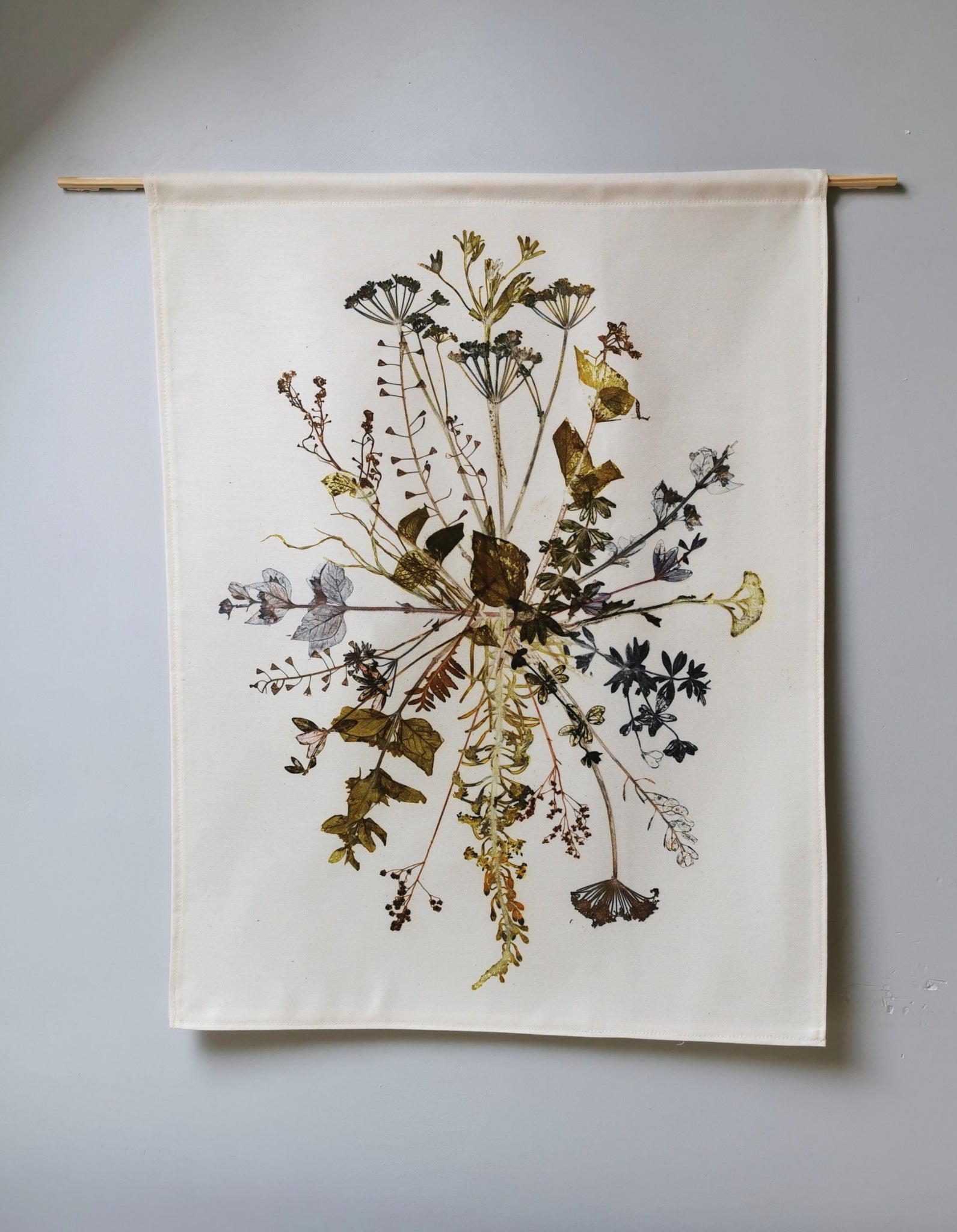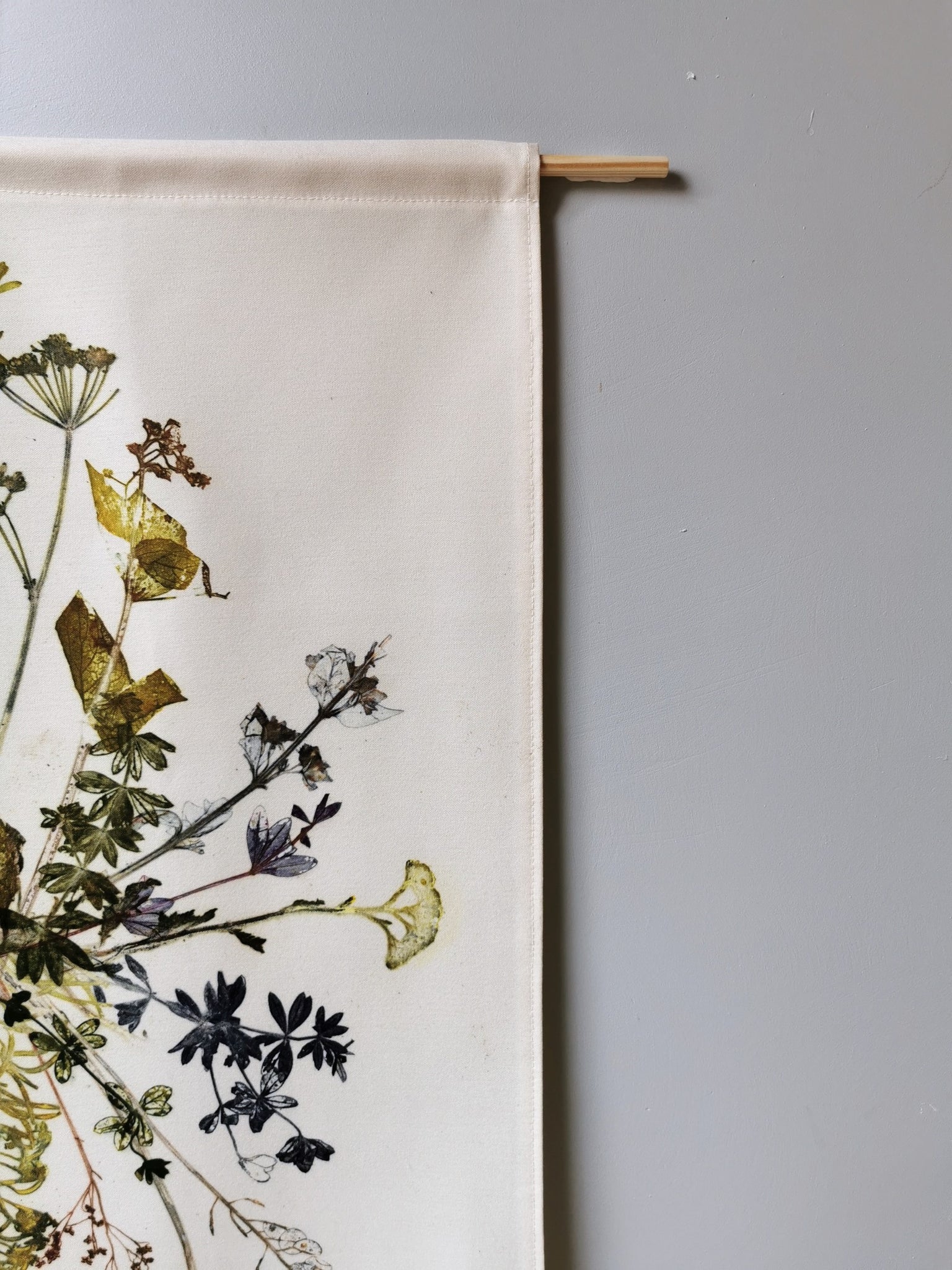 This tapestry is a botanical wall decor piece with an unique floral motif made of wild growing plants that visualize Nature´s biodiversity. The plants have been used directly on the fabric which leaves a very precise imprint.