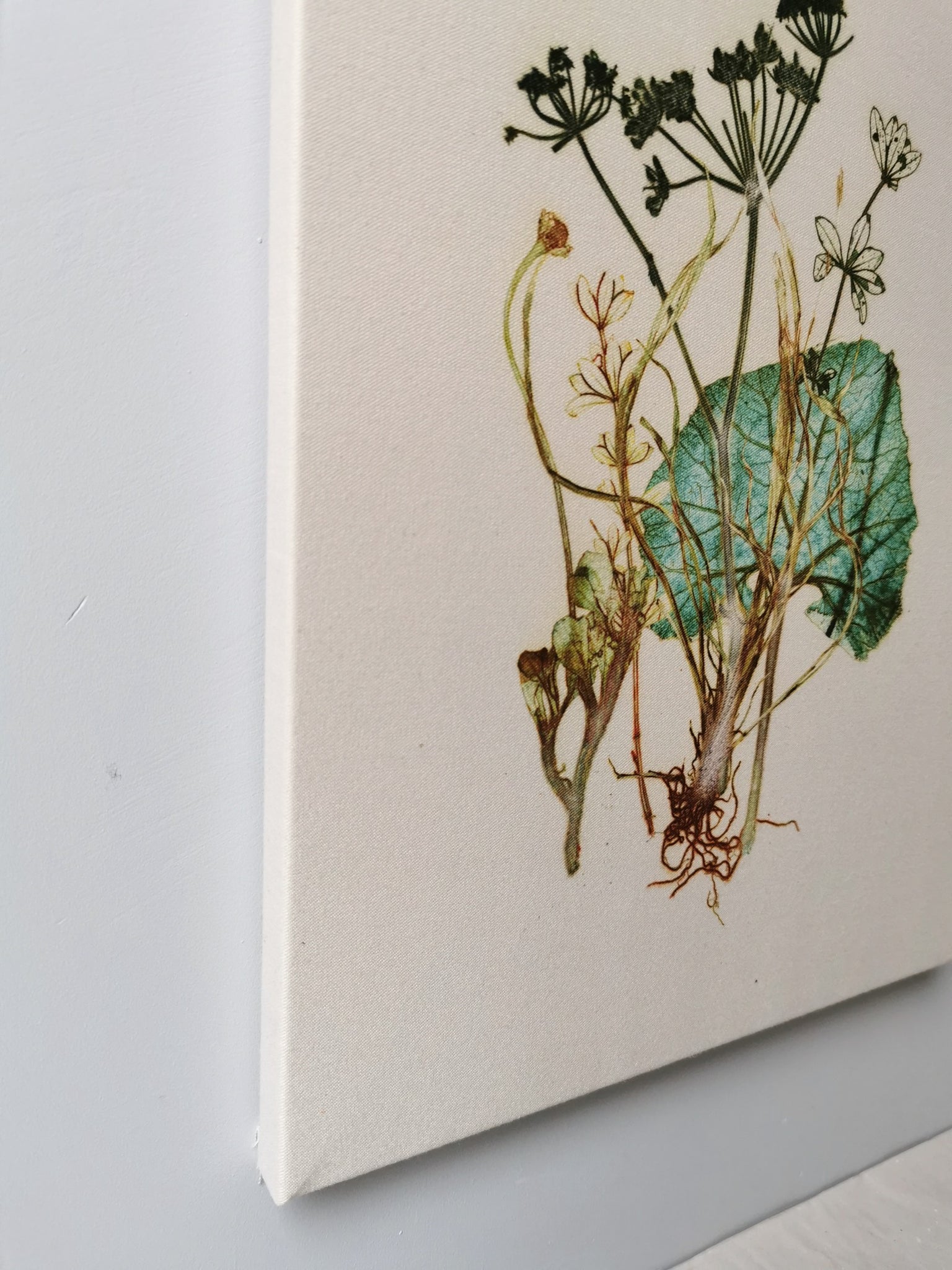 This wall decor is a botanical interior piece with an unique floral motif made of wild growing plants that visualize Nature´s biodiversity. The plants have been used directly on the fabric which leaves a very precise imprint. The fabric has been attached to a wooden frame - locally produced in Denmark.