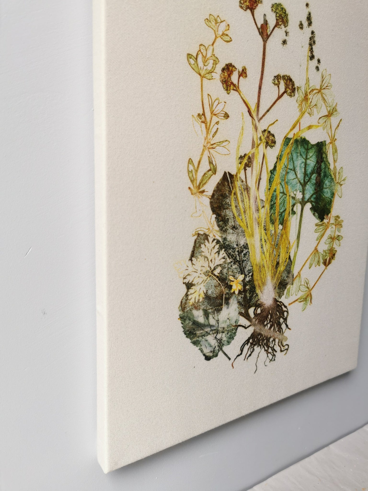 This wall decor is a botanical interior piece with an unique floral motif made of wild growing plants that visualize Nature´s biodiversity. The plants have been used directly on the fabric which leaves a very precise imprint. The fabric has been attached to a wooden frame - locally produced in Denmark.