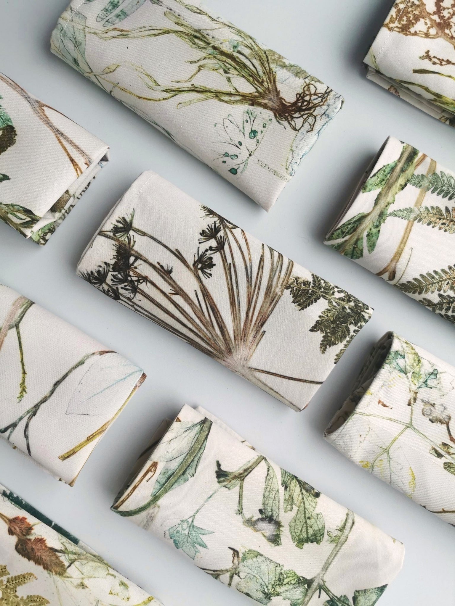 All napkins have an unique plant motif on the front, which is handmade locally in the studio in Denmark; so there is only one of each bag since the print cannot be duplicated.
